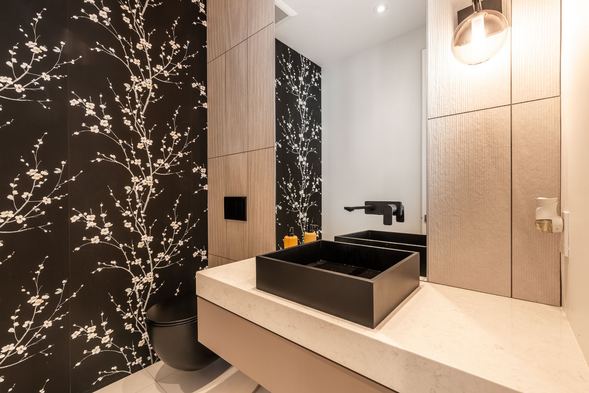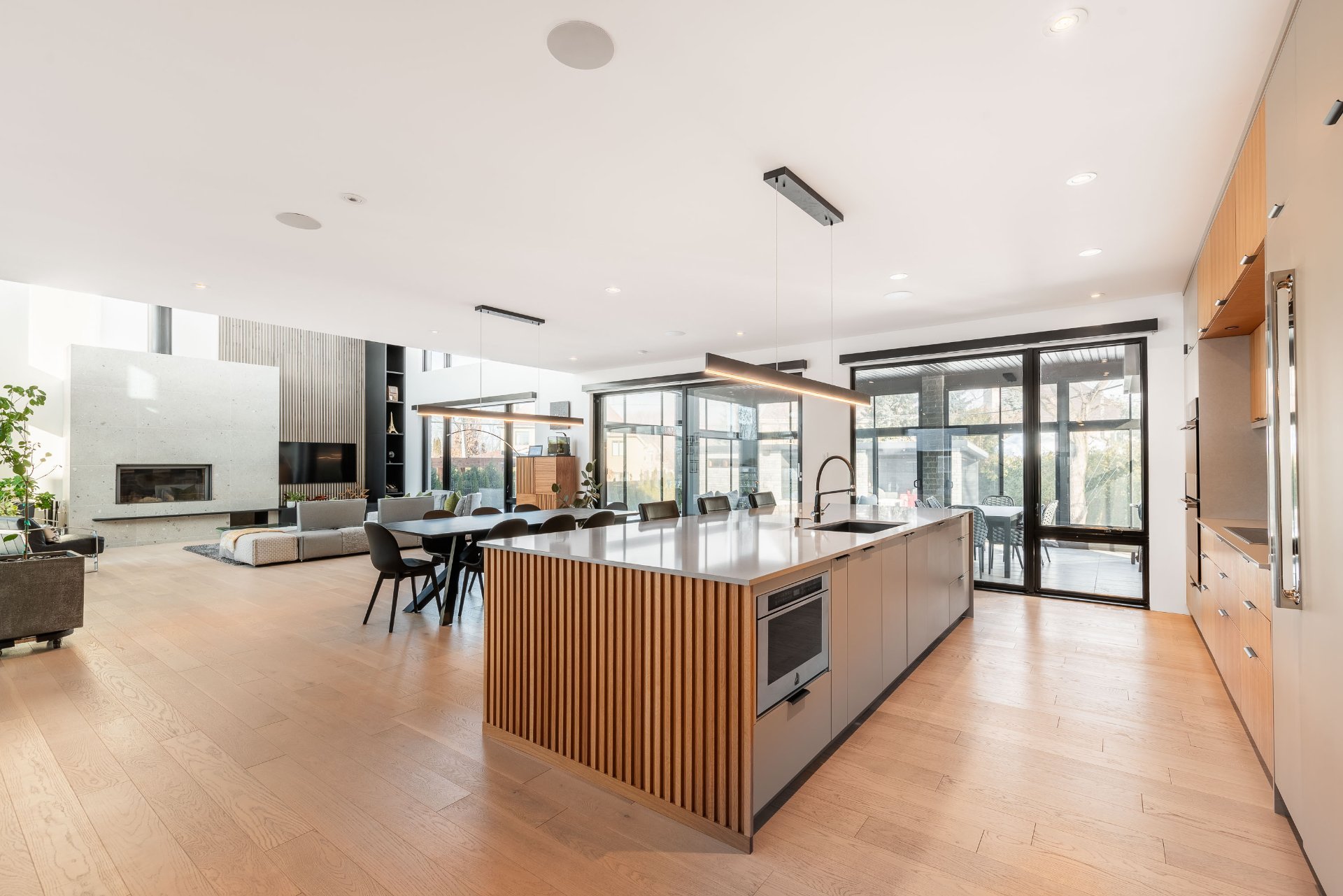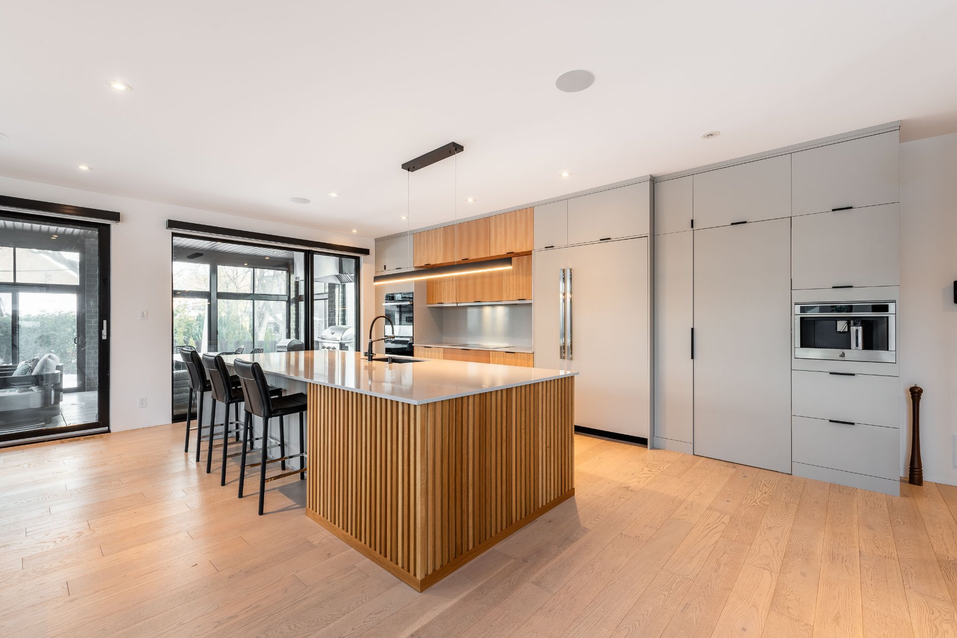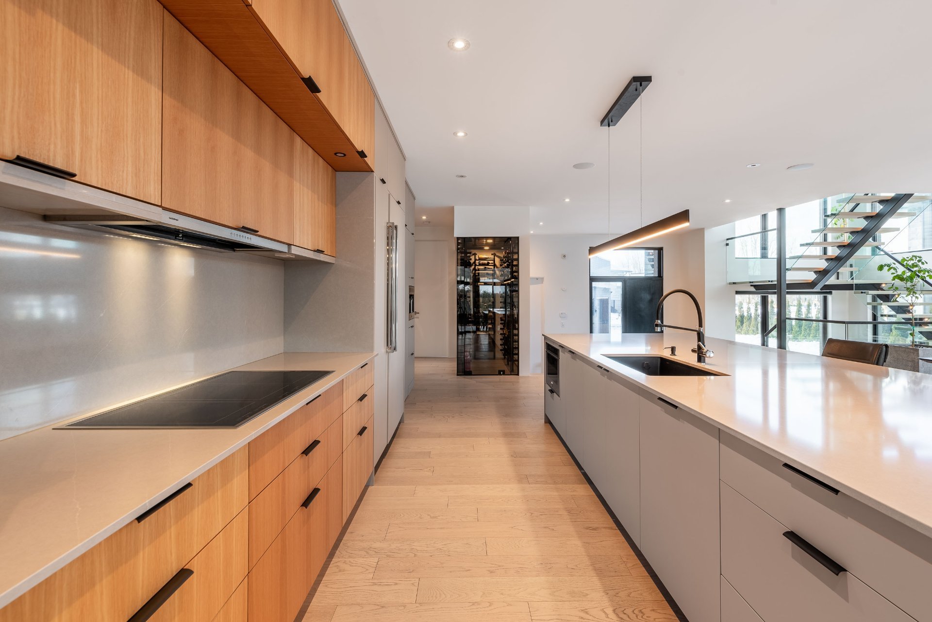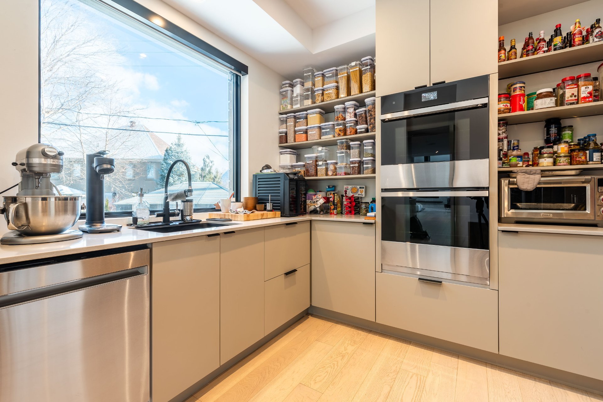 Cuisine moderne et fonctionnelle : grand îlot de 12 pieds, comptoirs en quartz, armoires élégantes deux tons, électroménagers intégrés et walk-in servant de cuisine secondaire.