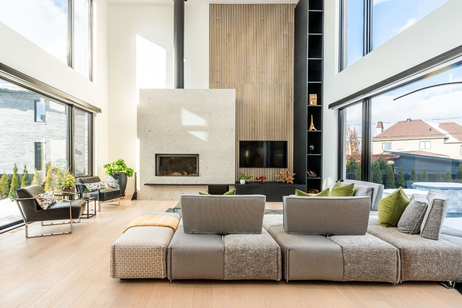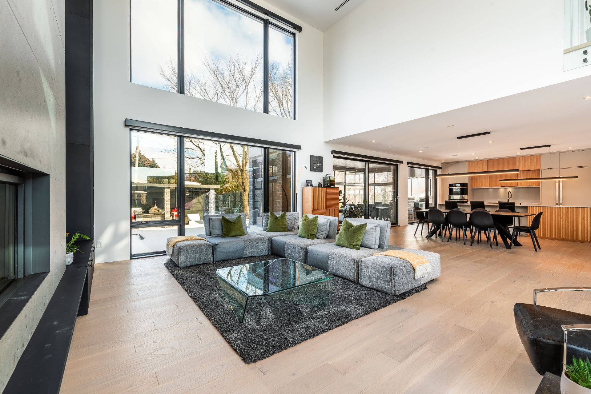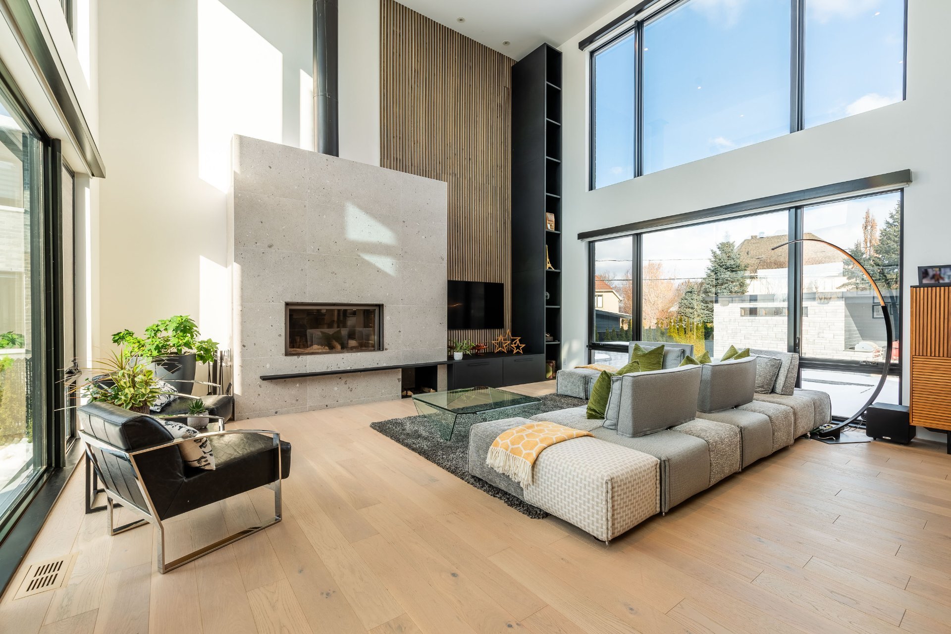 Salon impressionnant avec plafonds de près de 20 pieds, grandes fenêtres pleine hauteur, foyer au bois et finitions haut de gamme.