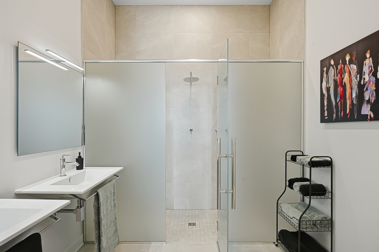 Le penthouse comprend deux véritables suites, chacune dotée de sa salle de bains privée, assurant intimité et confort absolu aux occupants. La suite principale séduit par ses volumes généreux, son ambiance feutrée et son aménagement soigné, créant un véritable refuge au quotidien. La seconde suite, tout aussi élégante, convient parfaitement à des invités, à un membre de la famille ou à un espace bureau.