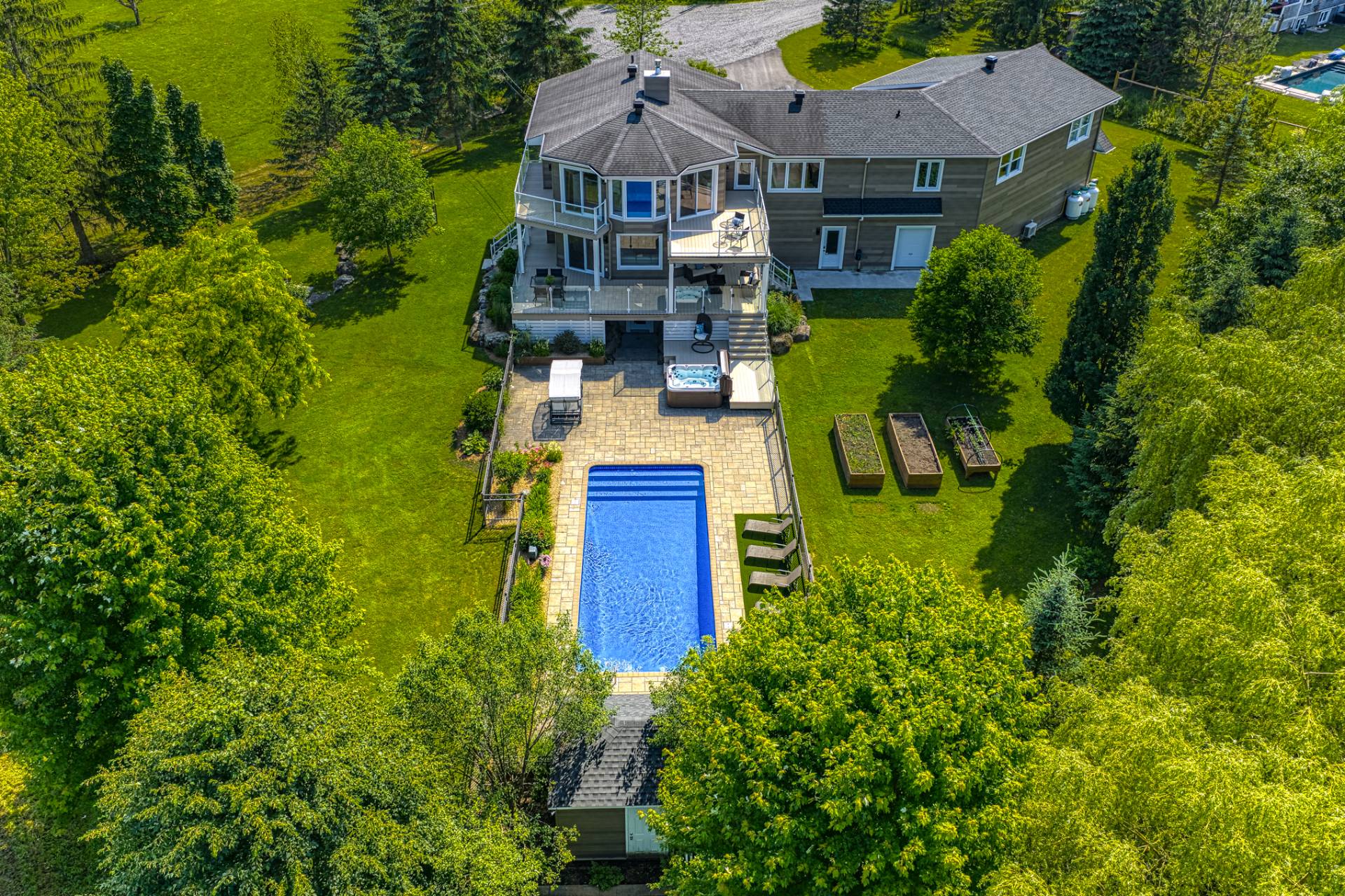 La cour arrière propose une belle grande piscine creusée de 13x32 pieds, chauffée et traitée au sel. Cette dernière est clôturée et propose de beaux espaces de relaxation. Le terrain a été aménagé avec soin, proposant des arbres aux différentes essences et de beaux jardins fleuris. Les terrasses sont nombreuses, on a l'embarras du choix pour se détendre à l'extérieur ou passer du temps entre amis!