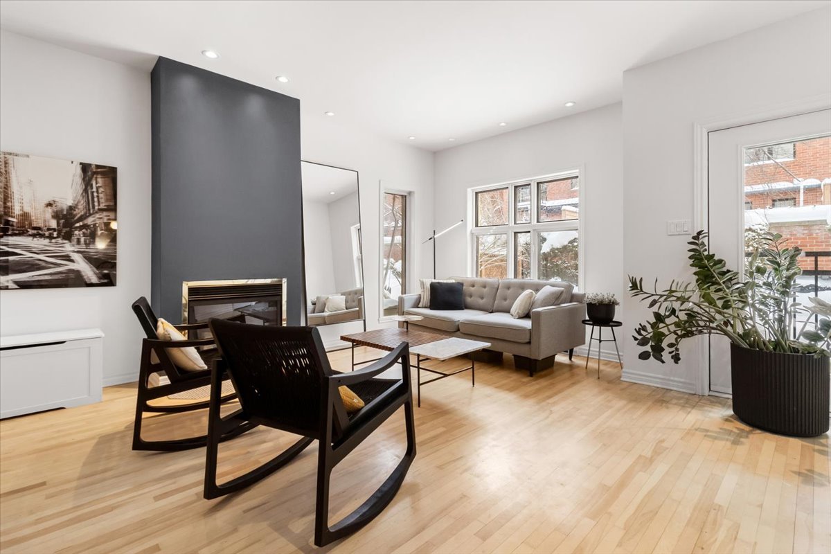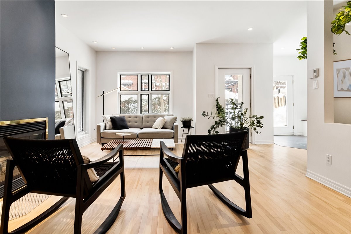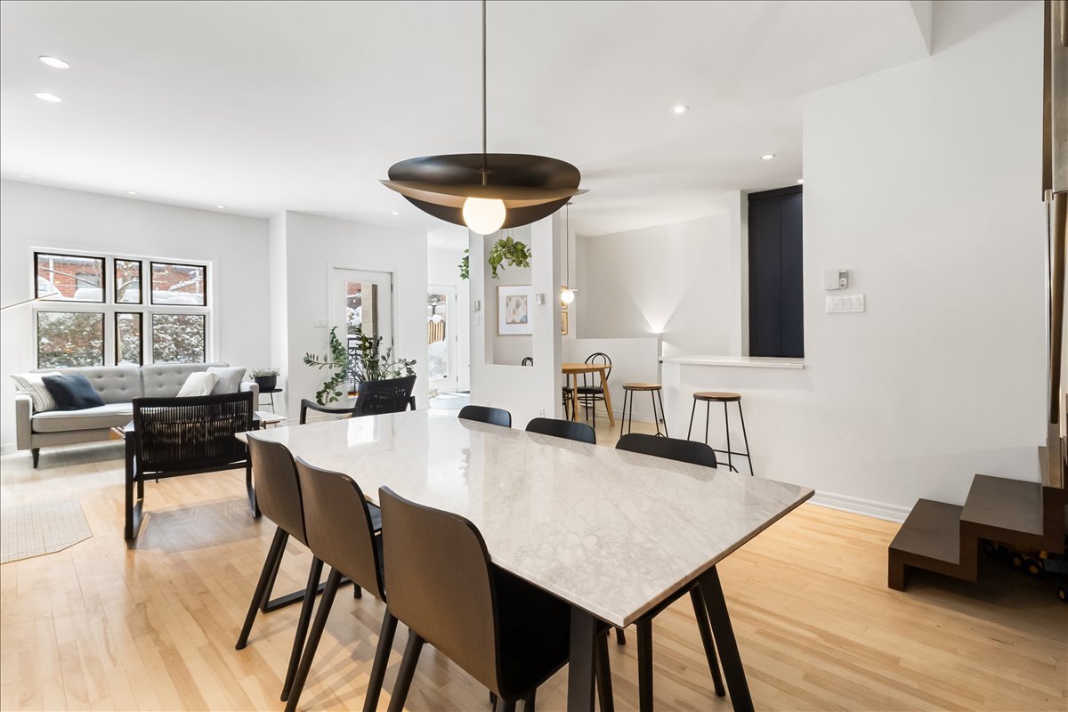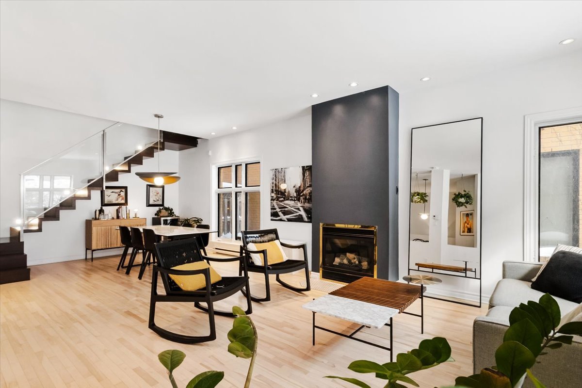 Au rez-de-chaussée, l'aire ouverte rassemble salon, salle à manger et cuisine rénovée. Les comptoirs de quartz, le coin repas et le foyer au gaz donnent un espace fonctionnel et chaleureux, complété par une salle d'eau.