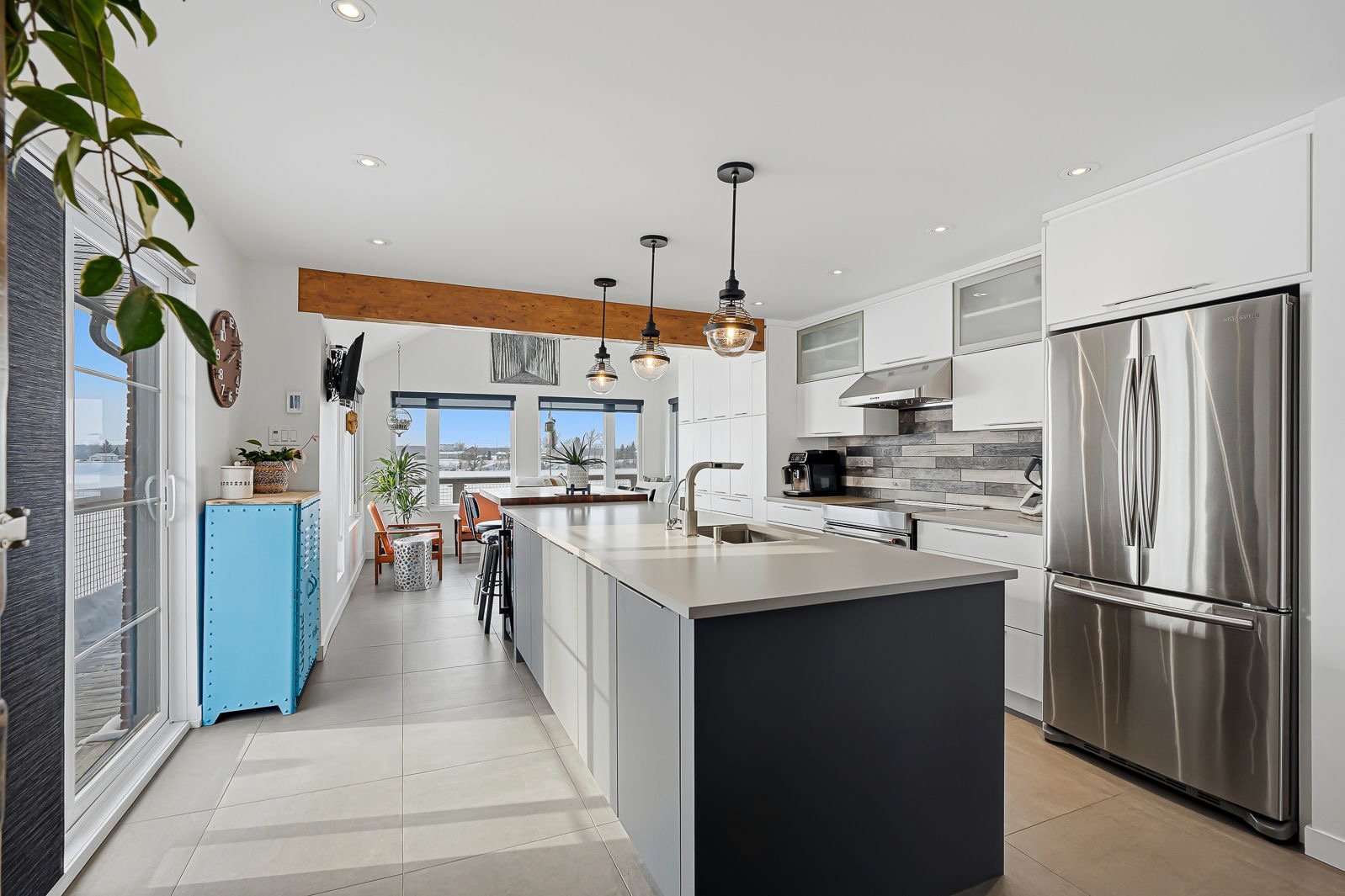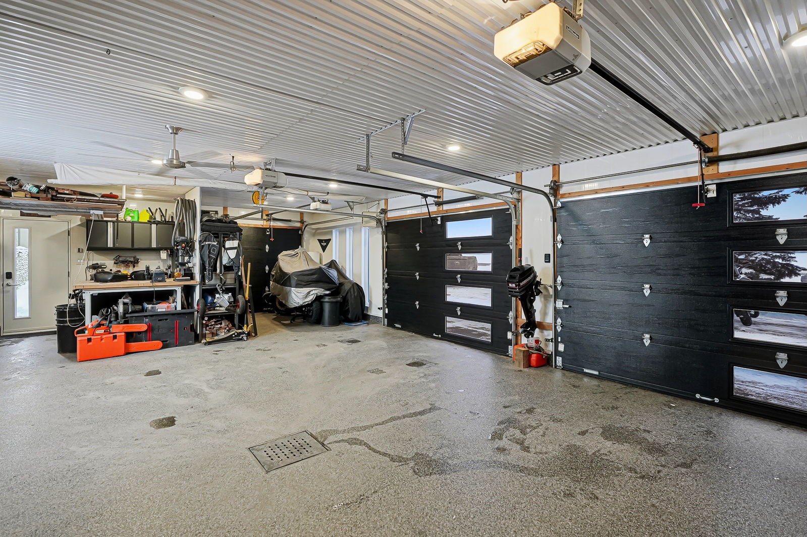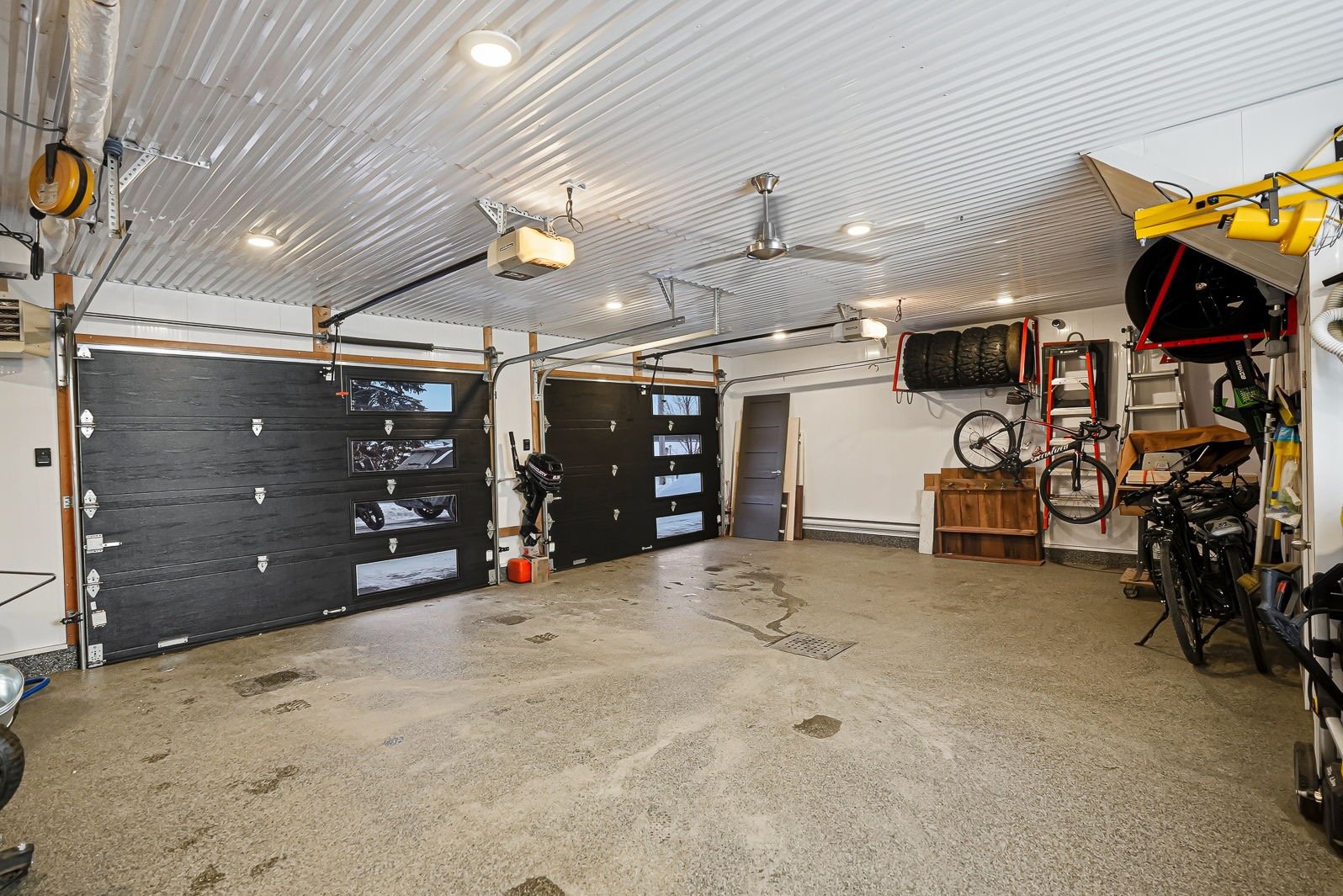 - Évier en acier inoxydable dans le garage, îlot central dans le garage, coffres et étagères de rangement dans le garage, table de billard et son luminaire dans l'espace de vie au-dessus du garage, frigo Samsung, cuisinière Kitchenaid, lave-vaisselle BOSCH, télé Toshiba dans la cuisine, cellier Cell'R, foyer électrique Napoléon dans le salon
