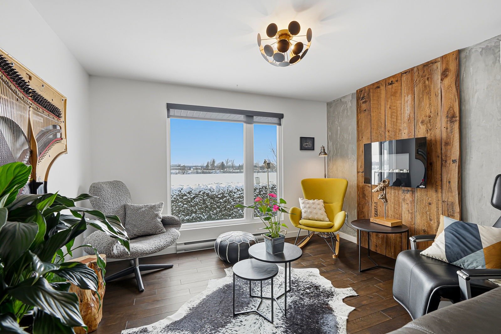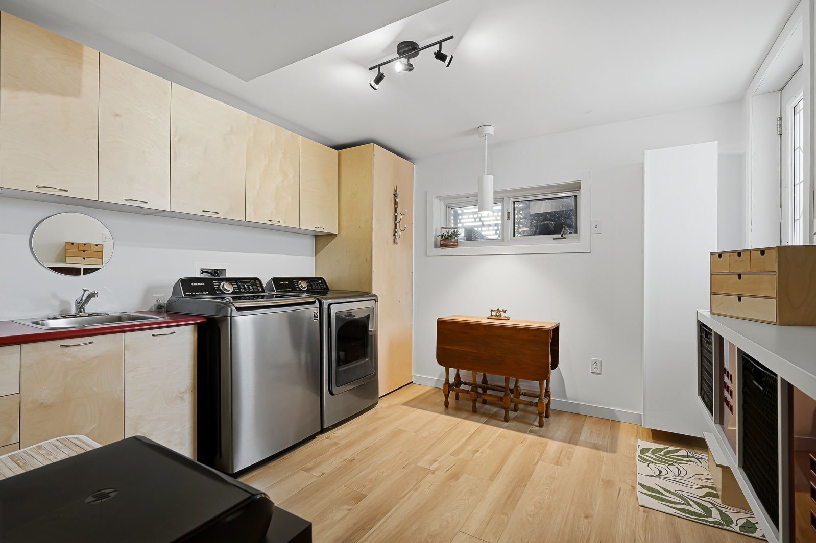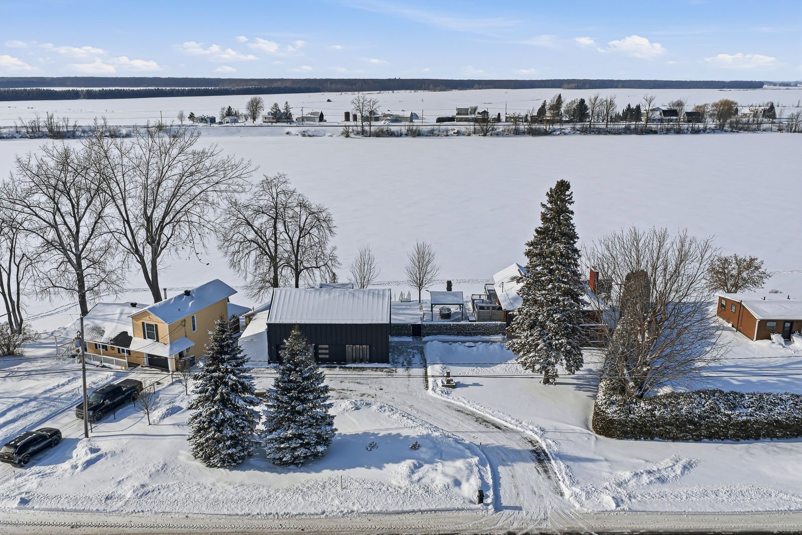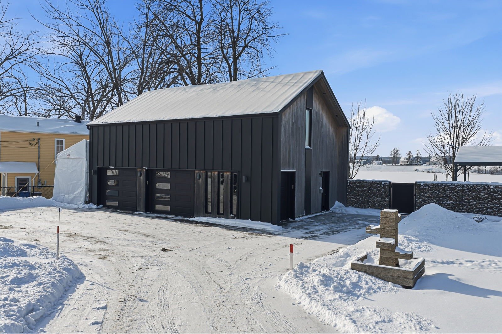 - Évier en acier inoxydable dans le garage, îlot central dans le garage, coffres et étagères de rangement dans le garage, table de billard et son luminaire dans l'espace de vie au-dessus du garage, frigo Samsung, cuisinière Kitchenaid, lave-vaisselle BOSCH, télé Toshiba dans la cuisine, cellier Cell'R, foyer électrique Napoléon dans le salon