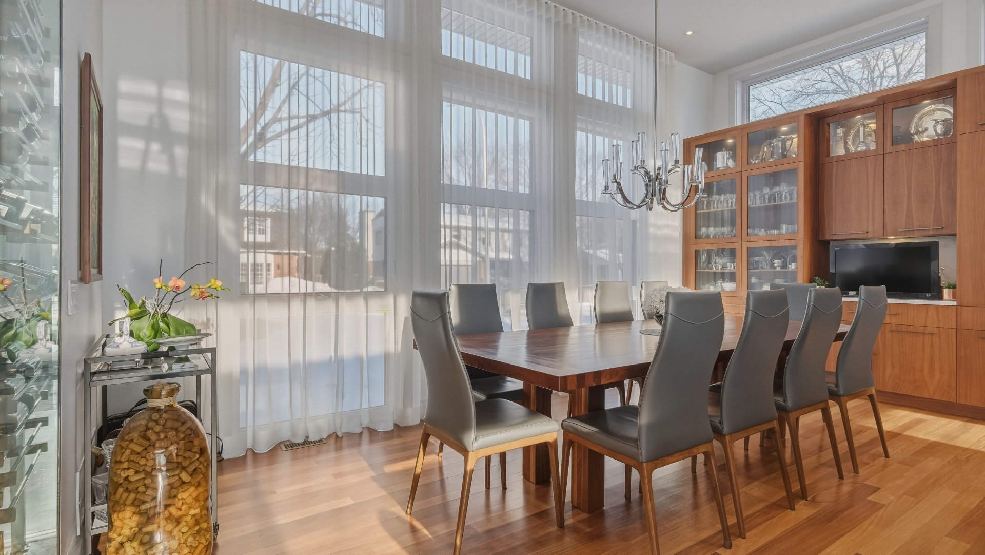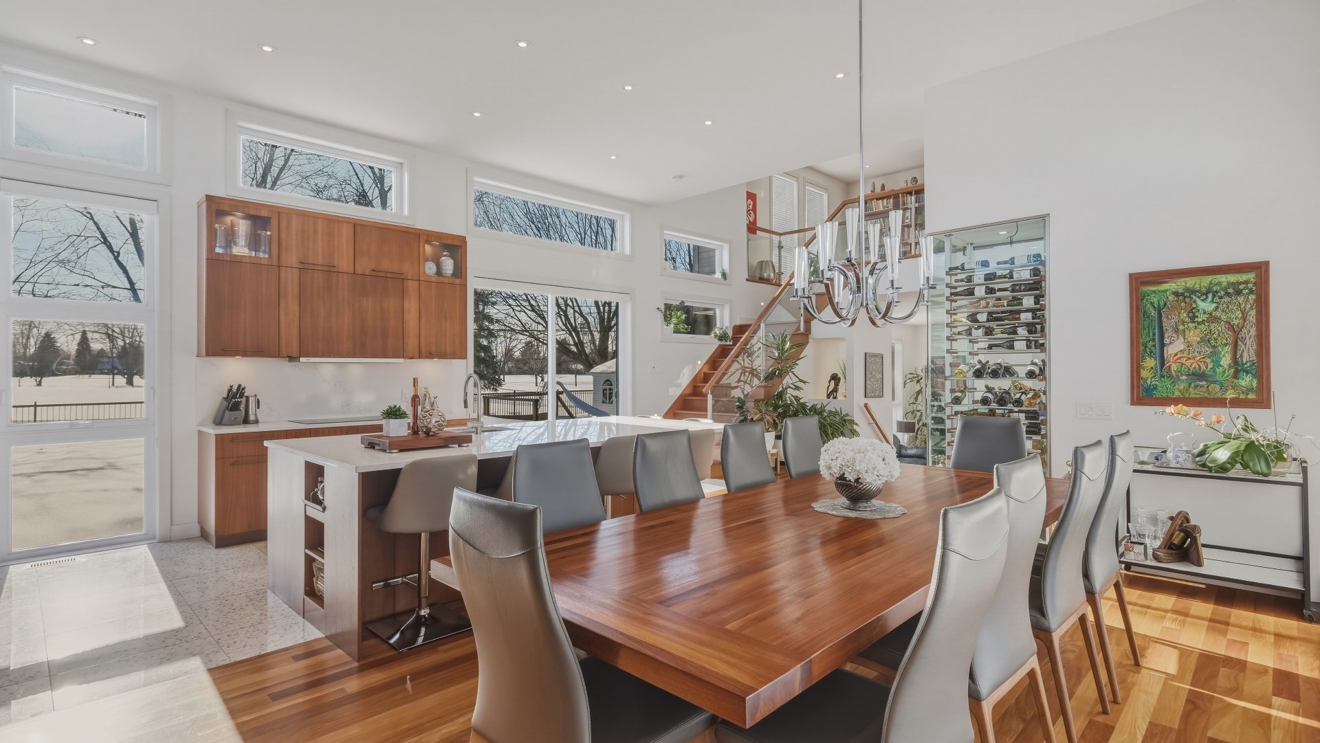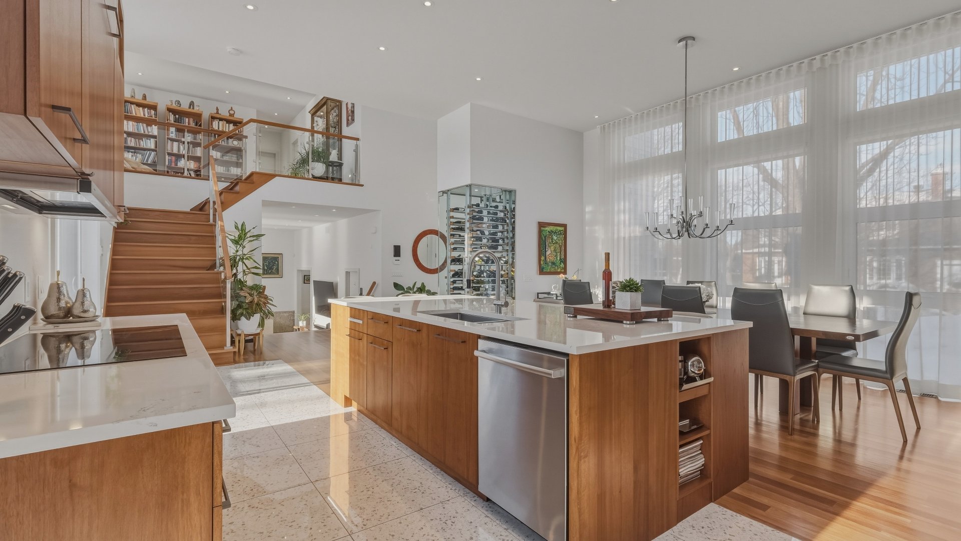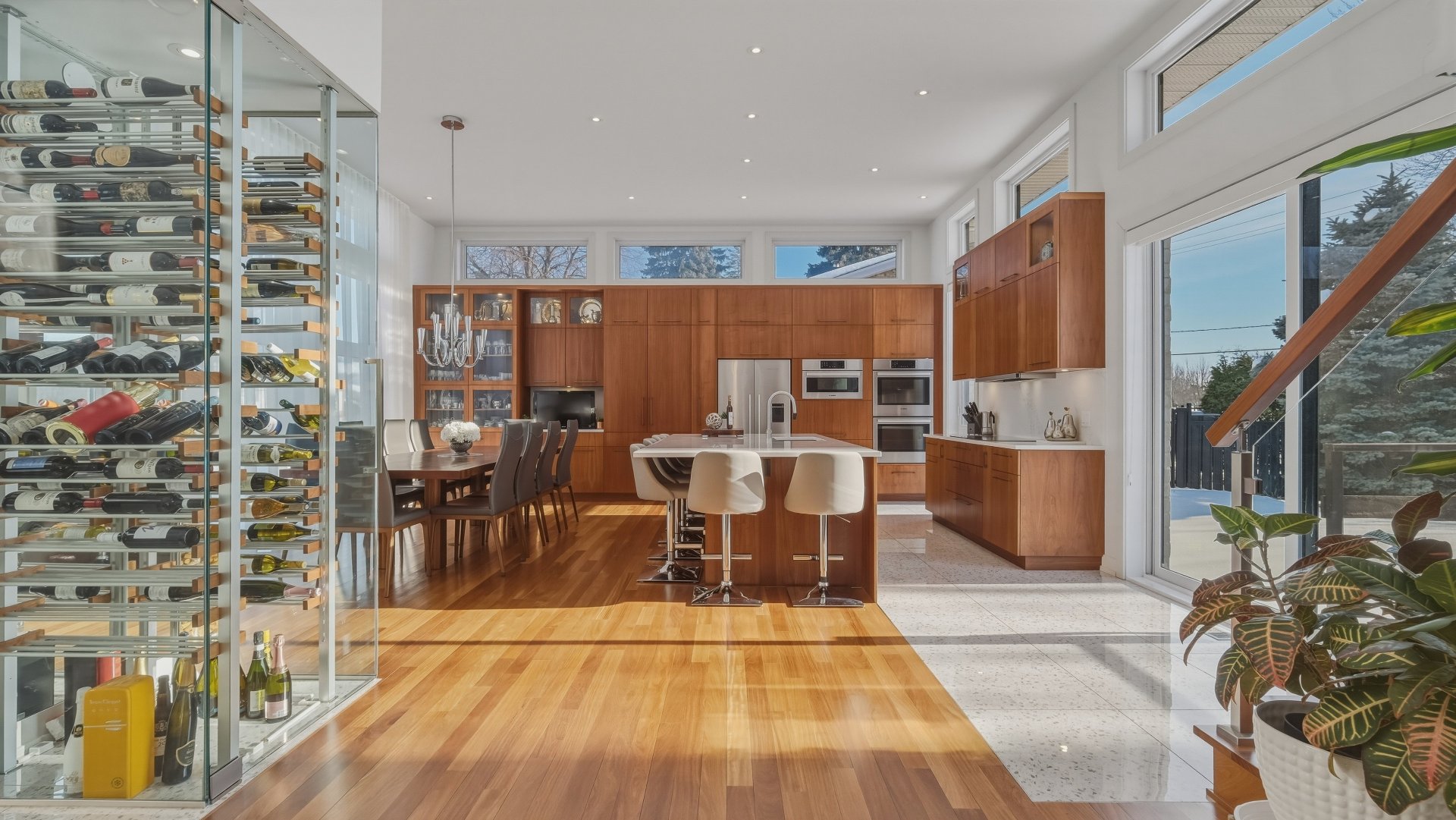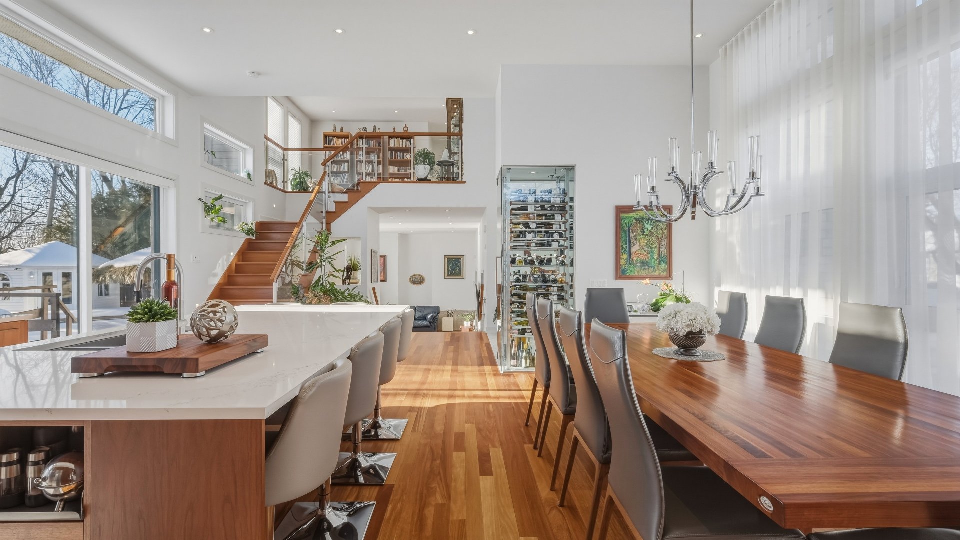 La cuisine, pensée pour recevoir, marie élégance et convivialité avec ses armoires en bois de noyer, ses comptoirs de quartz et son design intemporel. Elle s'ouvre sur la salle à manger où la hauteur sous plafond, la lumière naturelle abondante et les planchers exotiques en Cumaru créent une atmosphère spectaculaire. Un cellier vitré d'envergure complète cet espace distinctif.