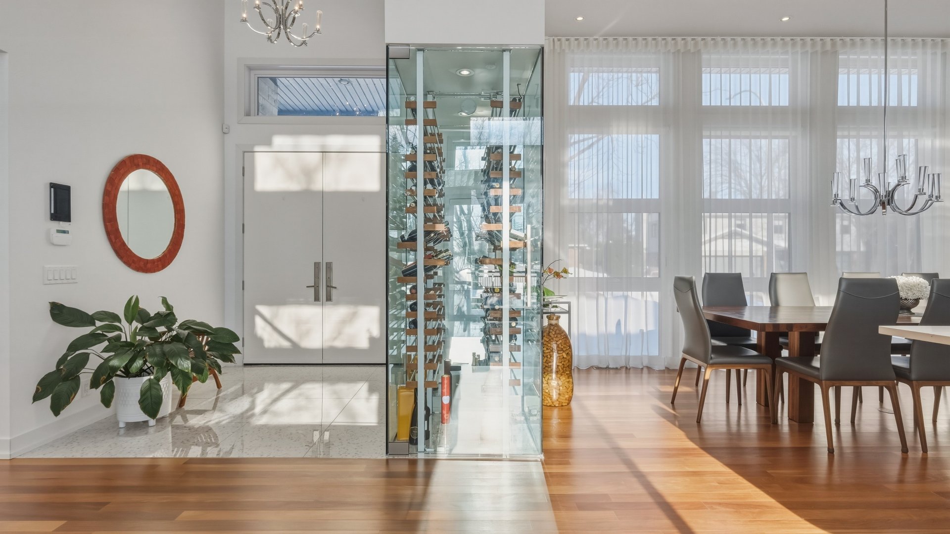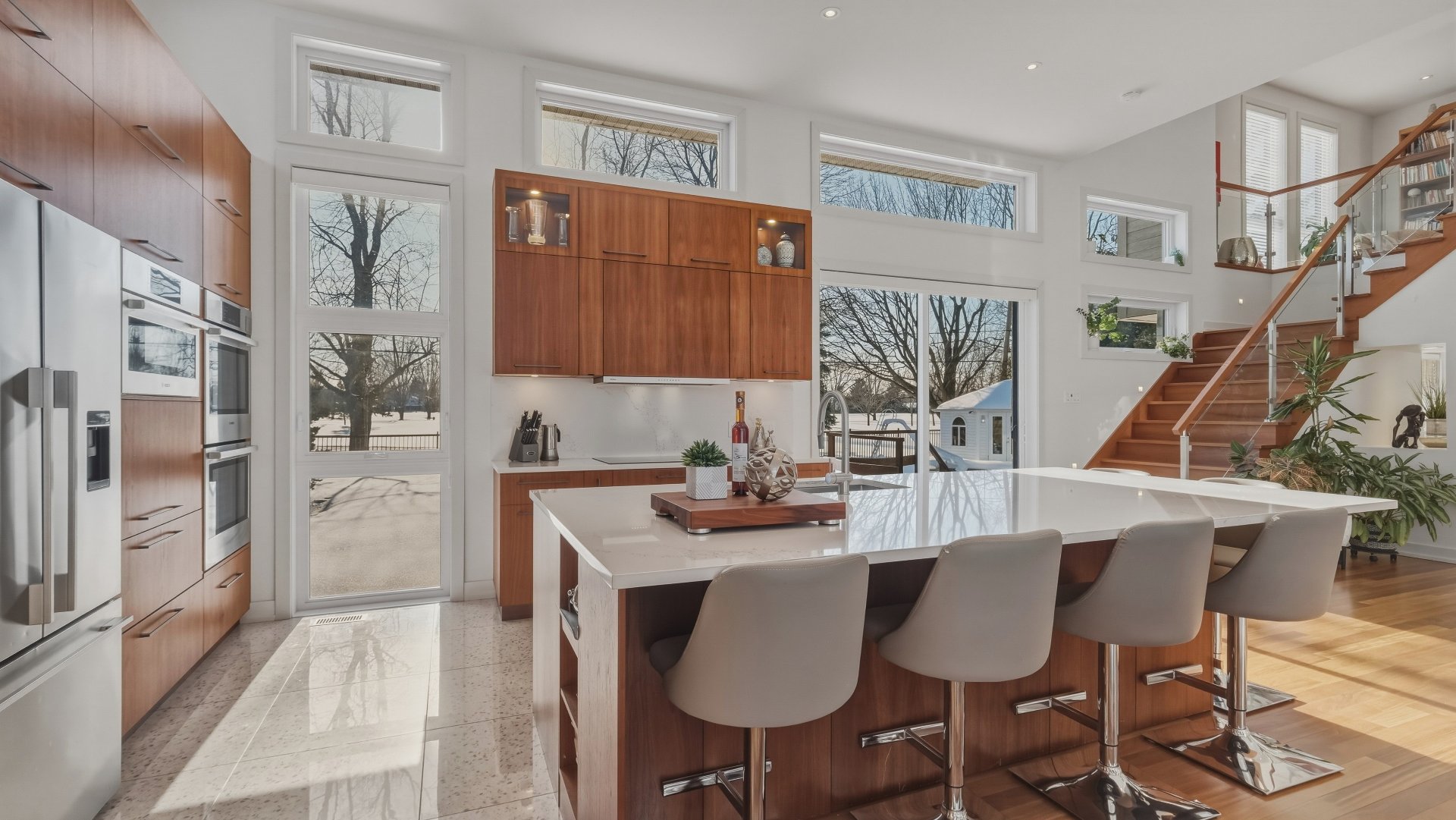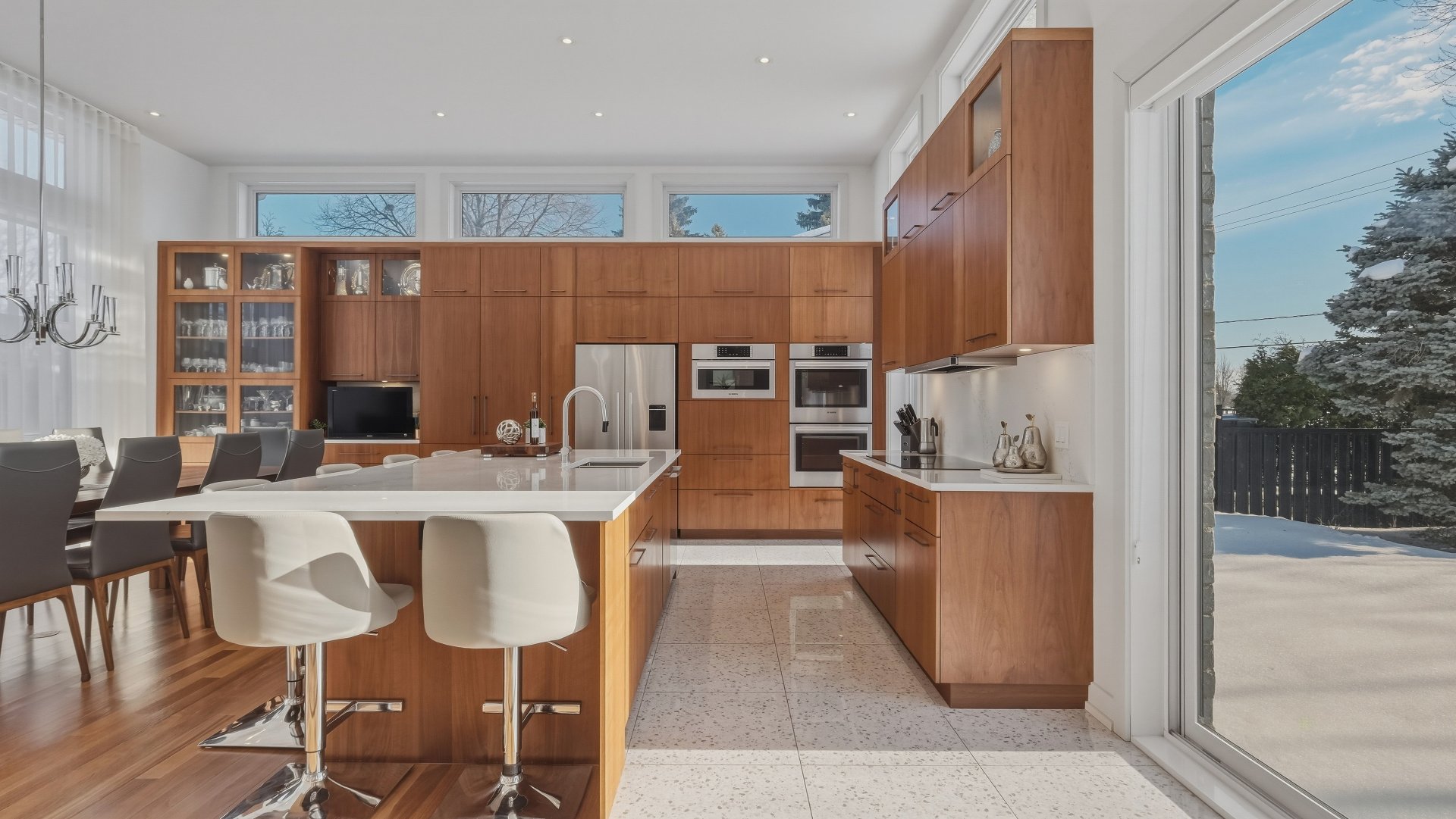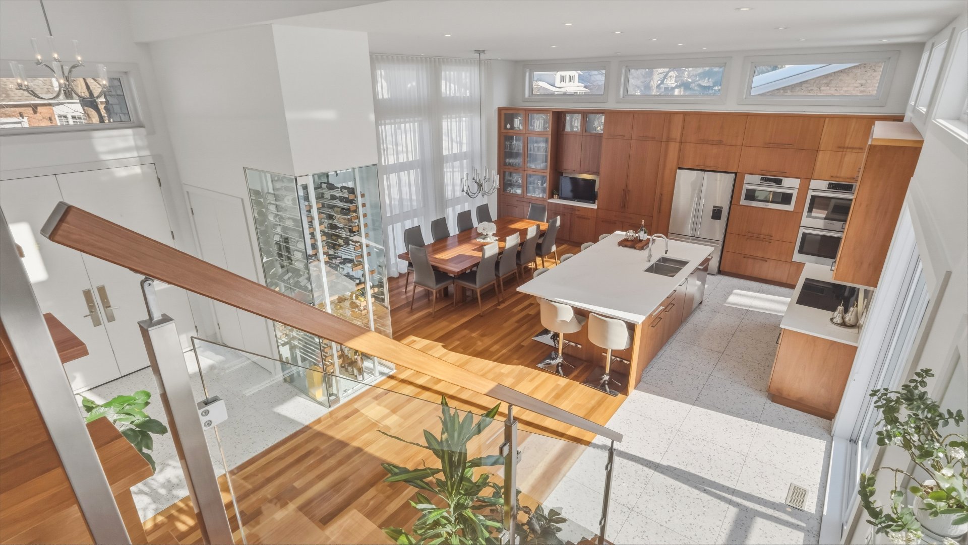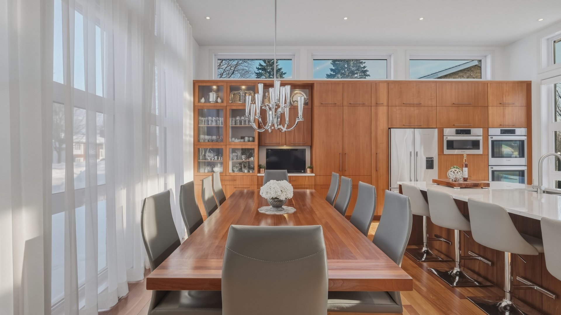 La cuisine, pensée pour recevoir, marie élégance et convivialité avec ses armoires en bois de noyer, ses comptoirs de quartz et son design intemporel. Elle s'ouvre sur la salle à manger où la hauteur sous plafond, la lumière naturelle abondante et les planchers exotiques en Cumaru créent une atmosphère spectaculaire. Un cellier vitré d'envergure complète cet espace distinctif.