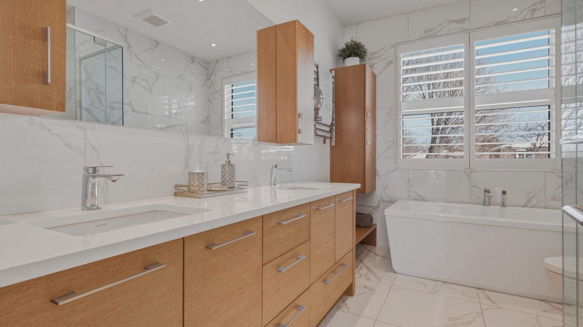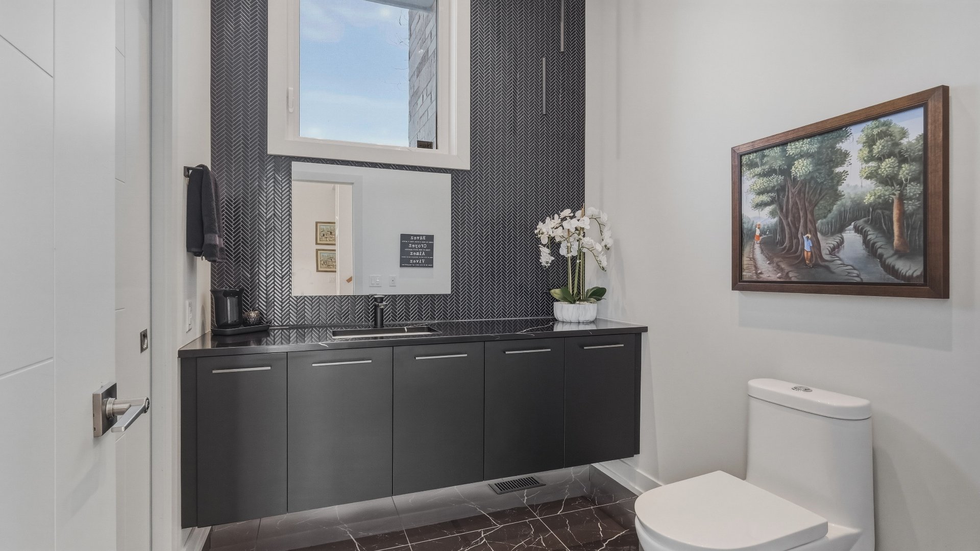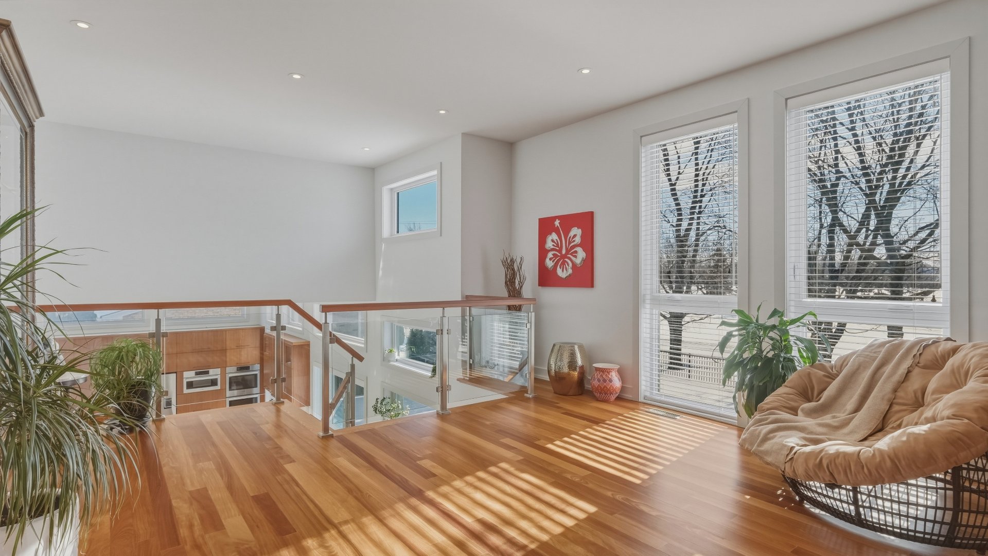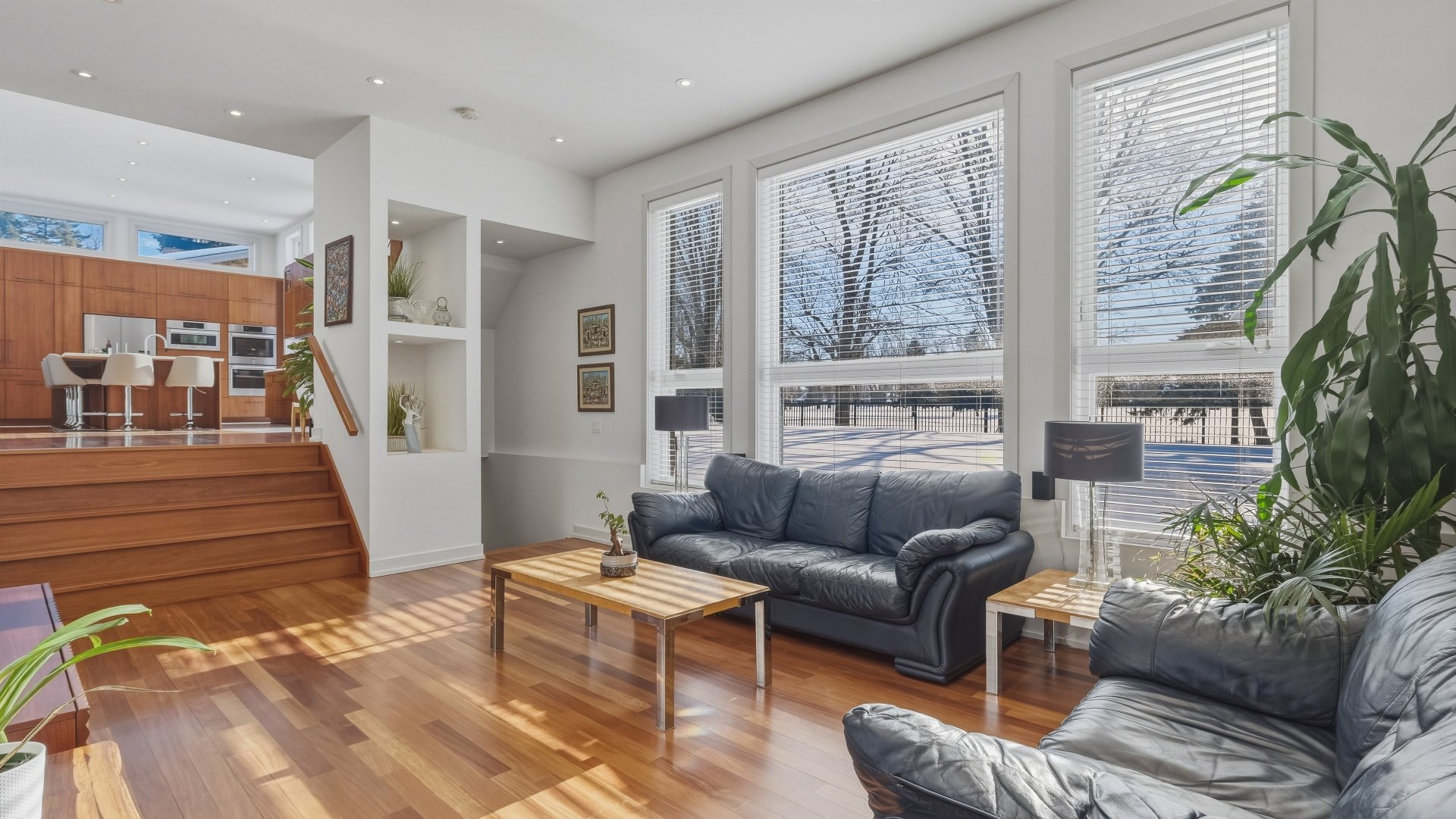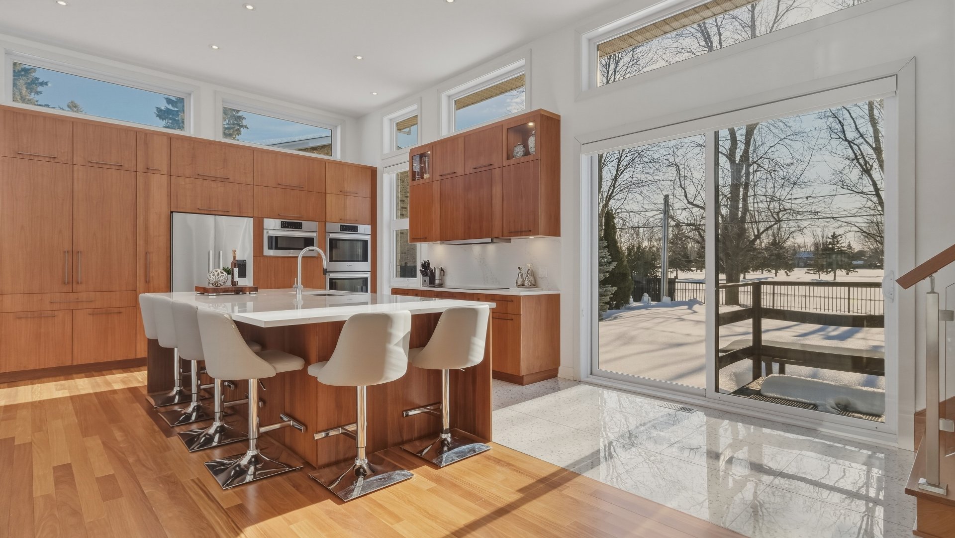 La cuisine, pensée pour recevoir, marie élégance et convivialité avec ses armoires en bois de noyer, ses comptoirs de quartz et son design intemporel. Elle s'ouvre sur la salle à manger où la hauteur sous plafond, la lumière naturelle abondante et les planchers exotiques en Cumaru créent une atmosphère spectaculaire. Un cellier vitré d'envergure complète cet espace distinctif.