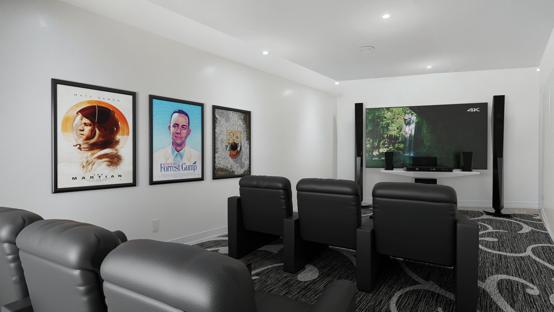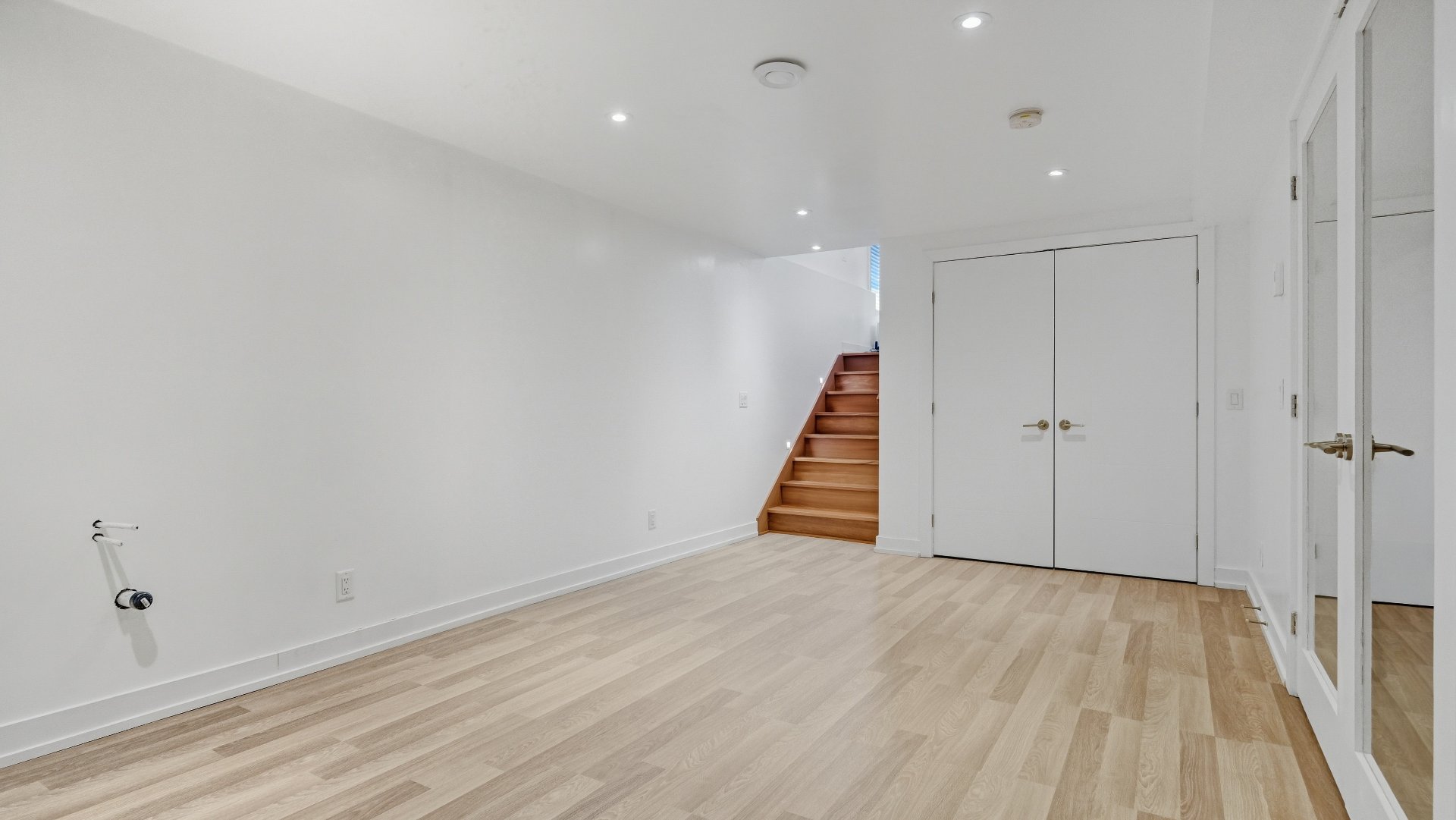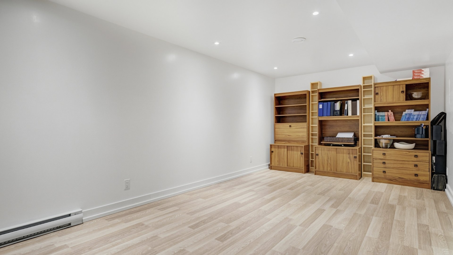 Salle familiale ou cinéma maison fermée par portes vitrées doubles, boudoir ou salle de jeux, chambre additionnelle, ainsi qu'une salle mécanique avec espace de rangement (dalle structurale, hauteur réduite).