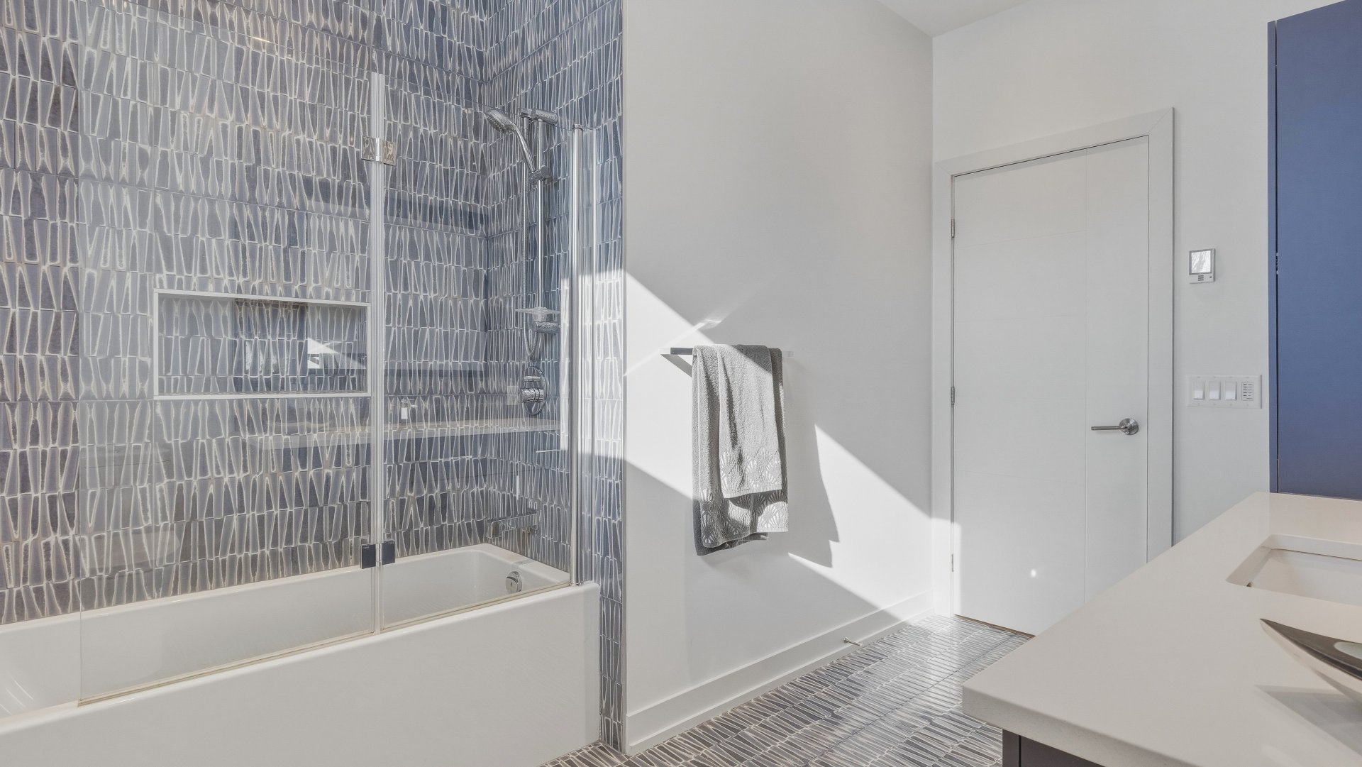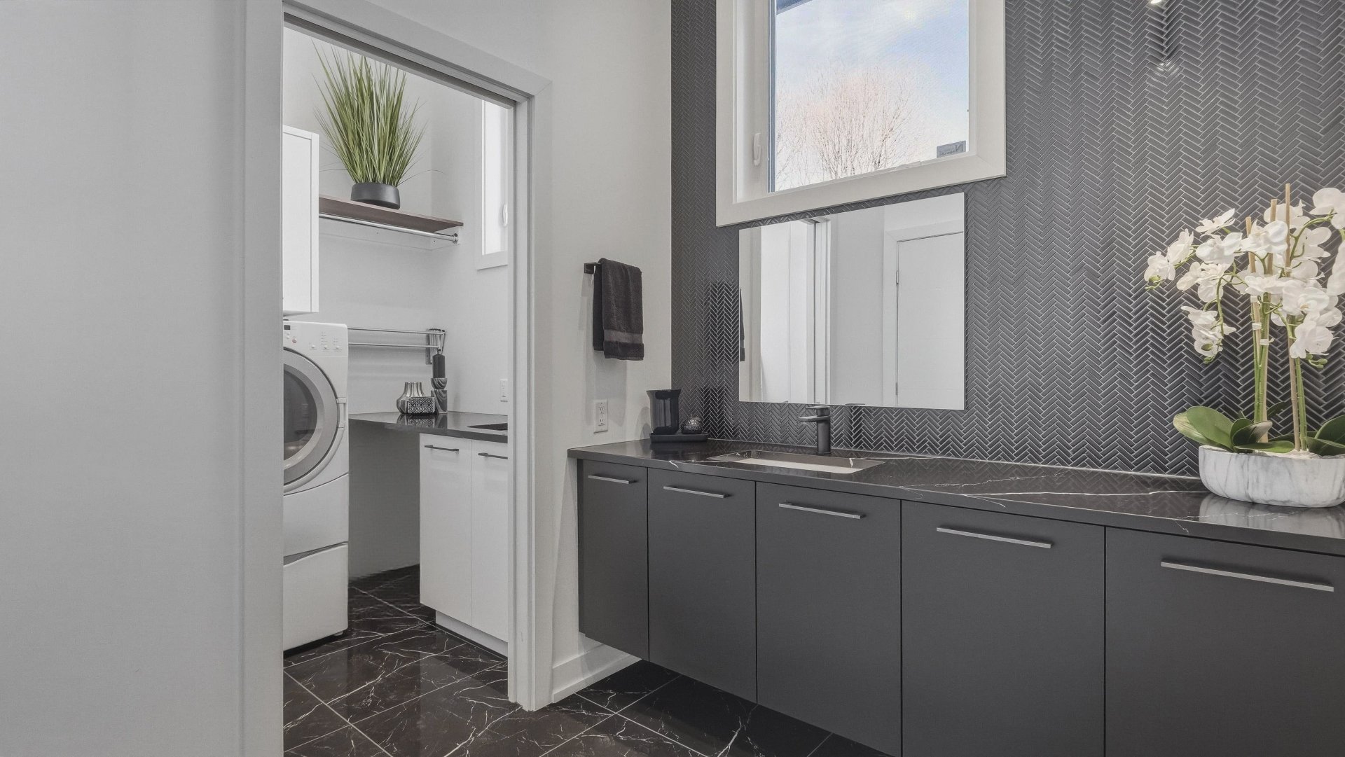 Salle d'eau élégante avec comptoir de quartz ainsi qu'une salle de lavage entièrement aménagée avec armoires, comptoir et cuve.