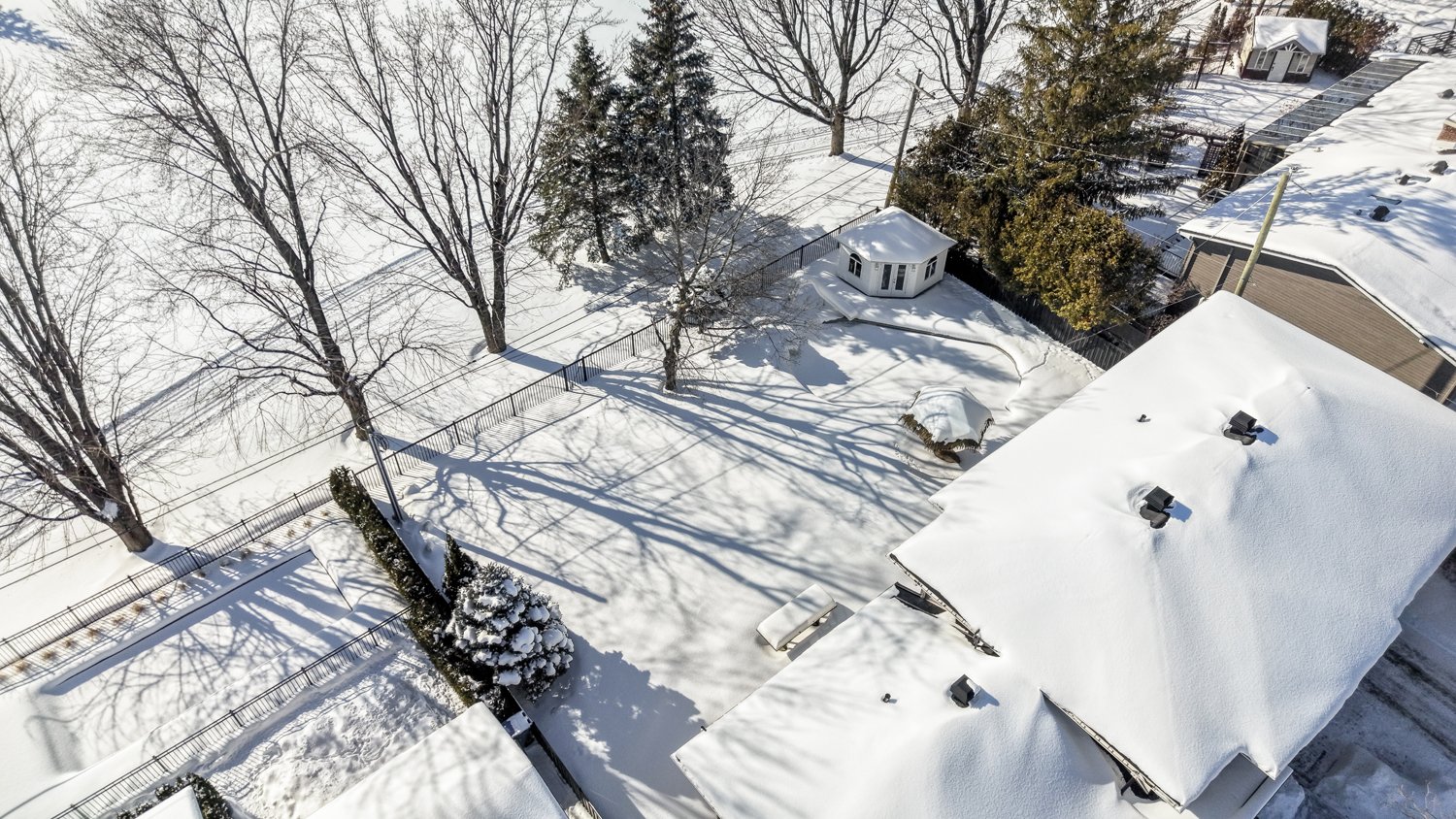 - Luminaires, stores, rideaux, aspirateur central avec acc., réfrigérateur, lave-vaisselle, plaque à induction, hotte, 3 fours encastrés, cellier en verre, chauffe serviette, ouvre-porte de garage électrique, borne électrique, thermopompe de piscine chauffée avec panneau solaire, acc. de piscine, système d'alarme, caméras de surveillance.