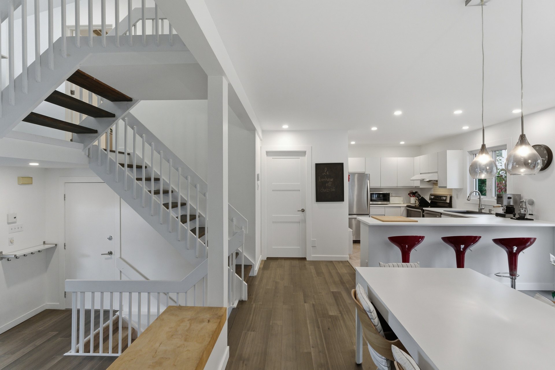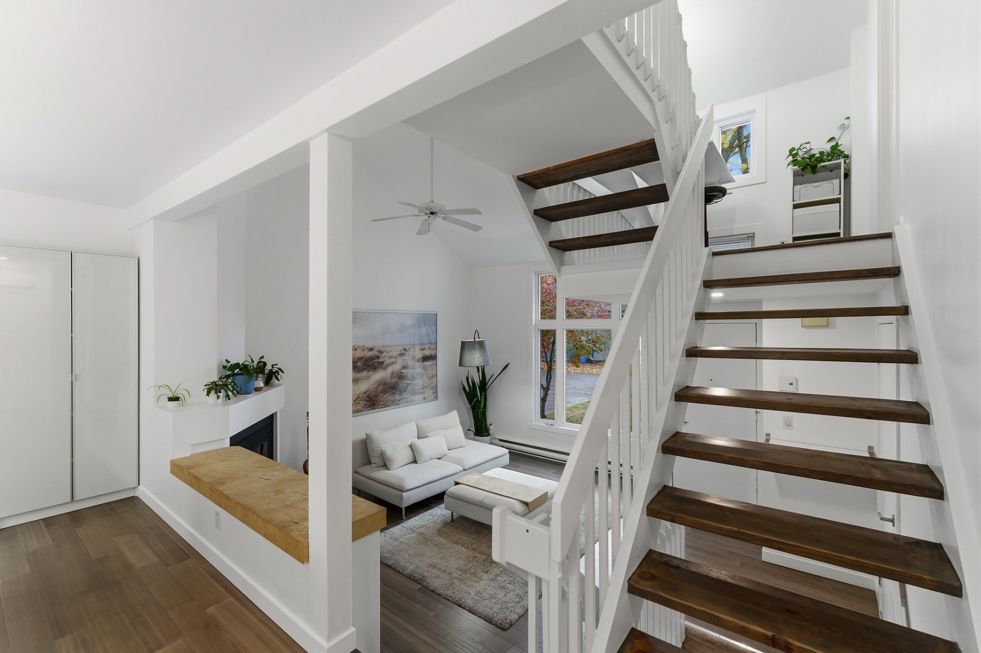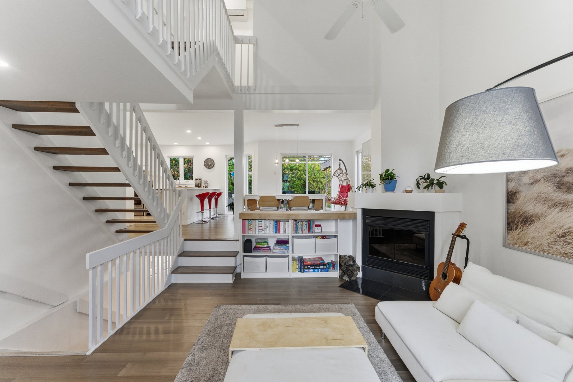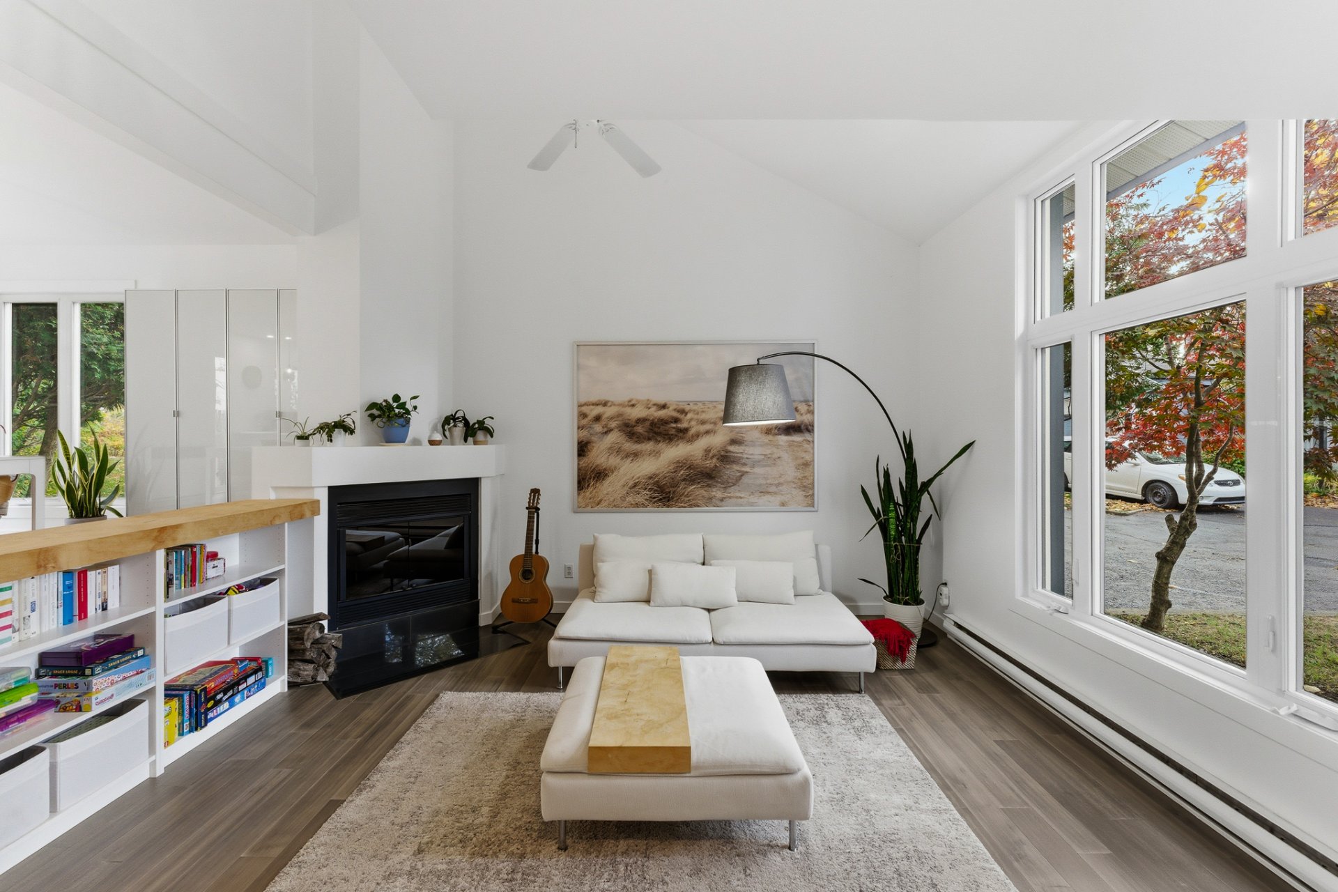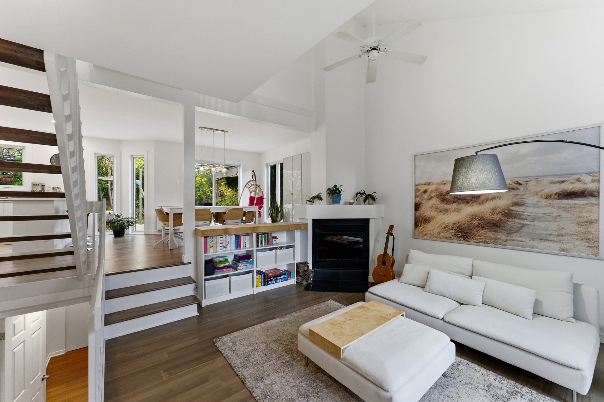 Le salon accueille un foyer au bois chaleureux, tandis que des planchers de bois d'ingénierie s'étendent sur tout le rez-de-chaussée et l'étage.