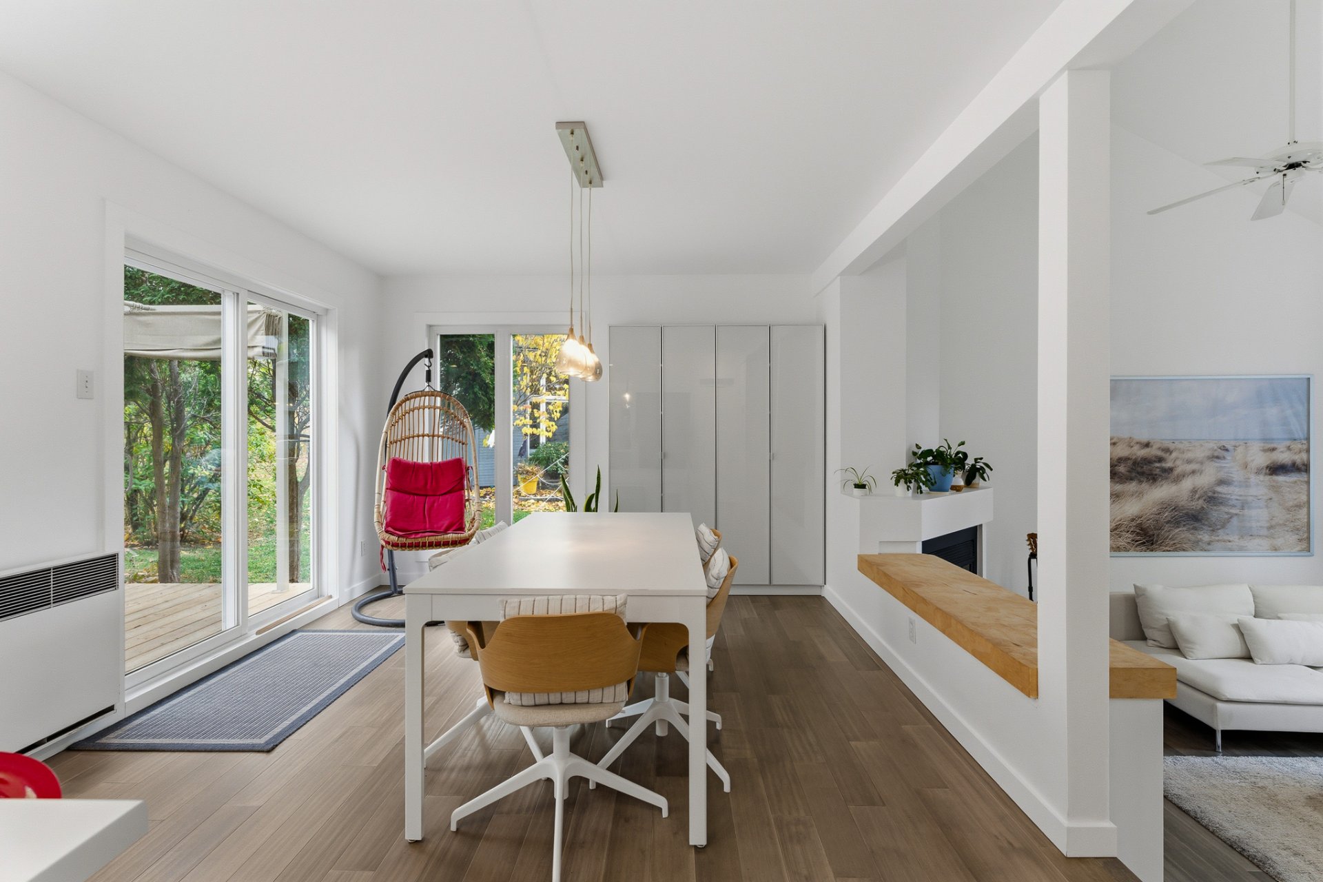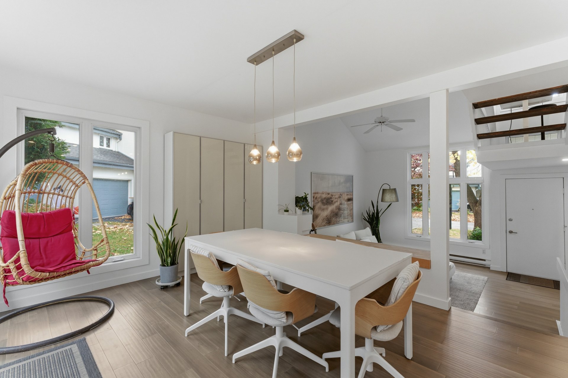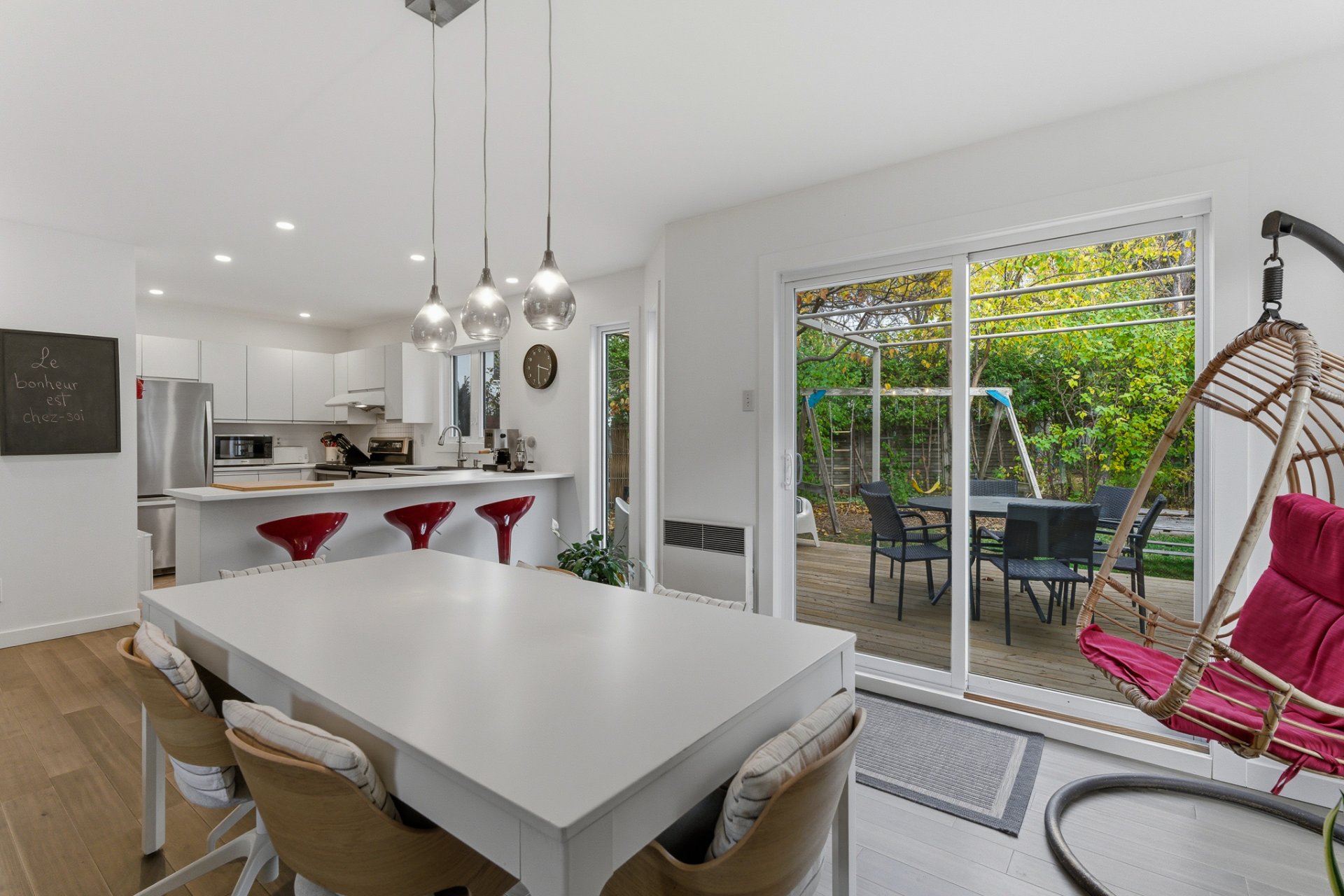La salle à manger lumineuse offre une belle vue sur la cour arrière, et la cuisine fonctionnelle, attenante, dispose d'un pratique comptoir lunch.