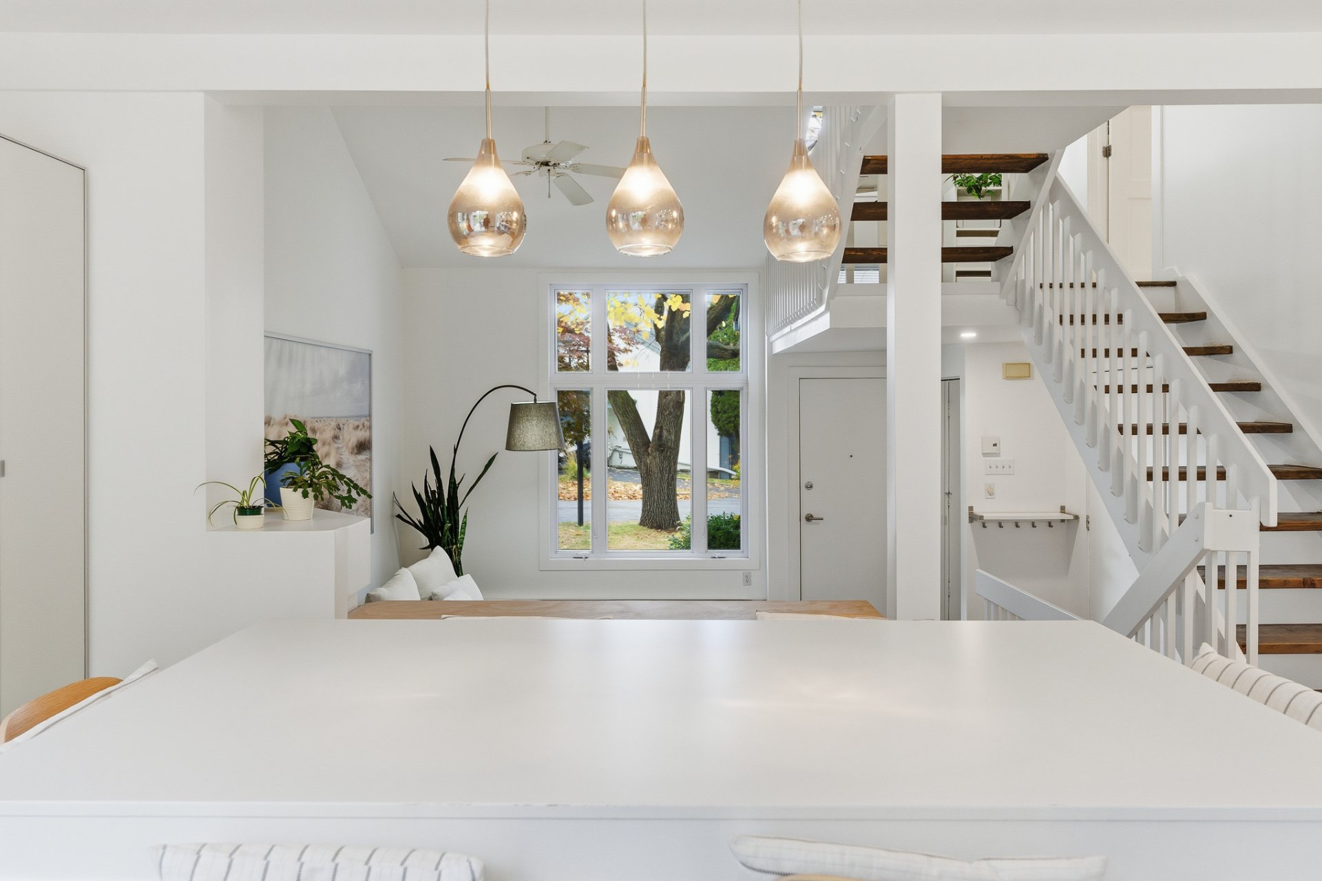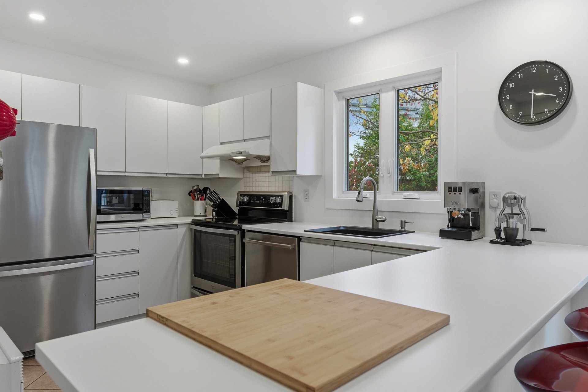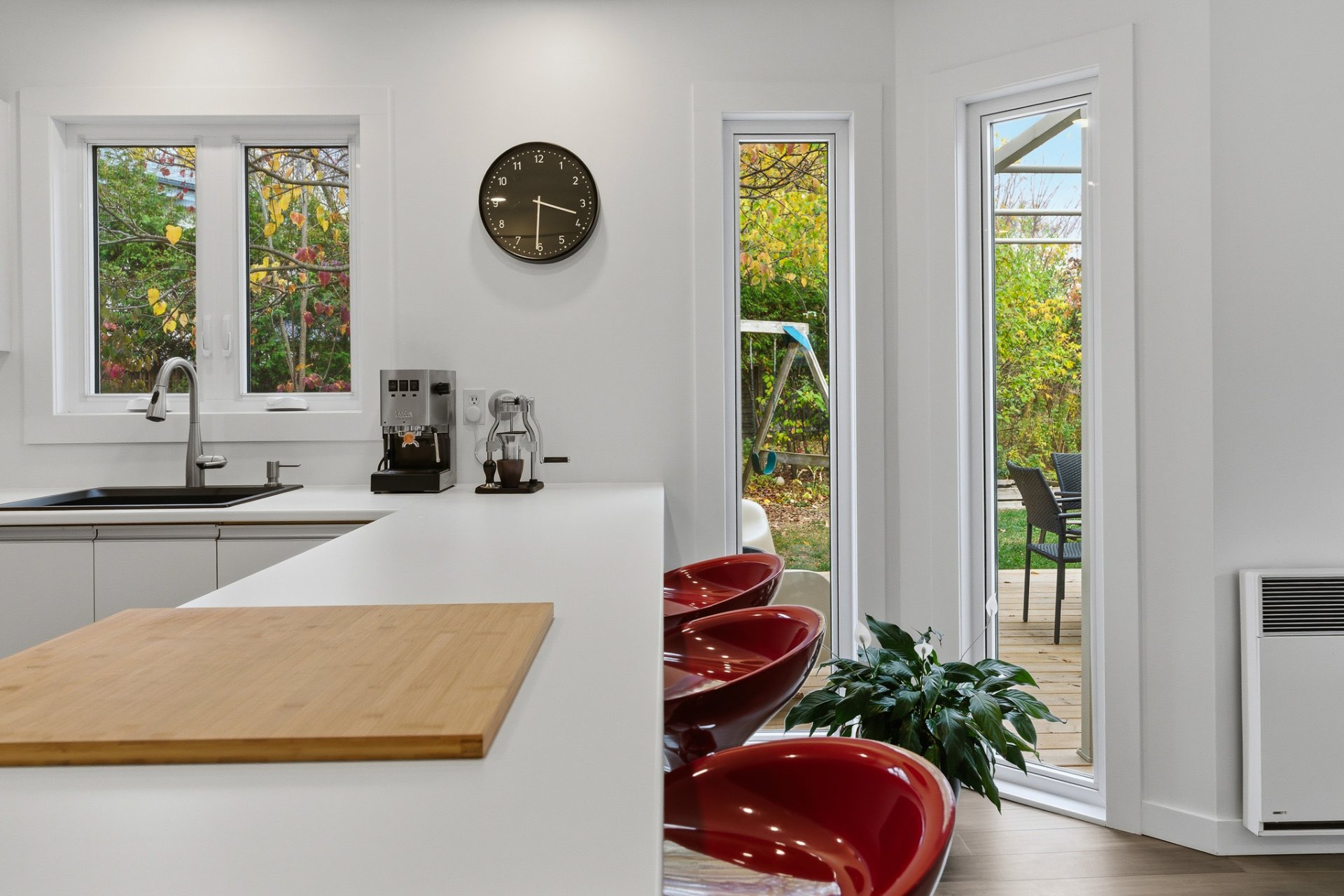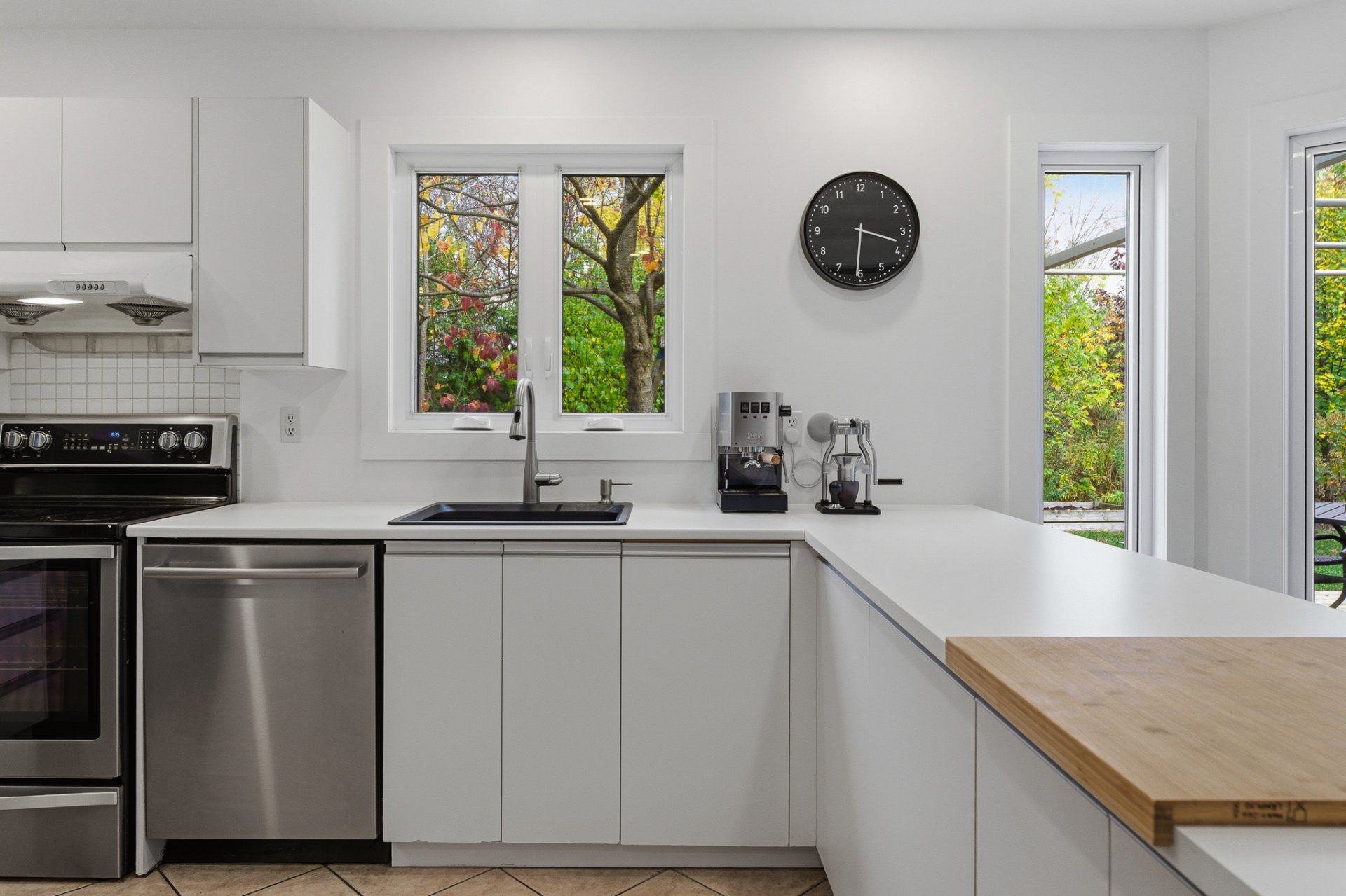 La salle à manger lumineuse offre une belle vue sur la cour arrière, et la cuisine fonctionnelle, attenante, dispose d'un pratique comptoir lunch.