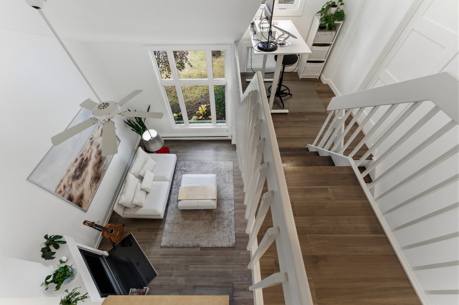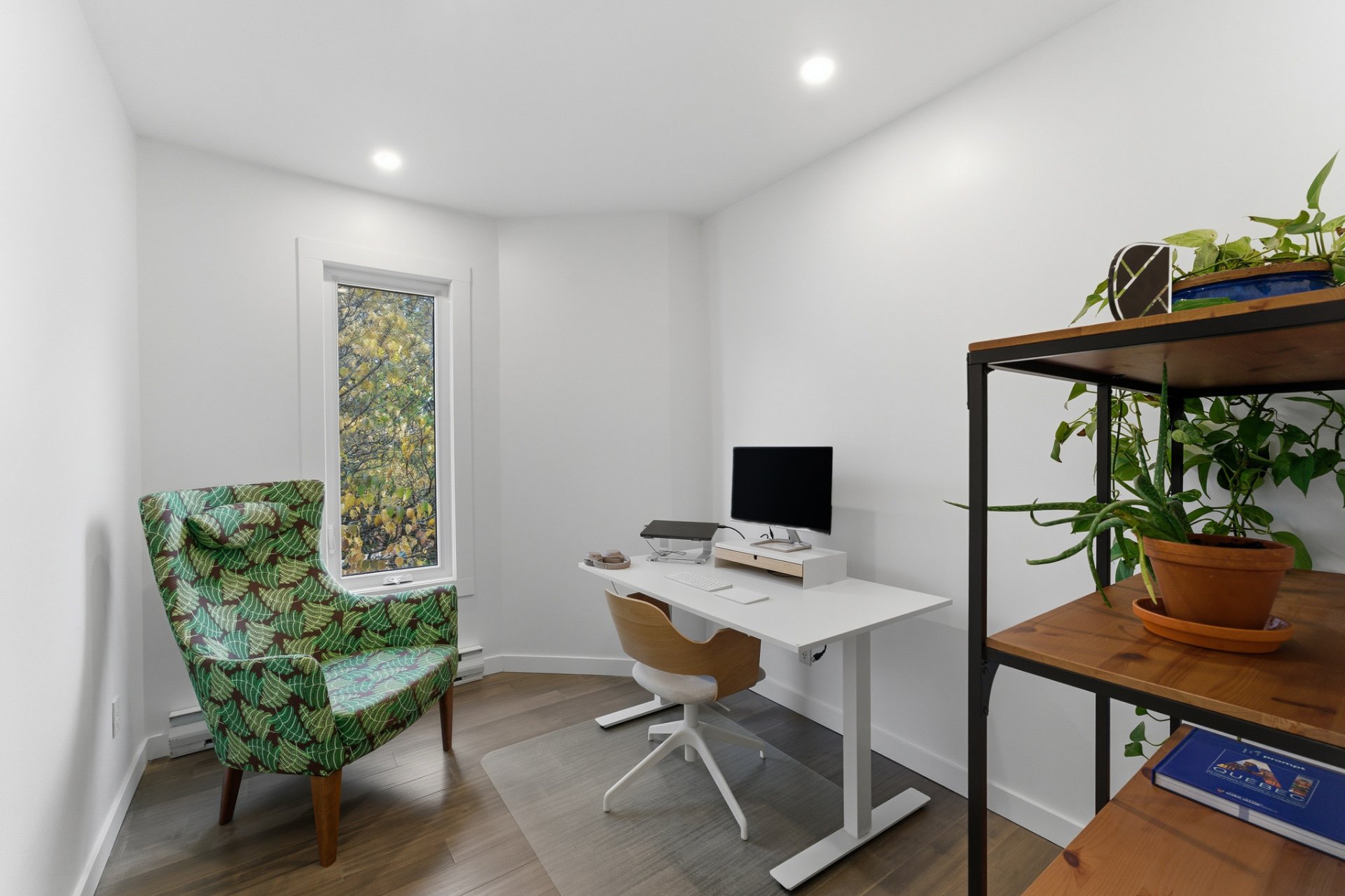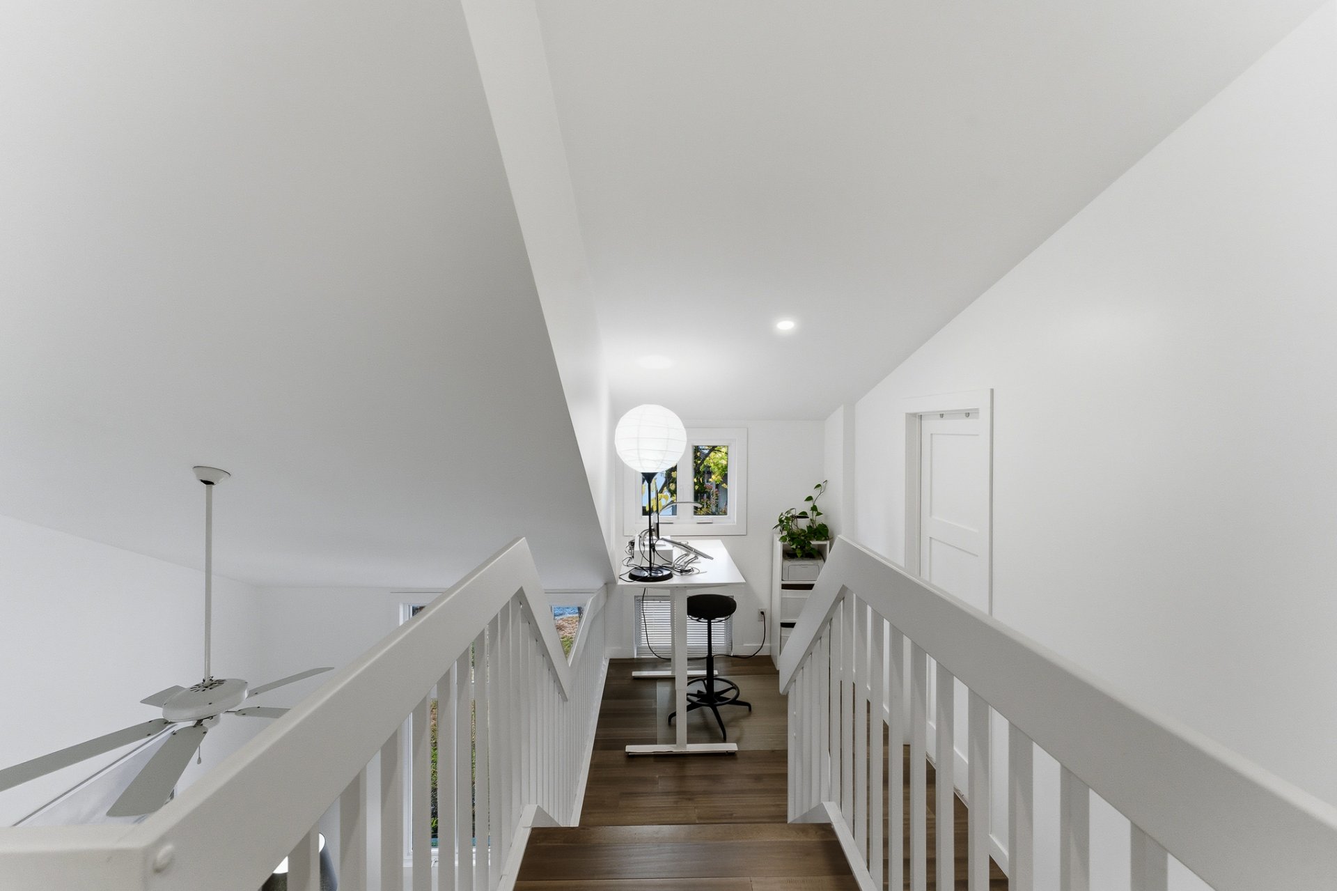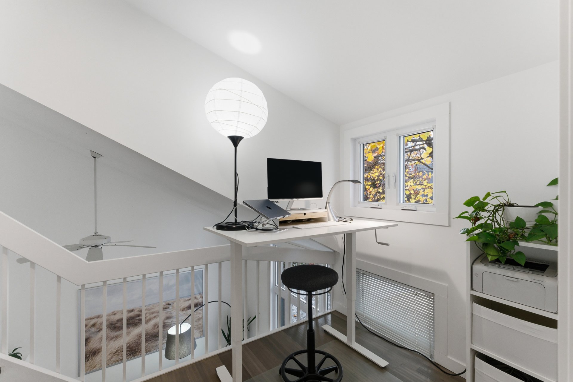 À l'étage, une superbe mezzanine surplombe le rez-de-chaussée et est aménagée en coin bureau.