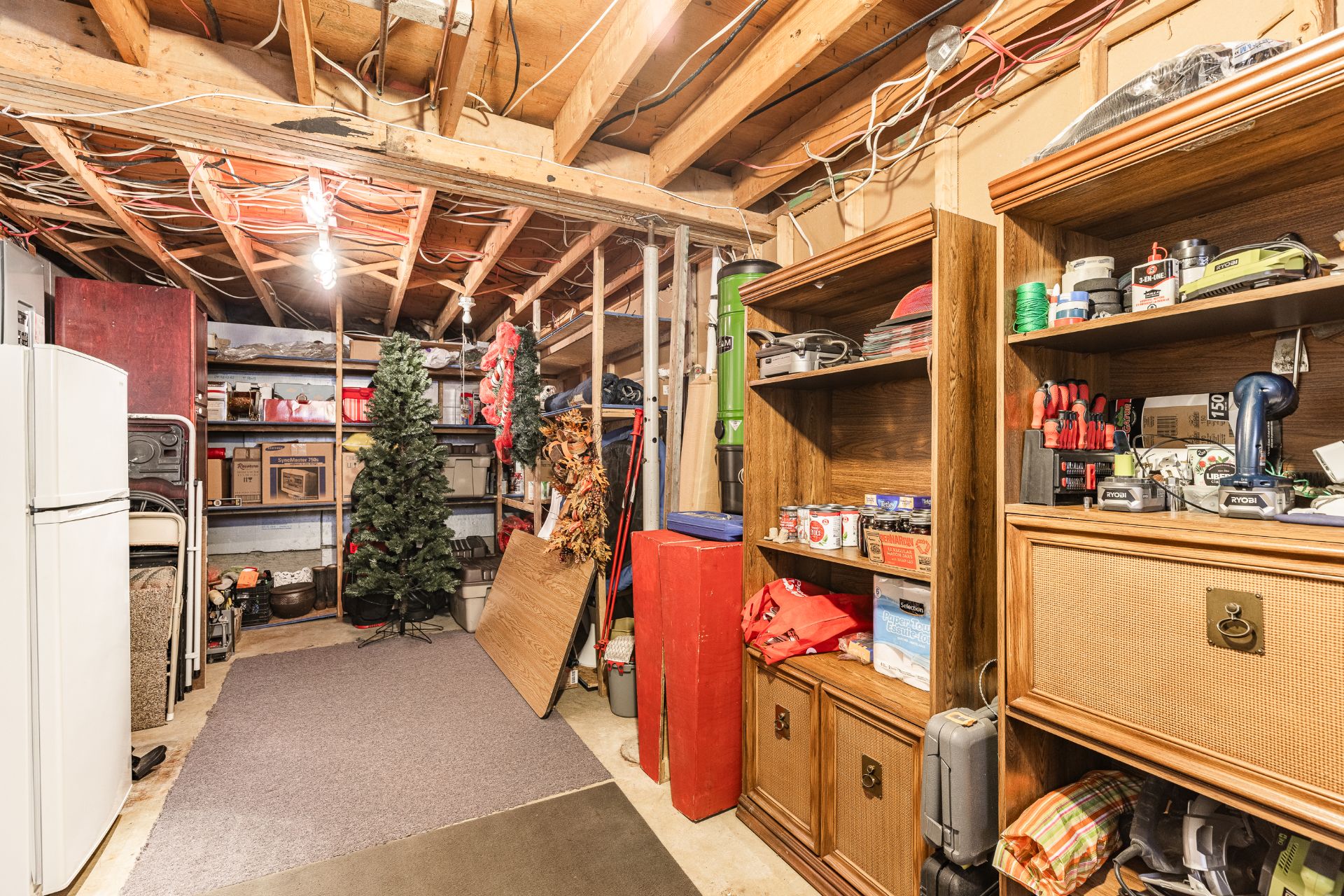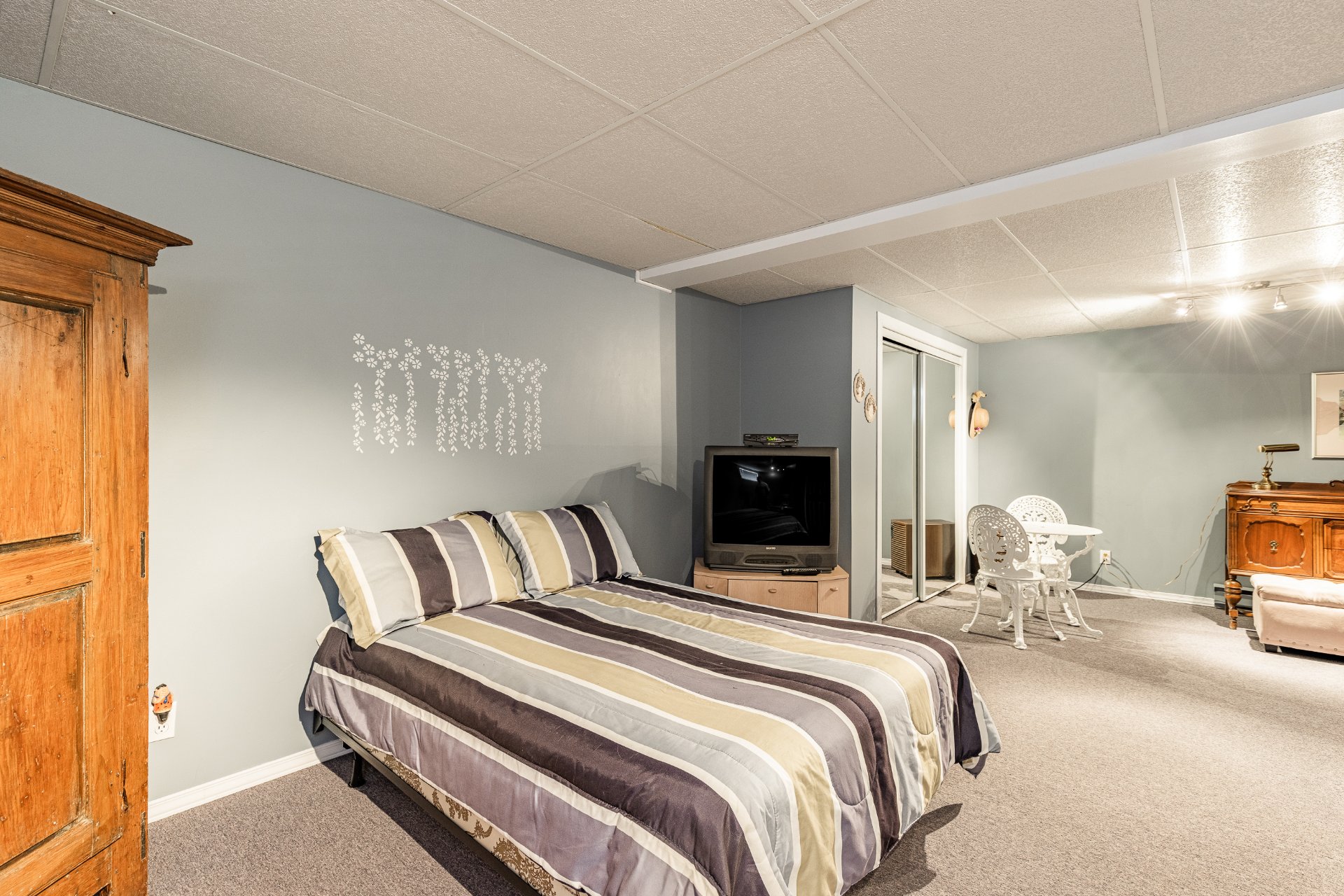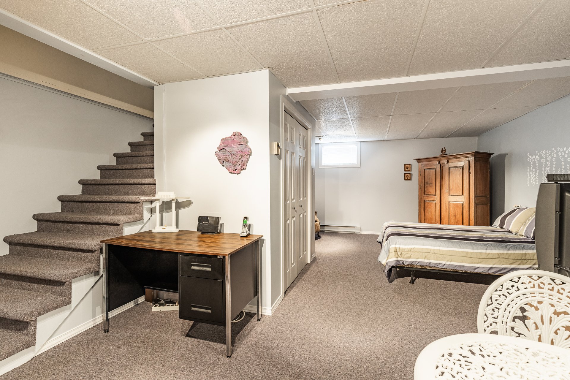 - Au sous-sol, une première section offre un grand espace de rangement, tandis que la seconde partie comprend une grande chambre pouvant aussi servir de salle familiale ou de bureau selon vos besoins.