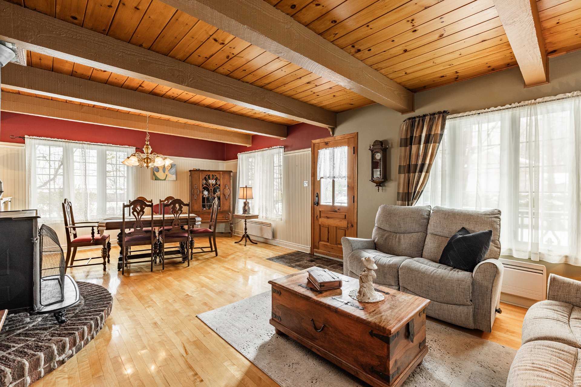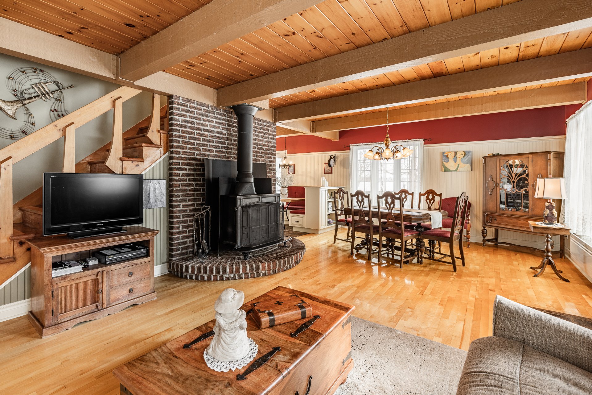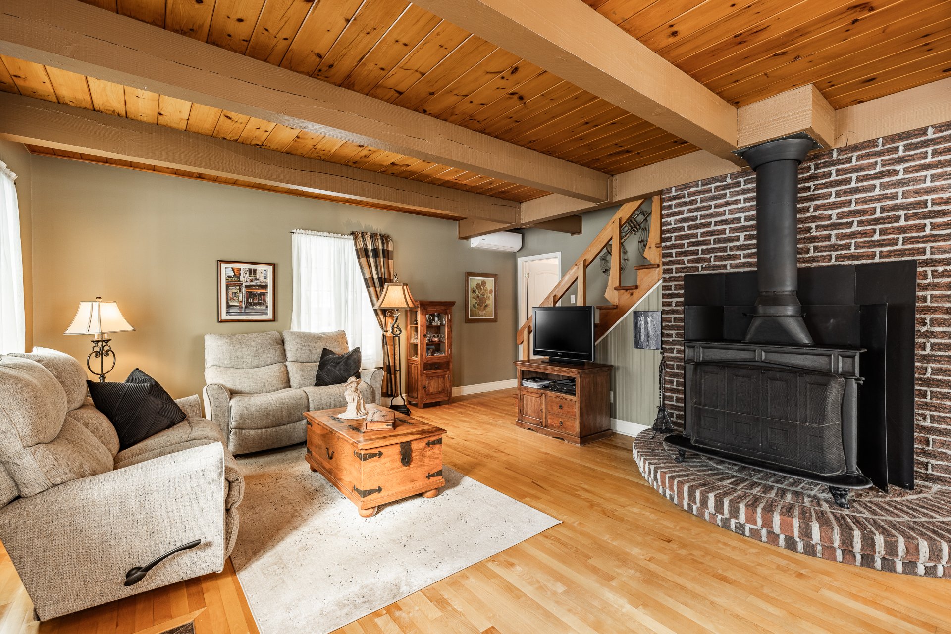 - Au rez-de-chaussée, vous trouverez un bel espace de vie à aire ouverte regroupant le salon, la salle à manger et la cuisine. Chacune de ces pièces bénéficie d'une excellente fenestration, offrant une luminosité optimale. La cuisine, fonctionnelle et conviviale, dispose d'un coin repas et de nombreux rangements. Le salon, agrémenté d'un foyer, crée une atmosphère chaleureuse lors des journées d'hiver, tandis que la salle à manger s'harmonise parfaitement avec l'espace. On y retrouve également une salle de bain avec rangement. L'ensemble est sublimé par de magnifiques poutres apparentes dans toutes les pièces de vie, ajoutant charme et caractère.