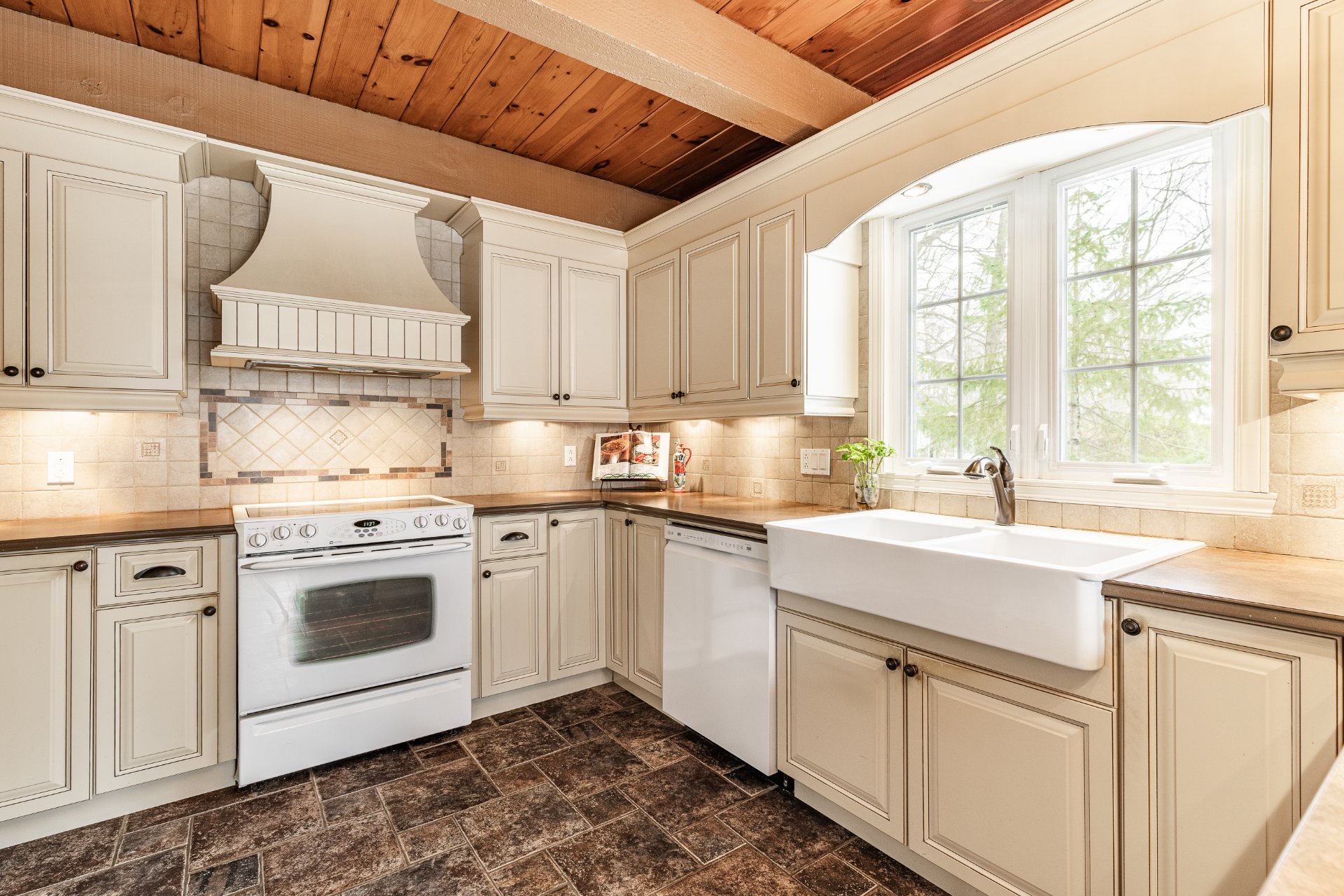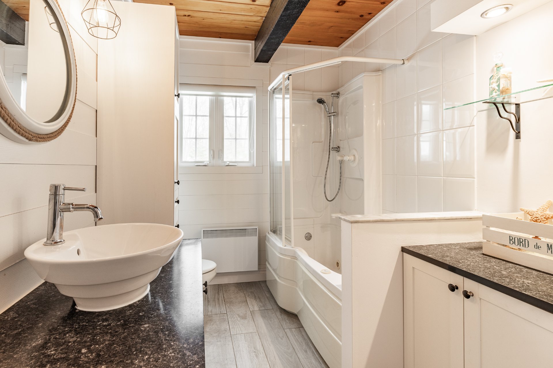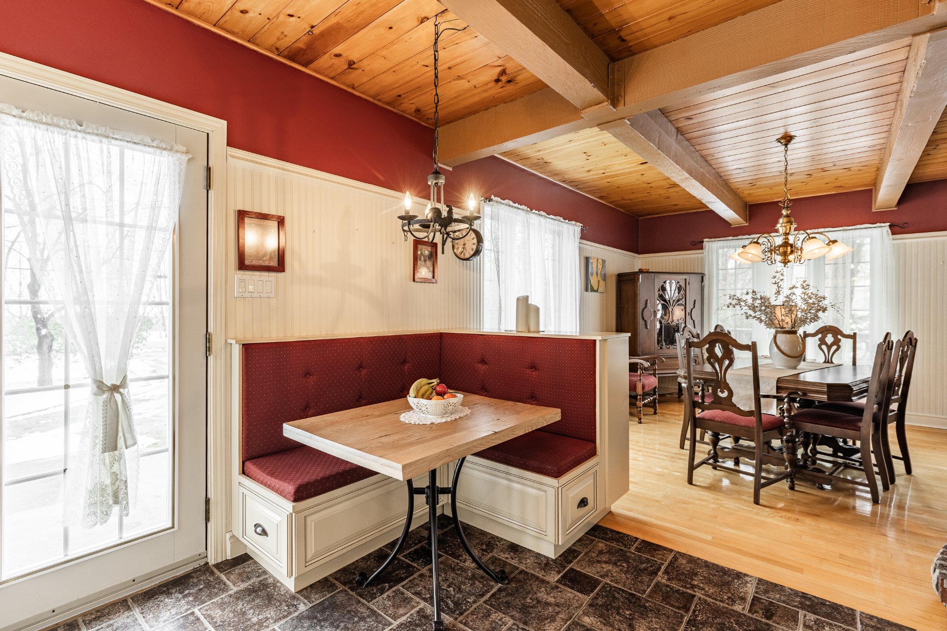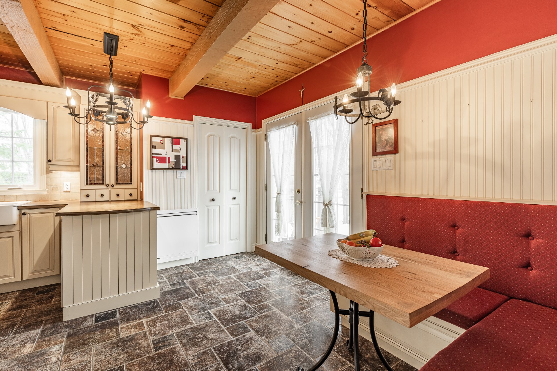 - Au rez-de-chaussée, vous trouverez un bel espace de vie à aire ouverte regroupant le salon, la salle à manger et la cuisine. Chacune de ces pièces bénéficie d'une excellente fenestration, offrant une luminosité optimale. La cuisine, fonctionnelle et conviviale, dispose d'un coin repas et de nombreux rangements. Le salon, agrémenté d'un foyer, crée une atmosphère chaleureuse lors des journées d'hiver, tandis que la salle à manger s'harmonise parfaitement avec l'espace. On y retrouve également une salle de bain avec rangement. L'ensemble est sublimé par de magnifiques poutres apparentes dans toutes les pièces de vie, ajoutant charme et caractère.