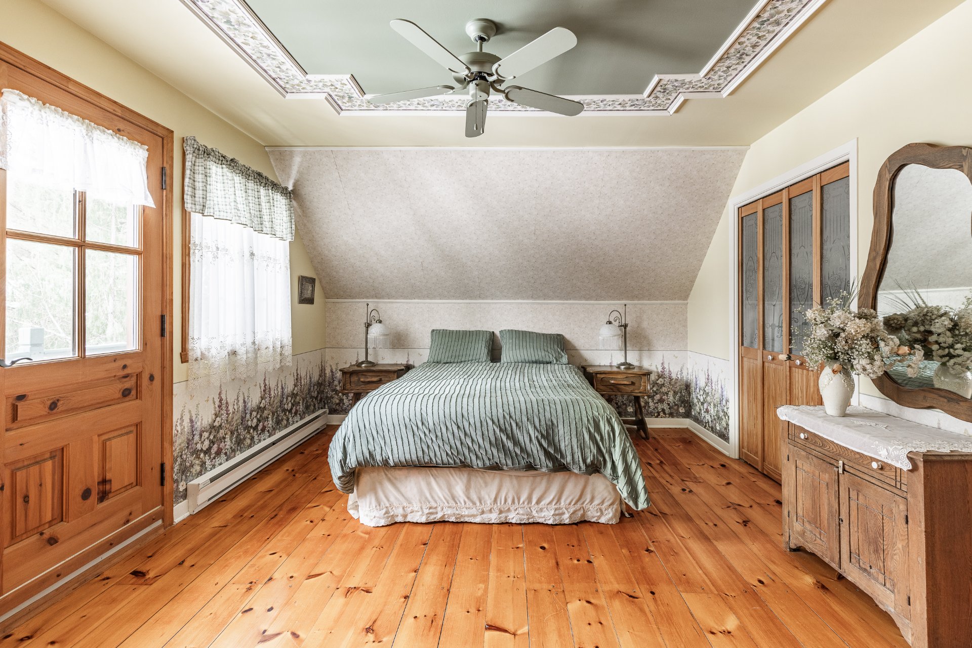 - Au salon, un escalier en bois mène au 2e étage, où se trouvent deux chambres de bonnes dimensions.