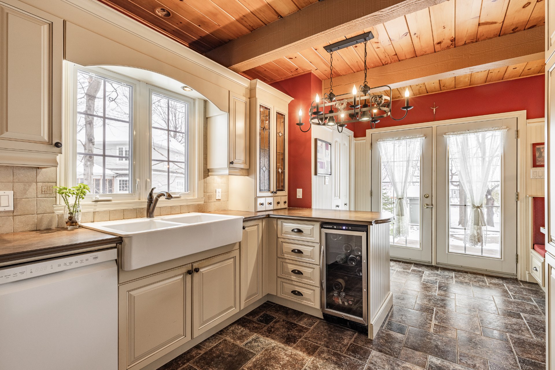- Les rideaux et pôles, le lave-vaisselle, le cellier, les armoires de rangement au sous-sol, le frigidaire au sous-sol, les accessoires du foyer de bois du salon, les luminaires (plafond), le set de salle à manger (une table avec 2 panneaux, et 7 chaises et 2 vaisseliers).