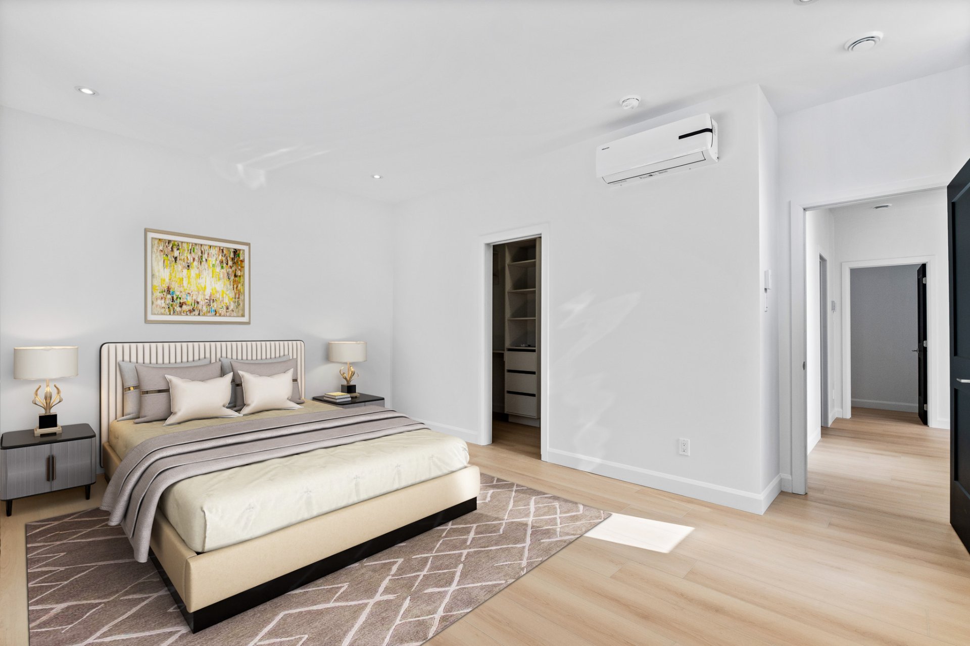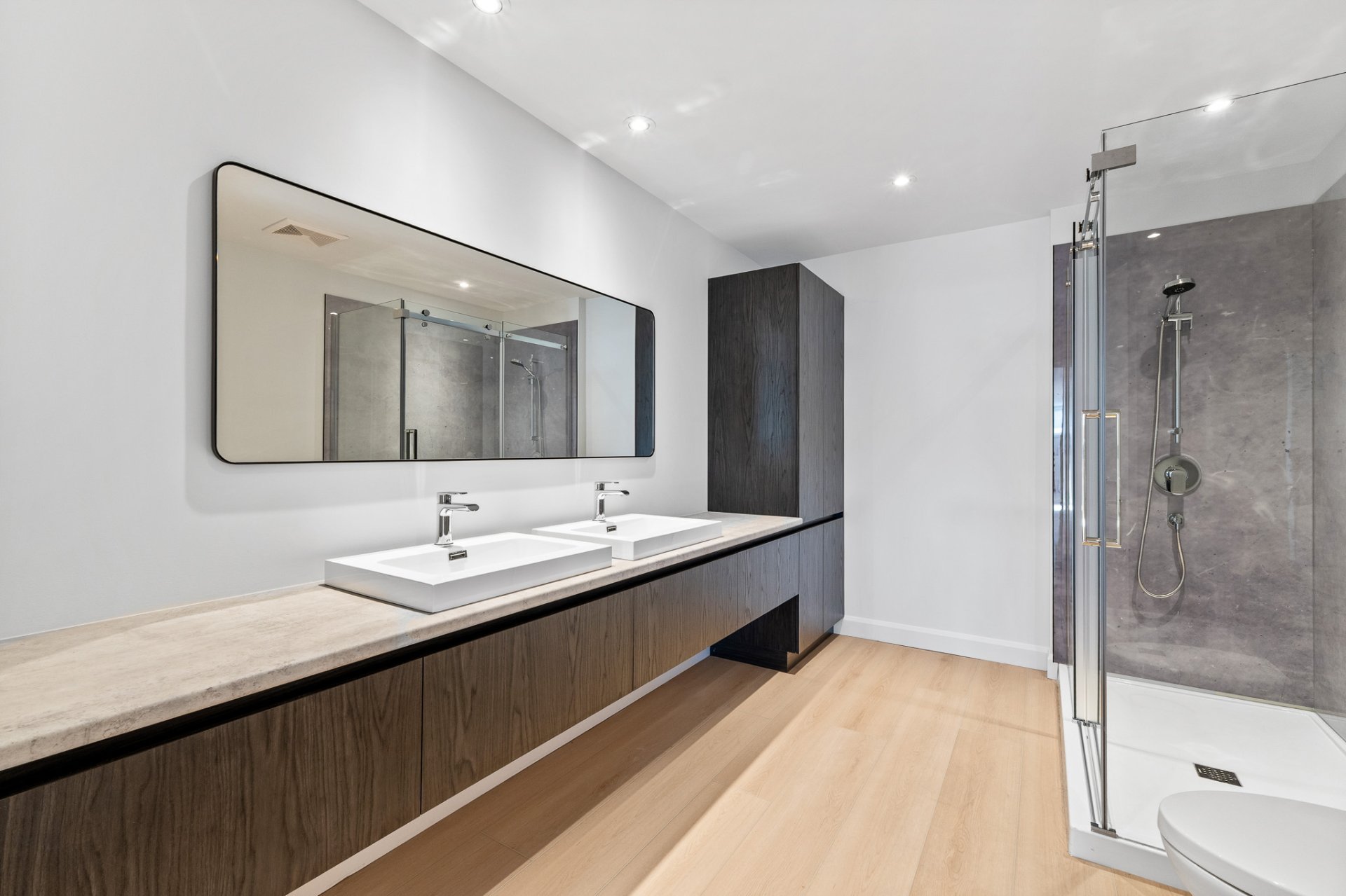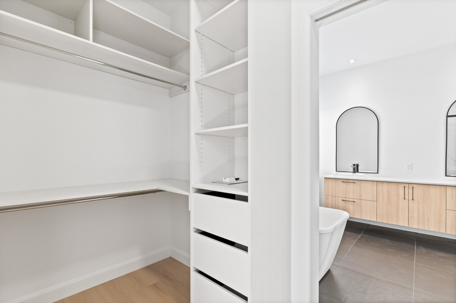 La chambre principale comprend un vaste walk-in aménagé avec mobilier, relié à la salle de bain. Celle-ci offre une vanité double, une douche séparée et un bain auto-portant. Une seconde chambre, également avec walk-in aménagé, complète cet étage.