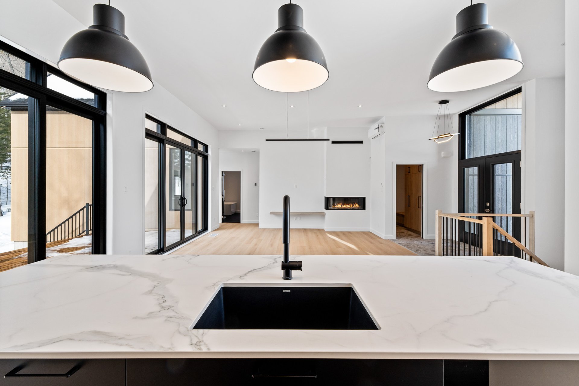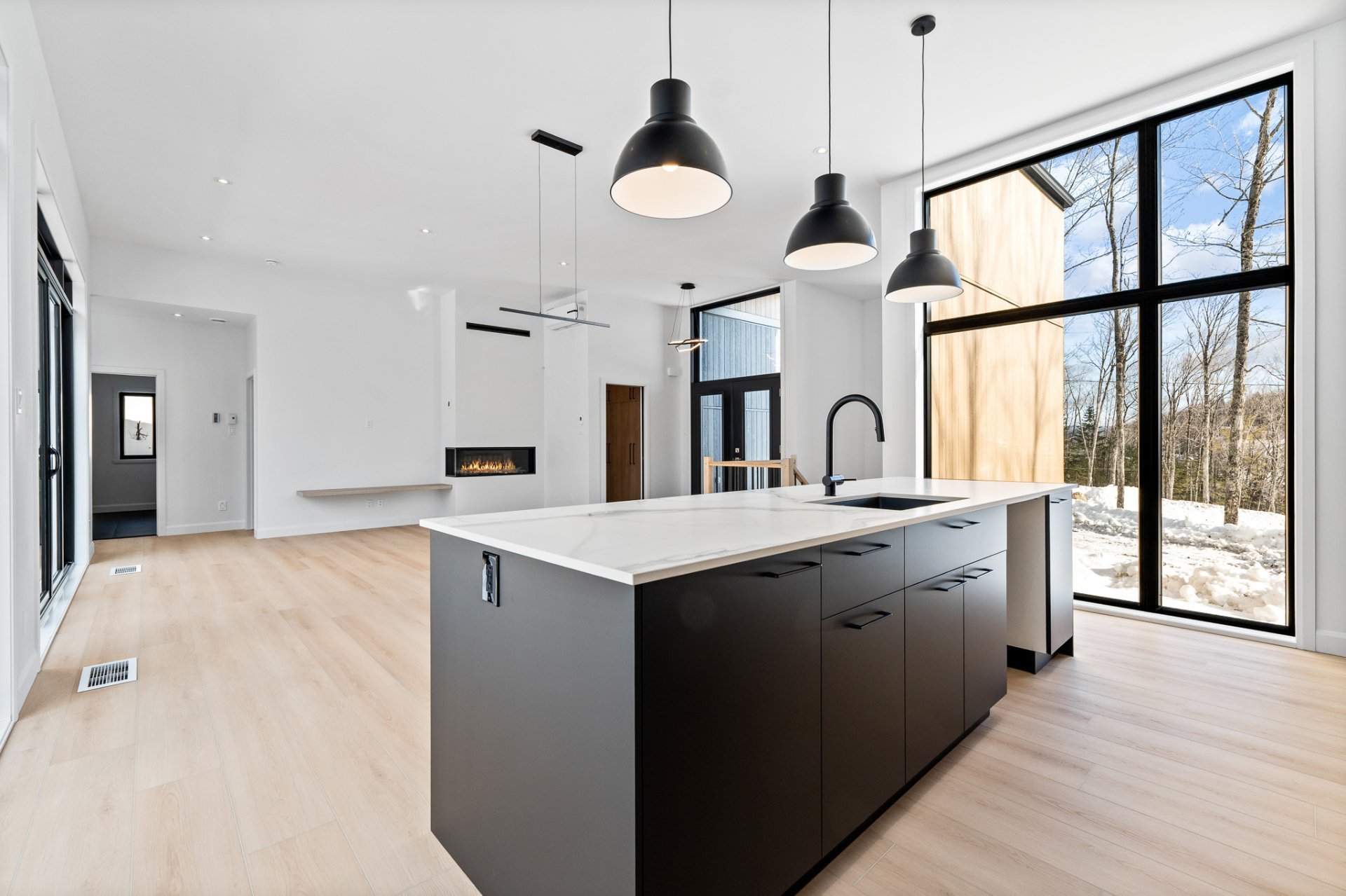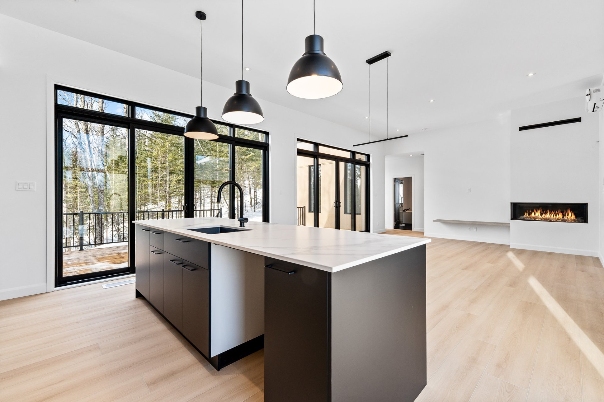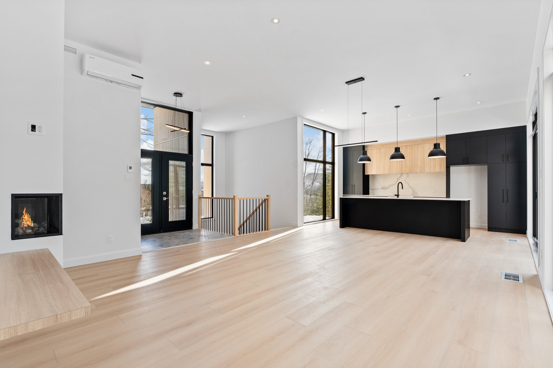 La cuisine est équipée d'un îlot central avec des comptoirs en quartz. Le salon dispose d'un foyer au gaz, créant une ambiance chaleureuse.