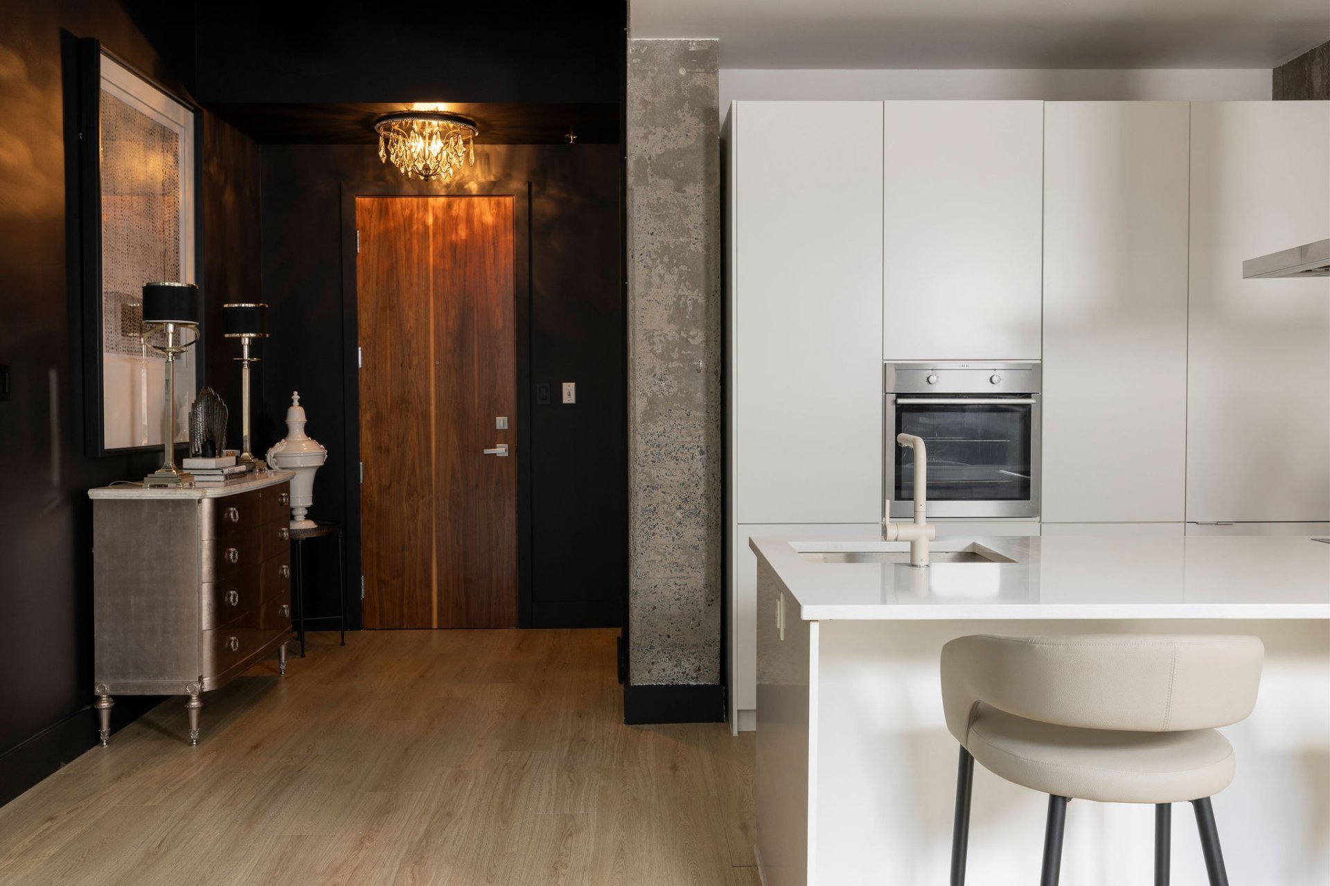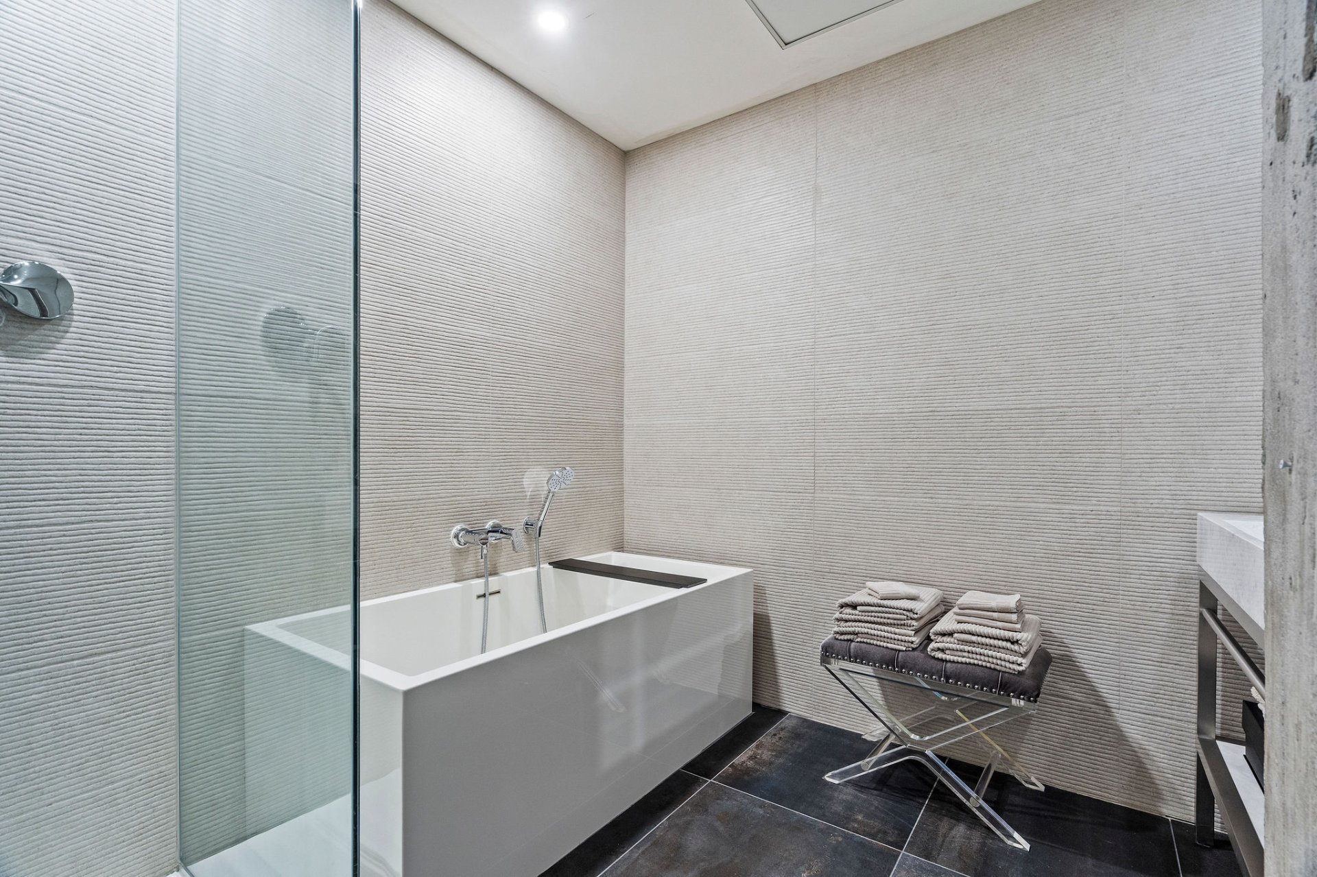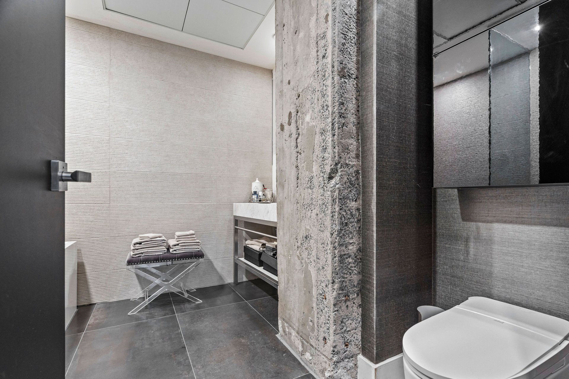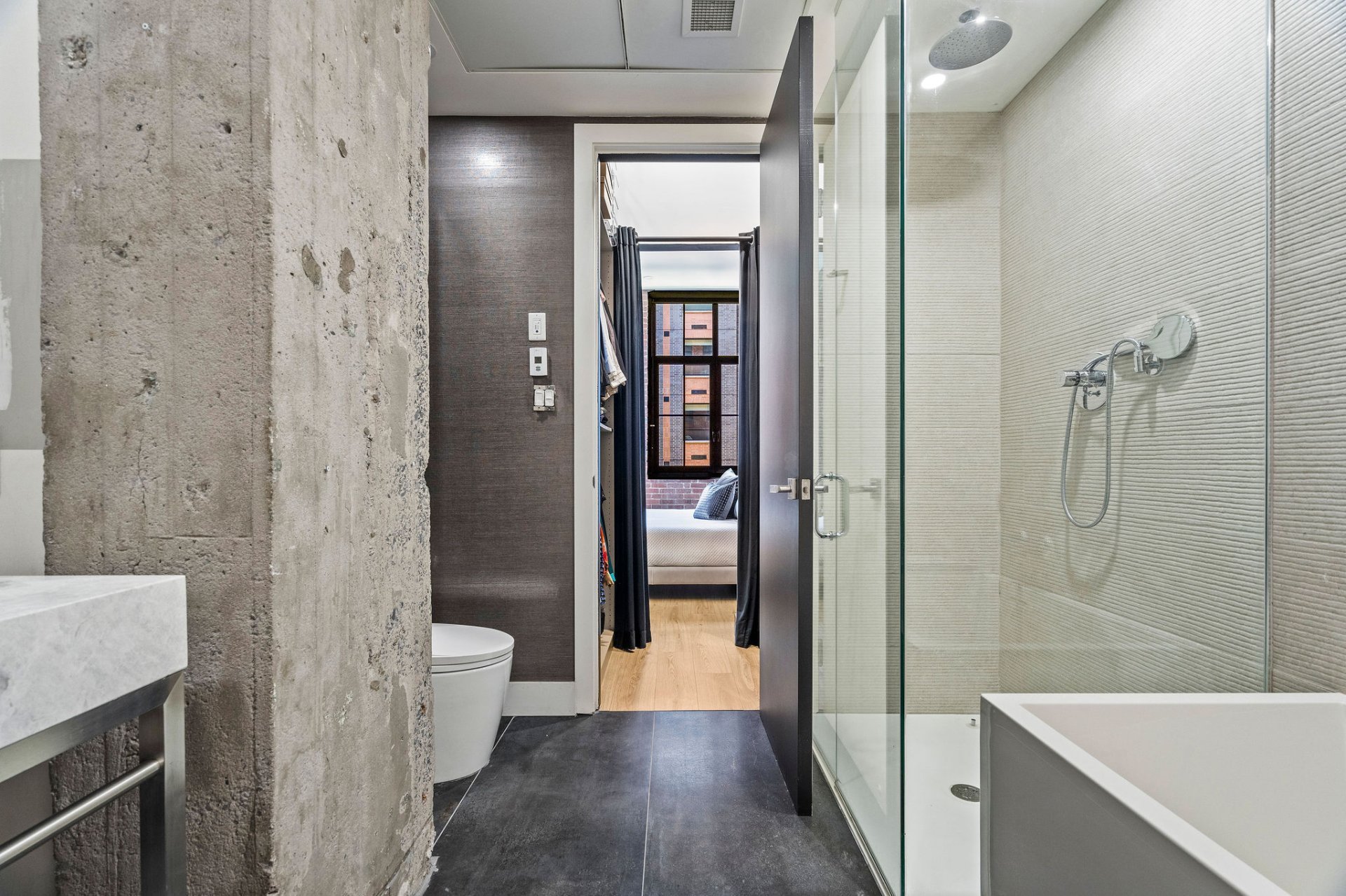 Dès l'entrée dans l'unité, l'alliance des matériaux nobles et industriels séduit instantanément : planchers de bois francs, poutres de béton apparentes et fenestration spectaculaire. La salle de bain se distingue par ses finitions luxueuses : douche à effet pluie, bain profond et planchers chauffants pour un confort absolu.