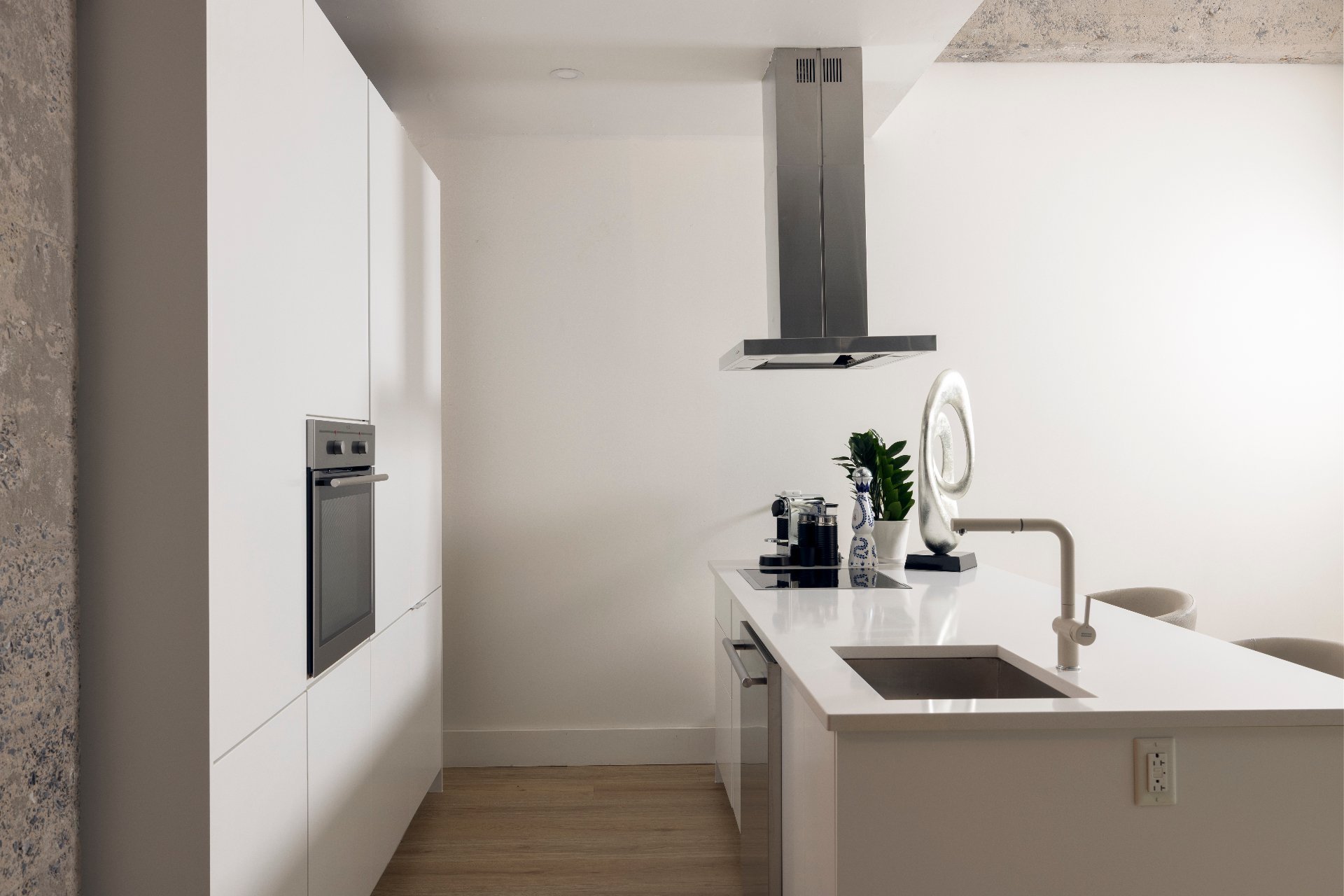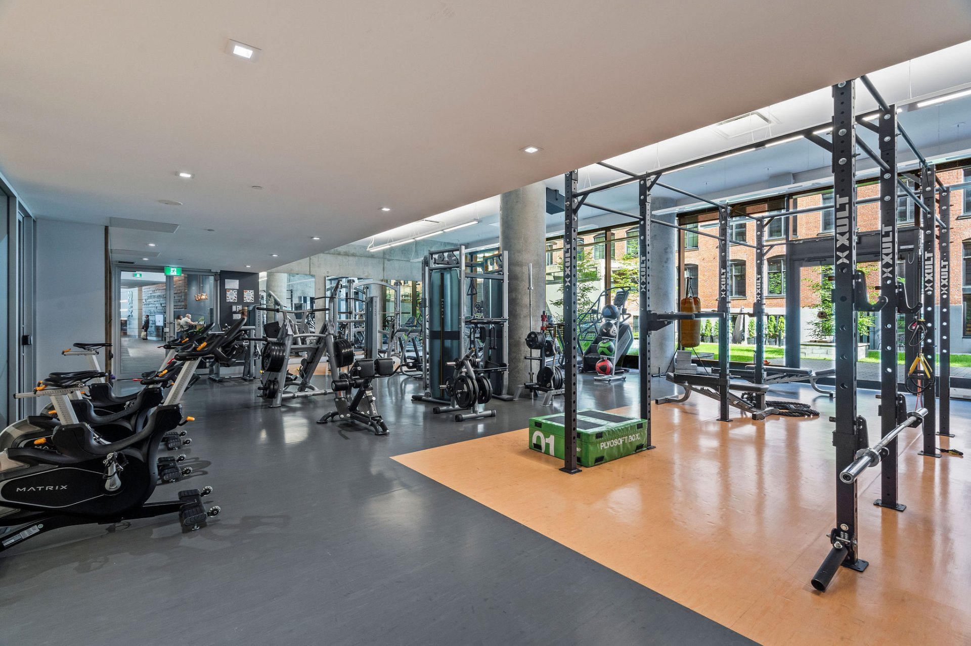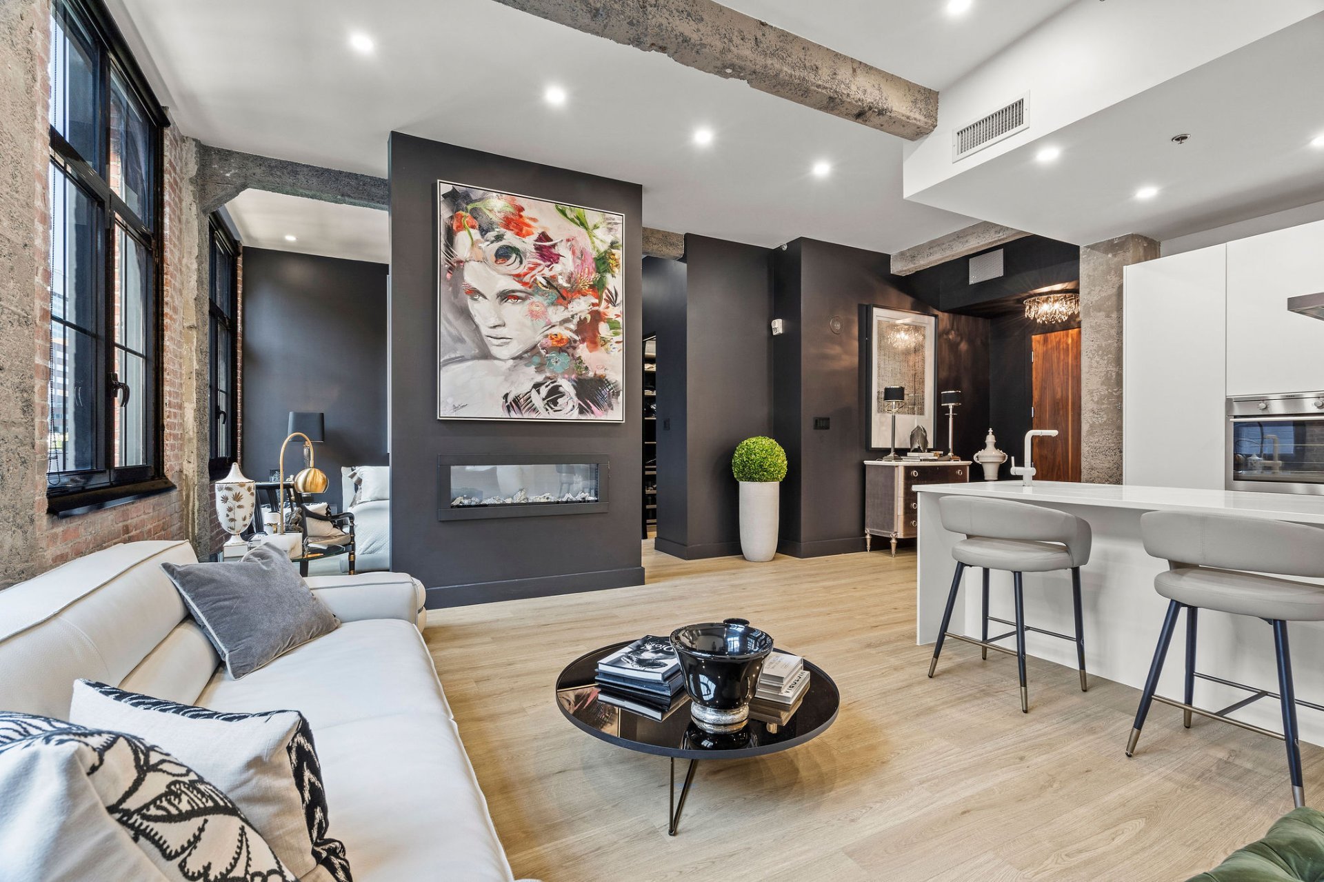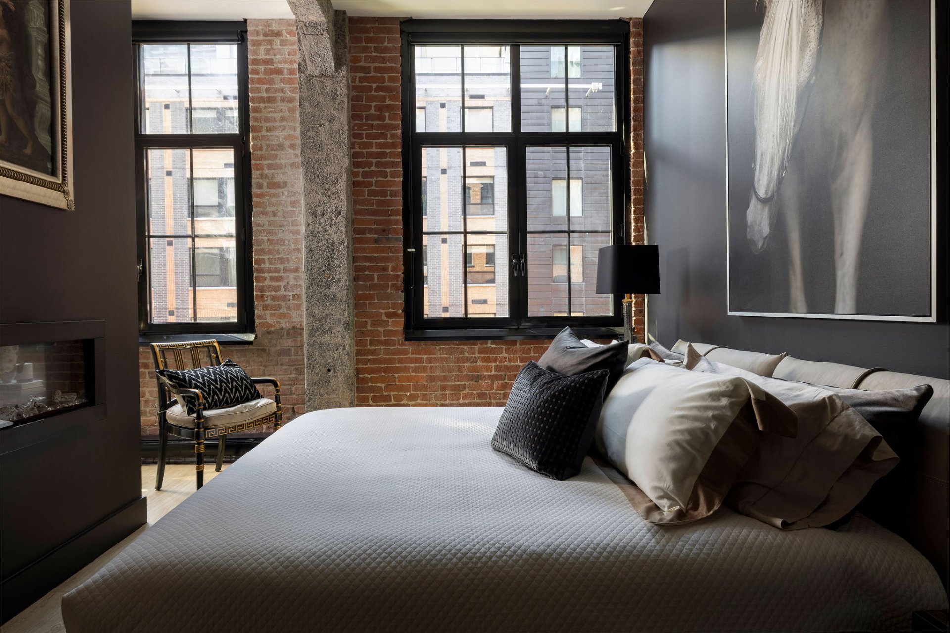 Dès l'entrée dans l'unité, l'alliance des matériaux nobles et industriels séduit instantanément : planchers de bois francs, poutres de béton apparentes et fenestration spectaculaire. La salle de bain se distingue par ses finitions luxueuses : douche à effet pluie, bain profond et planchers chauffants pour un confort absolu.