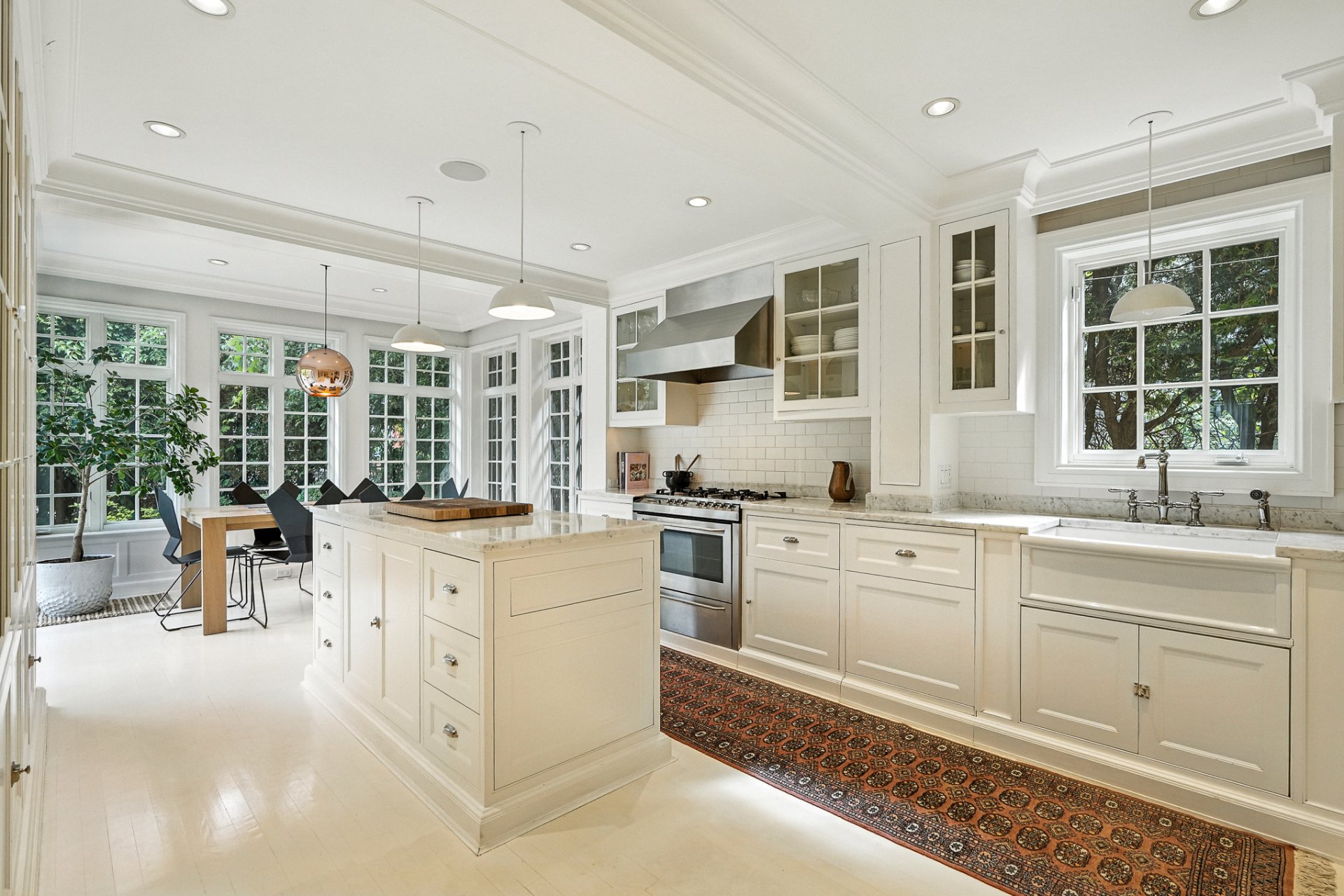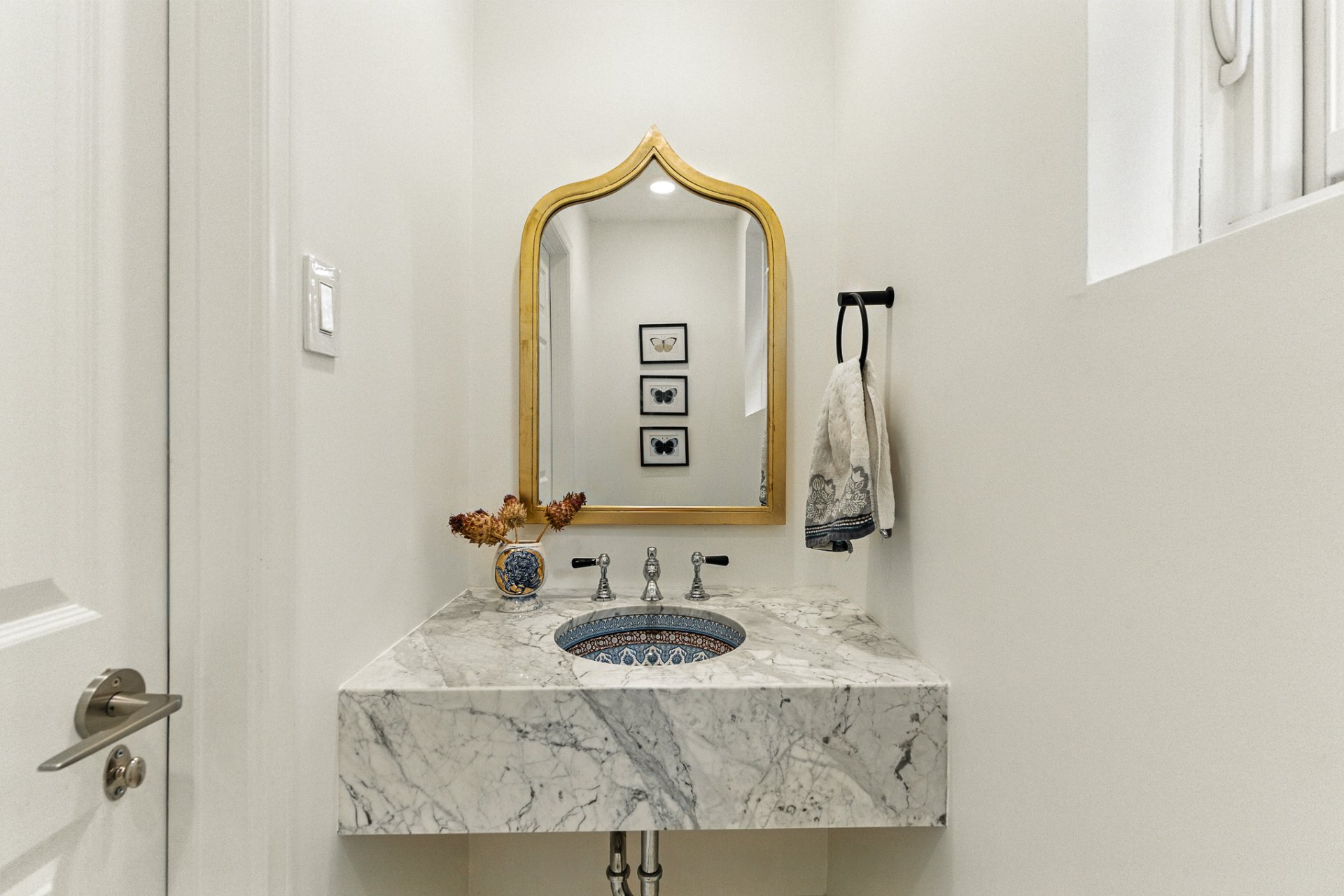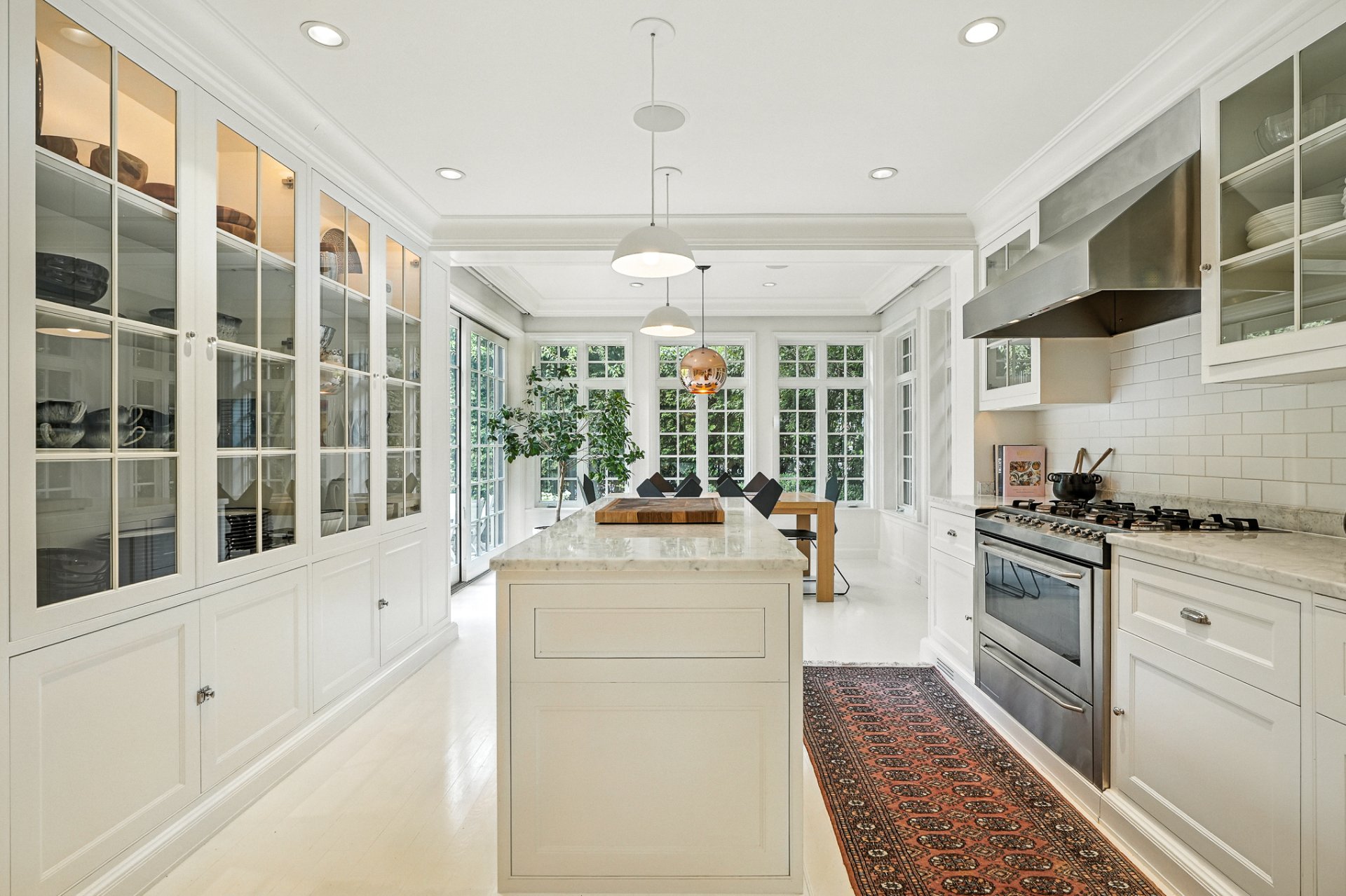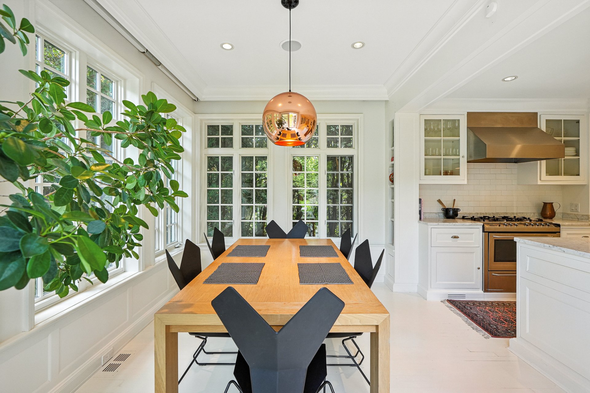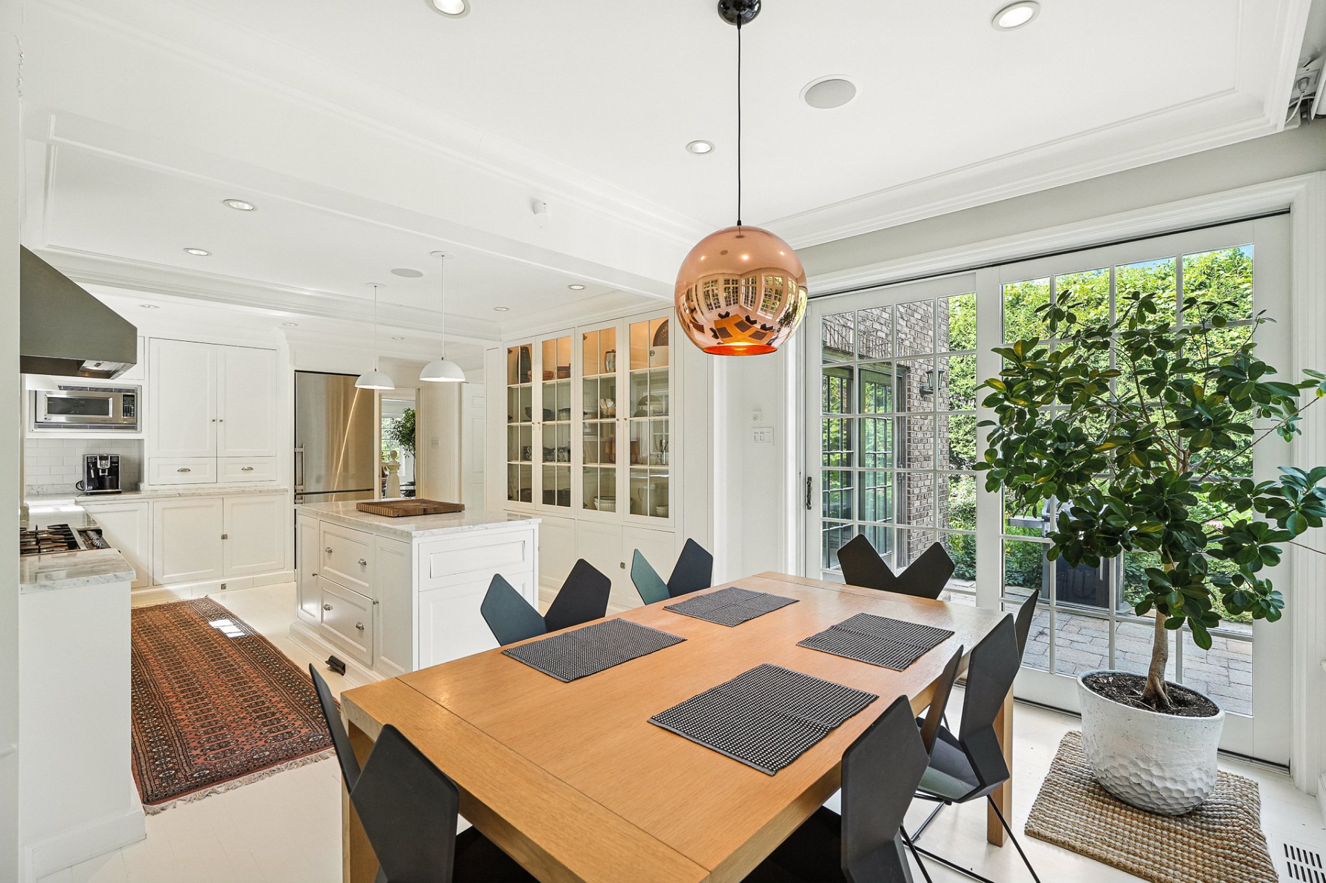 Les aires de vie se succèdent avec fluidité -- un salon lumineux avec foyer, une salle à manger conviviale qui s'ouvre sur la terrasse, et une cuisine spectaculaire, coeur de la maison, avec grand îlot central et vaisselier encastré pleine hauteur. Conçue avec minutie, elle marie marbre, boiseries sur mesure et électroménagers haut de gamme, le tout prolongé par un coin-repas en verrière, fenêtre sur la cour.
