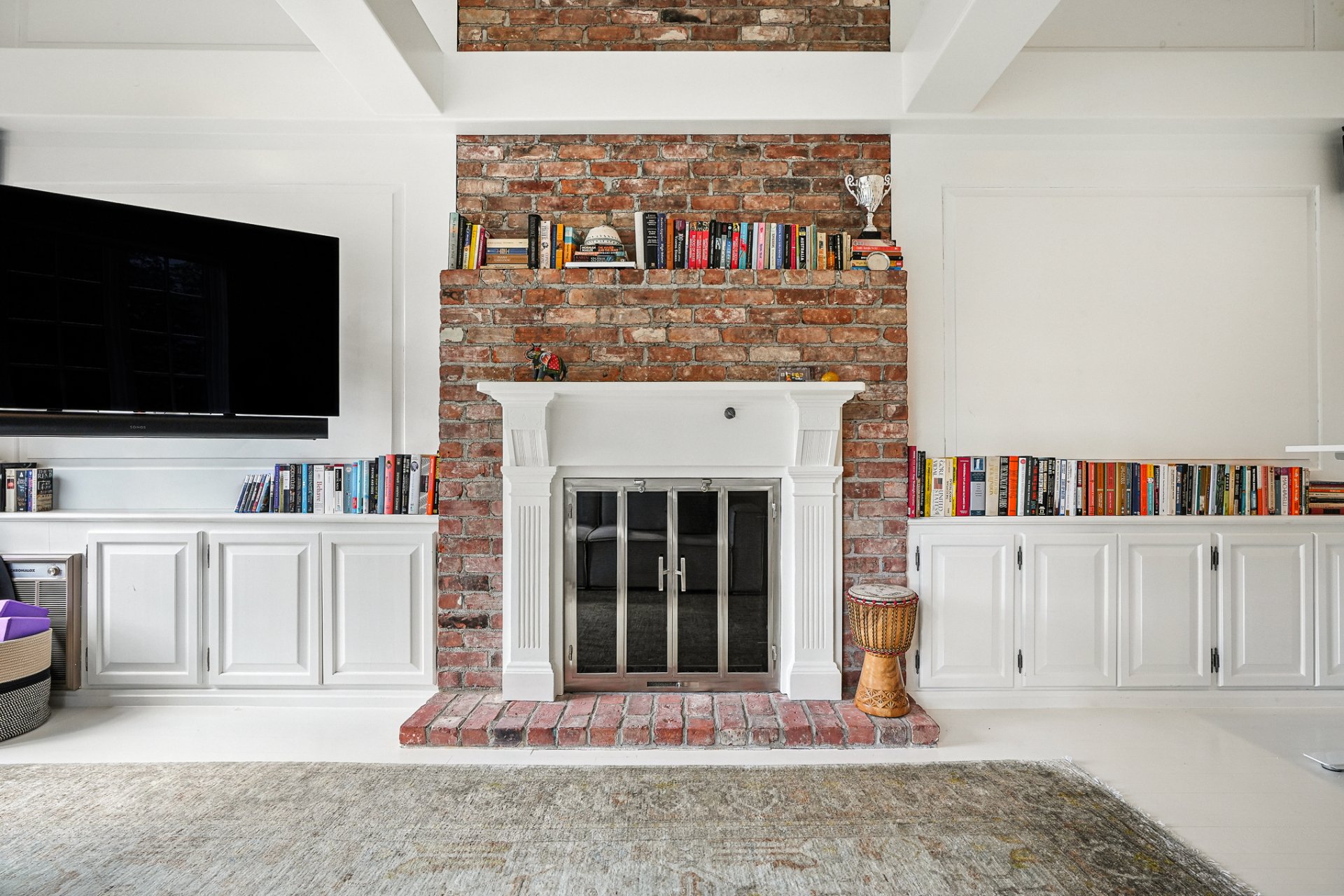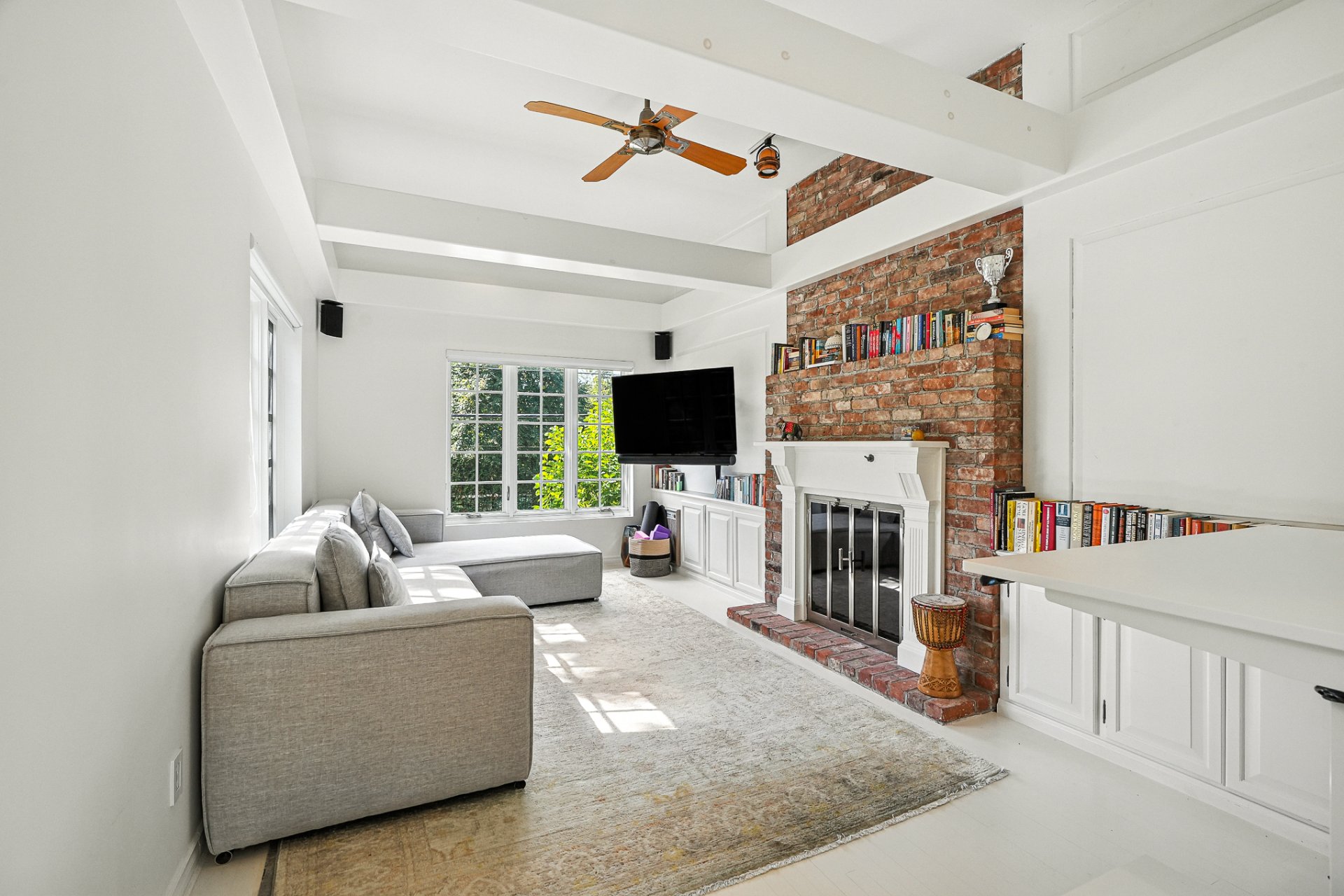 Second salon avec haut plafond, poutres apparentes et foyer en brique, offrant un espace lumineux et polyvalent entre le rez-de-chaussée et l'étage.