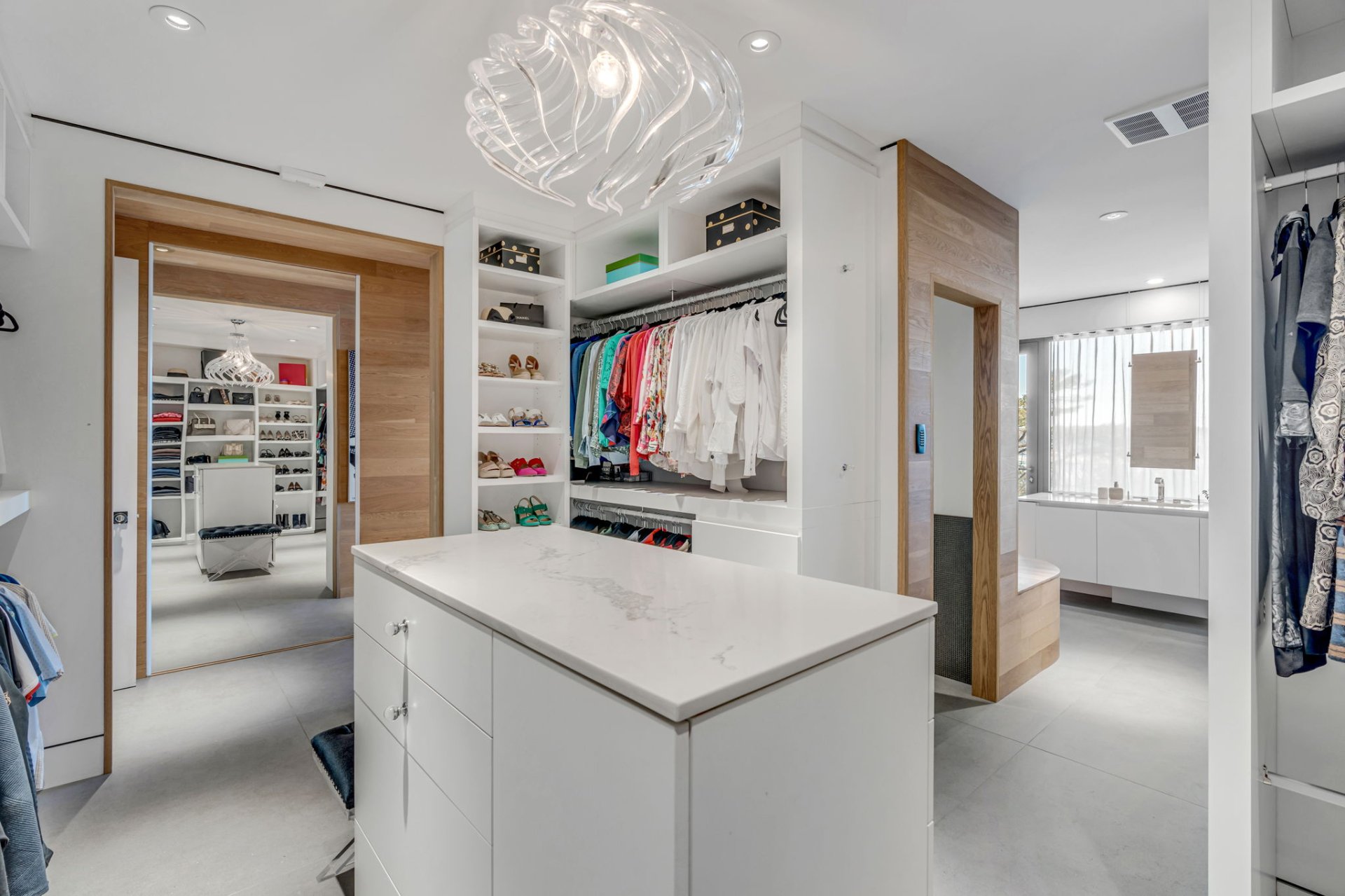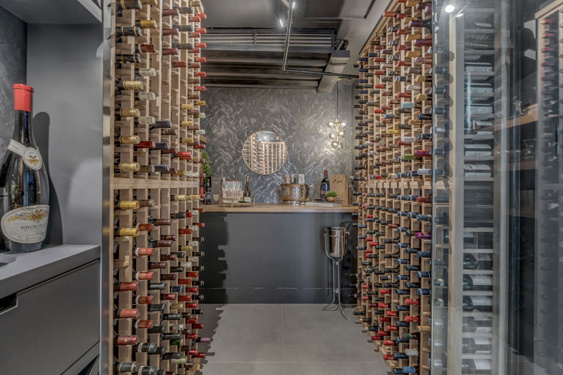 Cuisine blanche avec armoires en bois laqué, îlot de 3 m et comptoirs en Dekton. Électroménagers BOSCH et coin café avec machine de qualité commerciale. L'arrière-cuisine mène au garage et abrite une cave à vin pouvant accueillir jusqu'à 800 bouteilles.