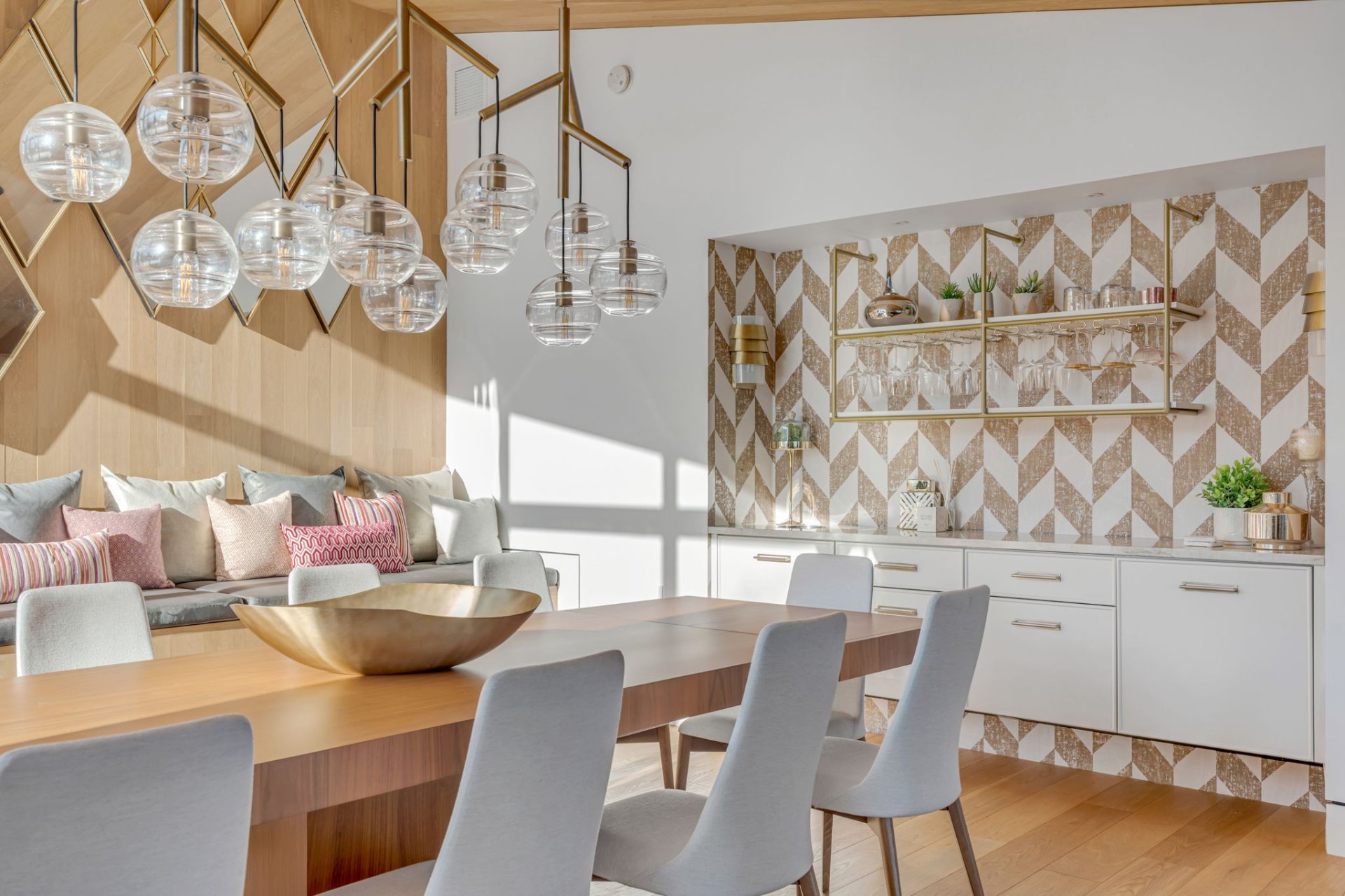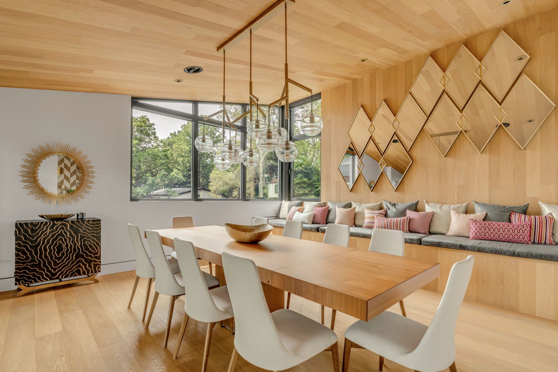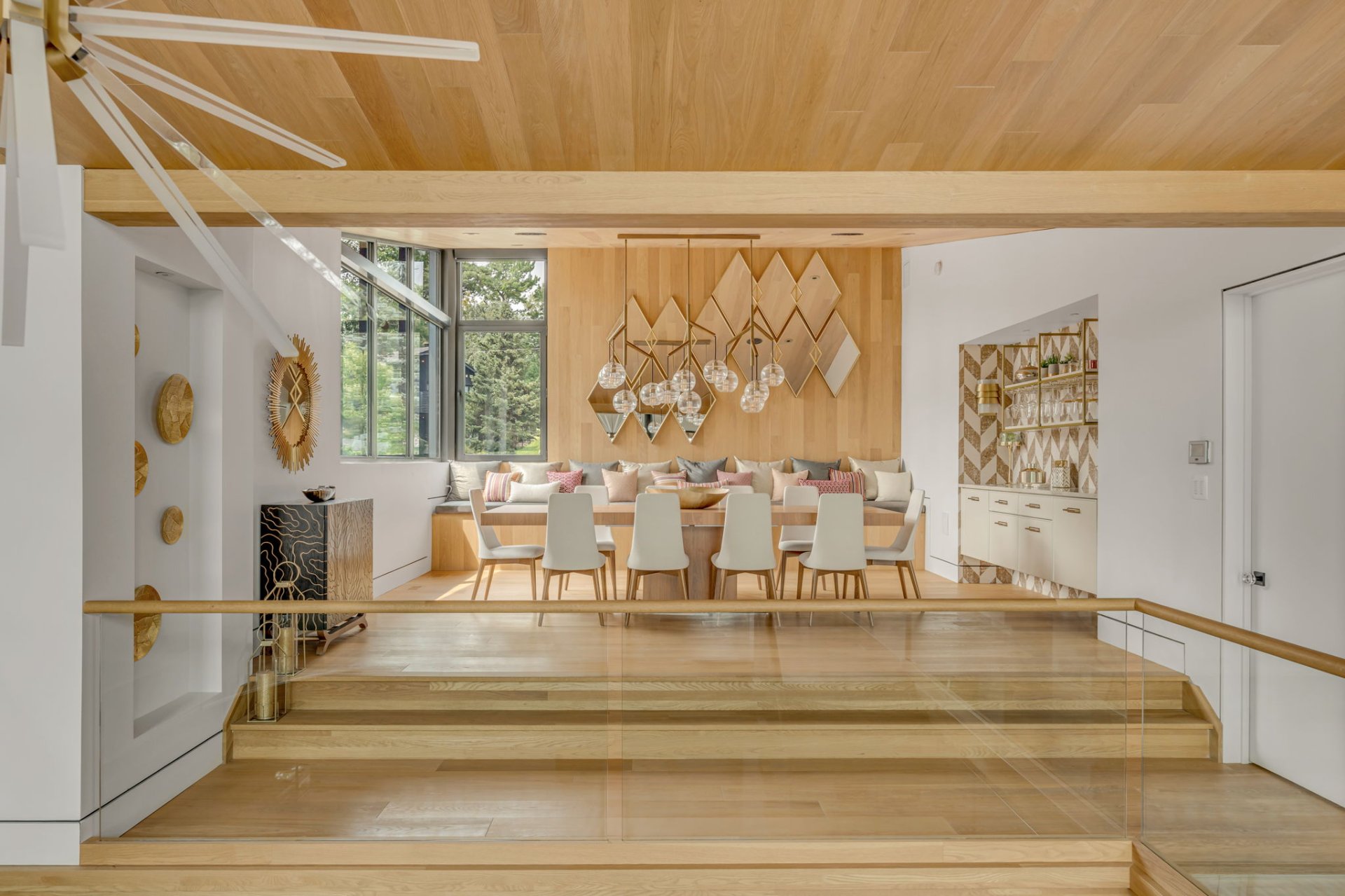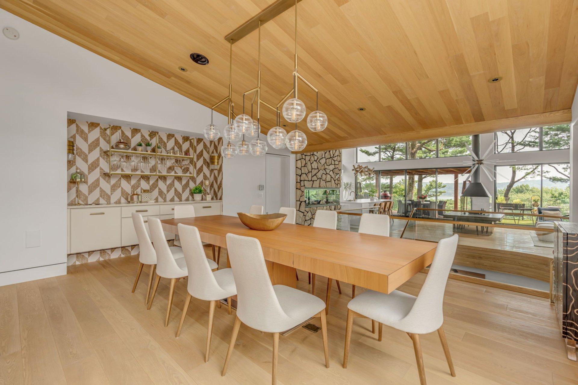 Banquette surdimensionnée et grande table avec vue. Lieu chaleureux, parfait pour les repas en famille ou entre amis. le coin bar agrémente la pièce.