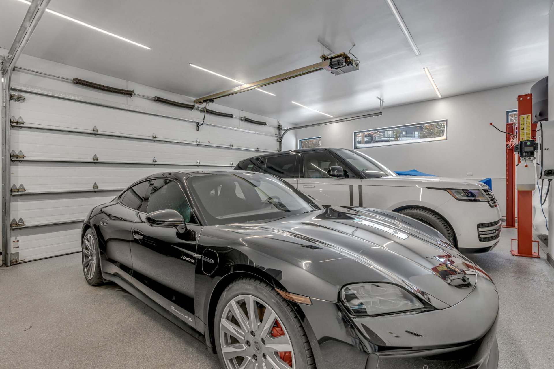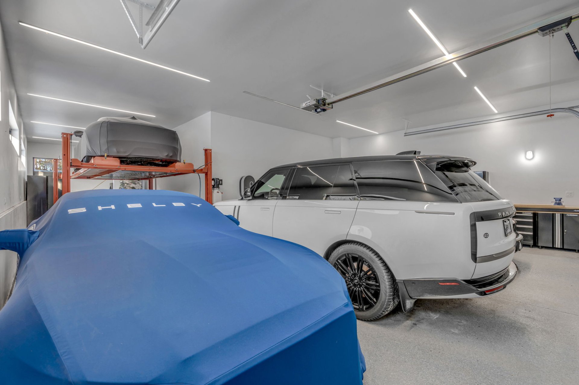 Garage spacieux pour cinq voitures avec lift intégré, idéal pour les voitures de collection.