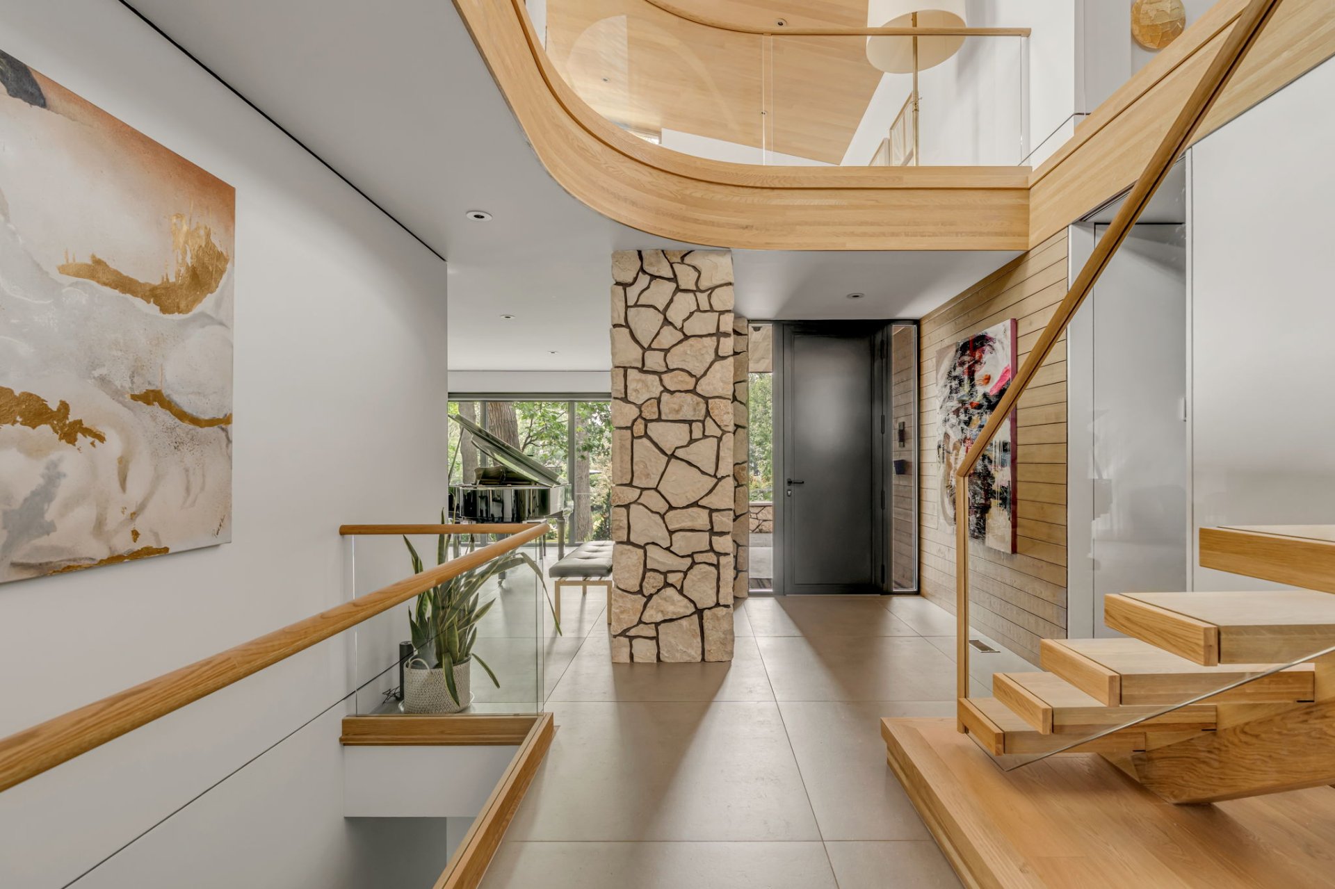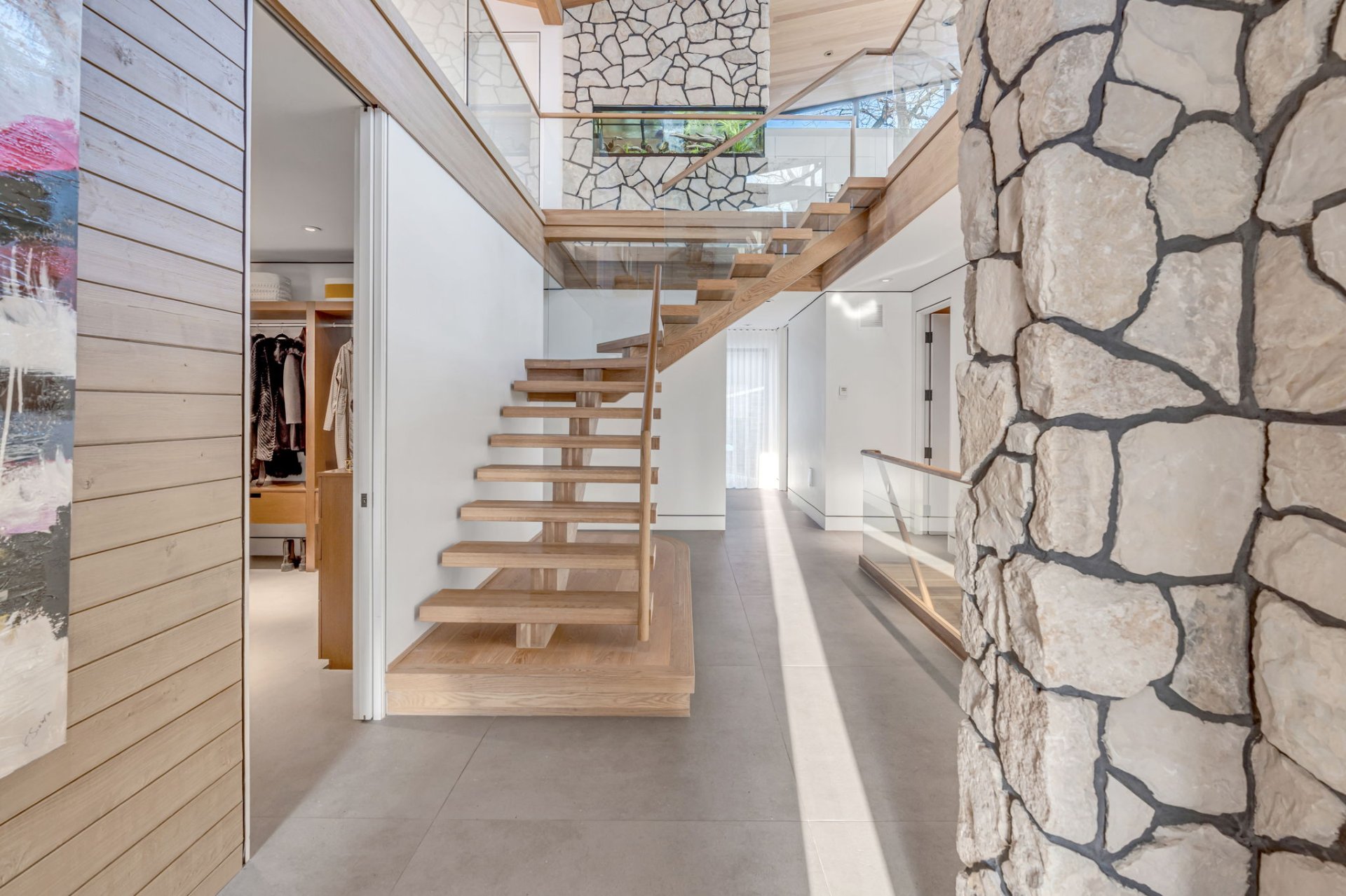 Dès l'entrée, l'escalier en bois massif mène à un aquarium à l'étage. À gauche, un grand vestibule avec mobilier intégré et un accès direct au garage. À l'arrière, la salle de lavage.