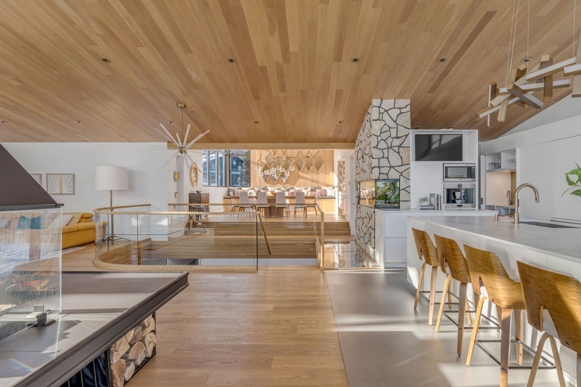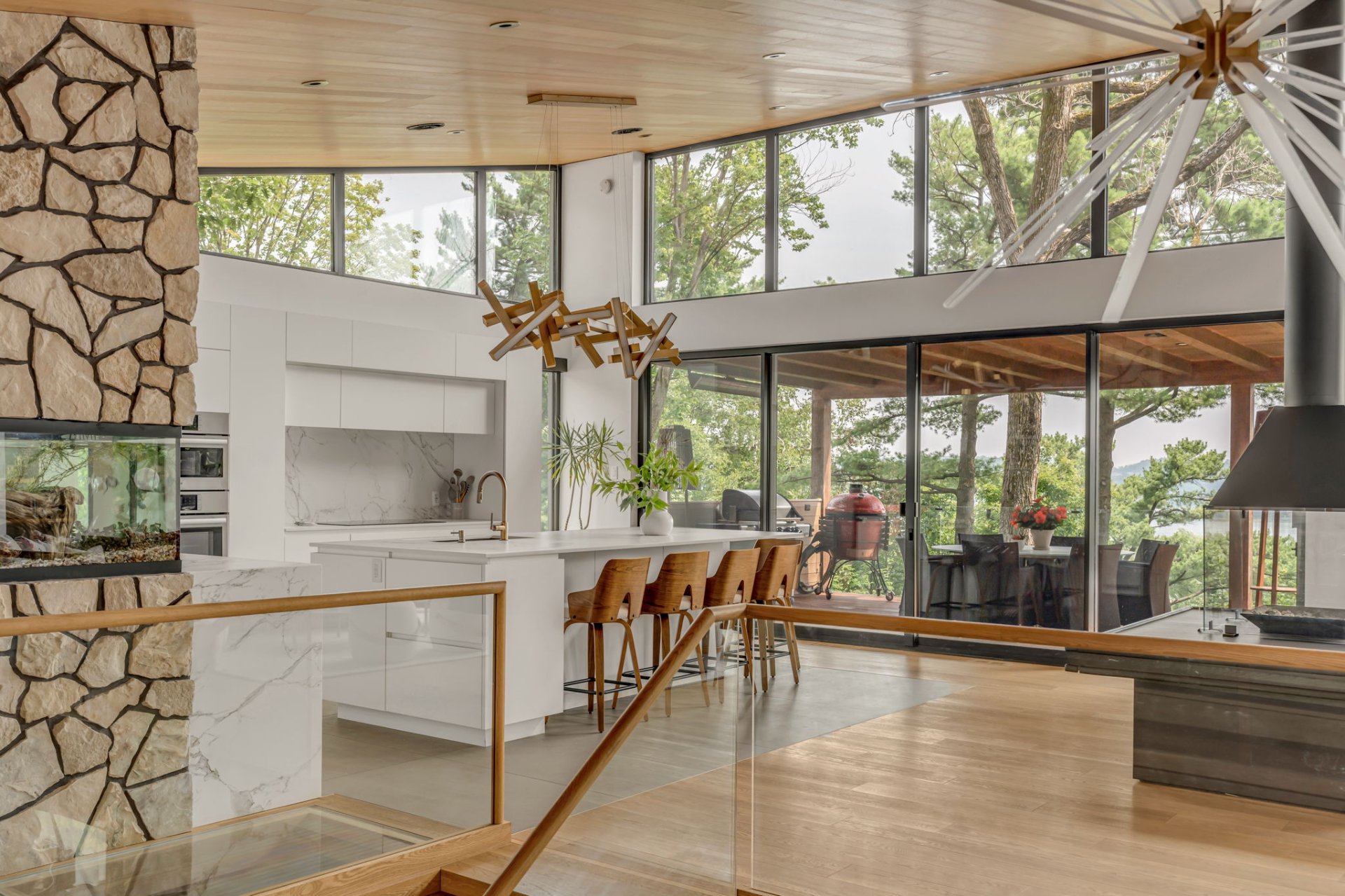 L' aquarium longe la passerelle en verre entre la cuisine et la salle à manger, visible depuis le vestibule.