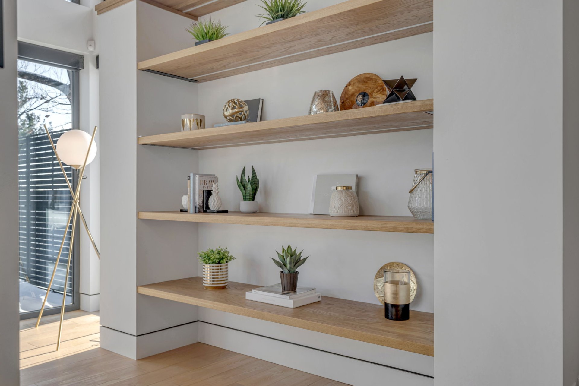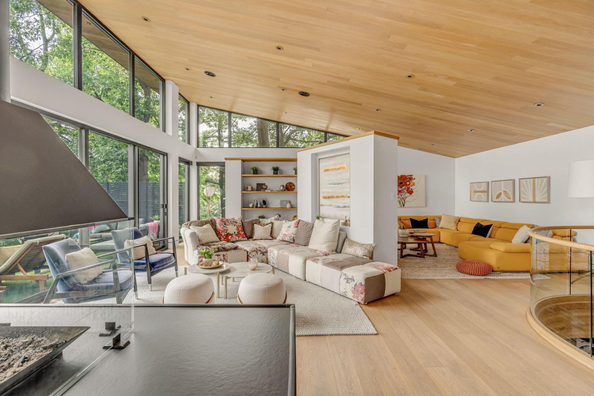 Escalier en bois massif avec garde-corps en verre courbé, apportant douceur et équilibre à l'architecture.