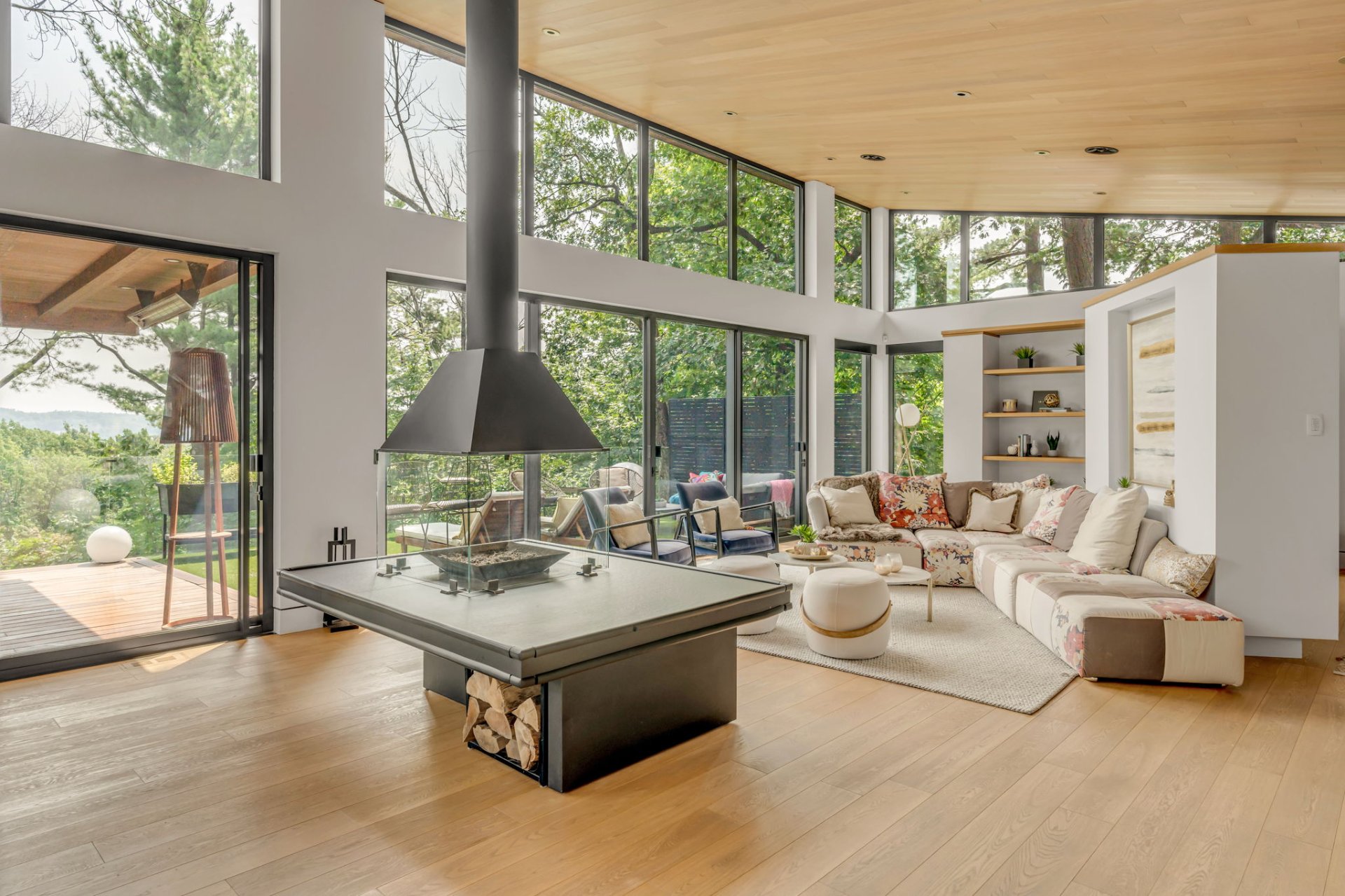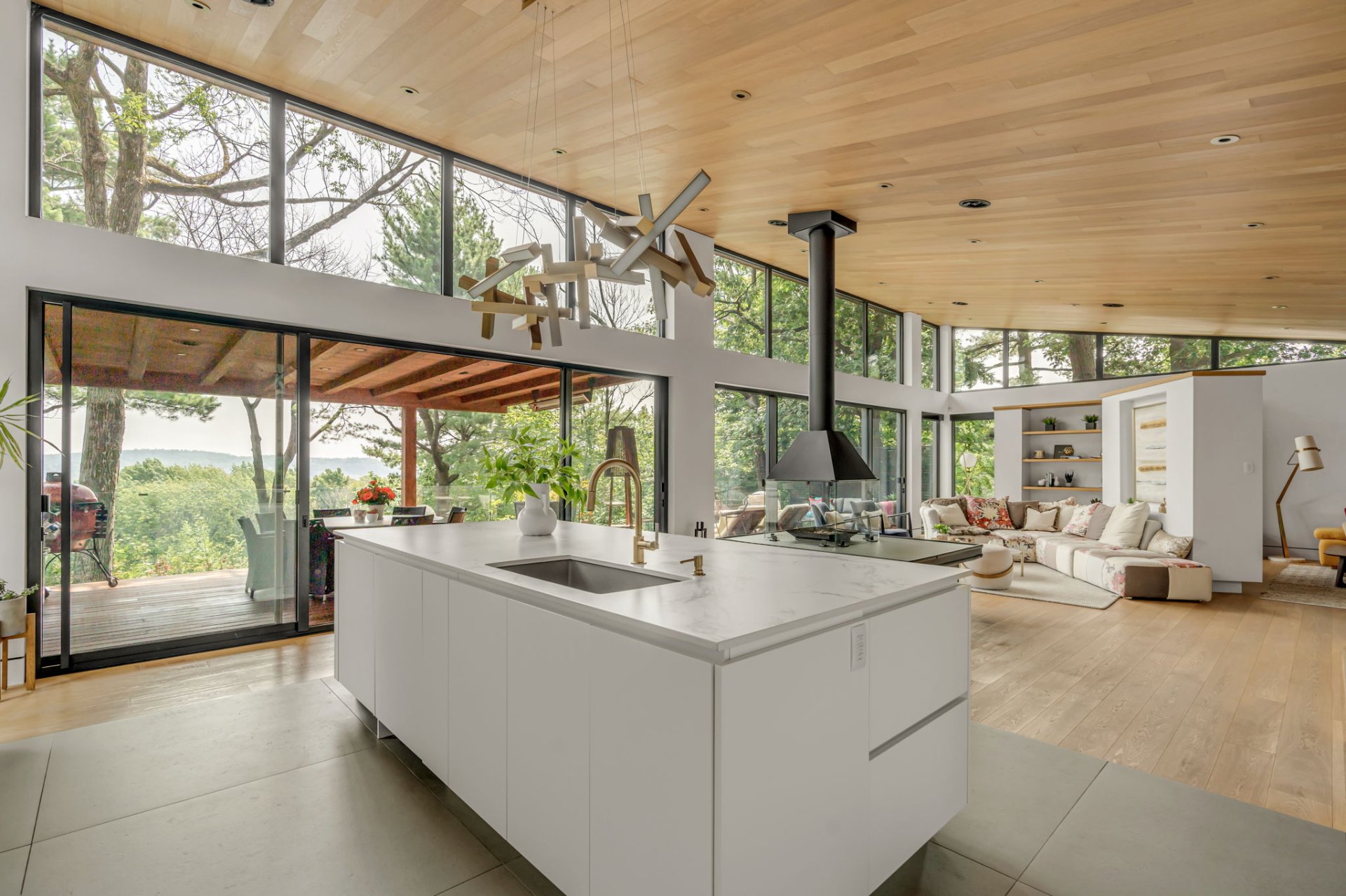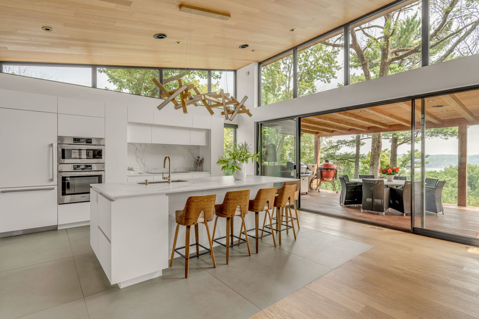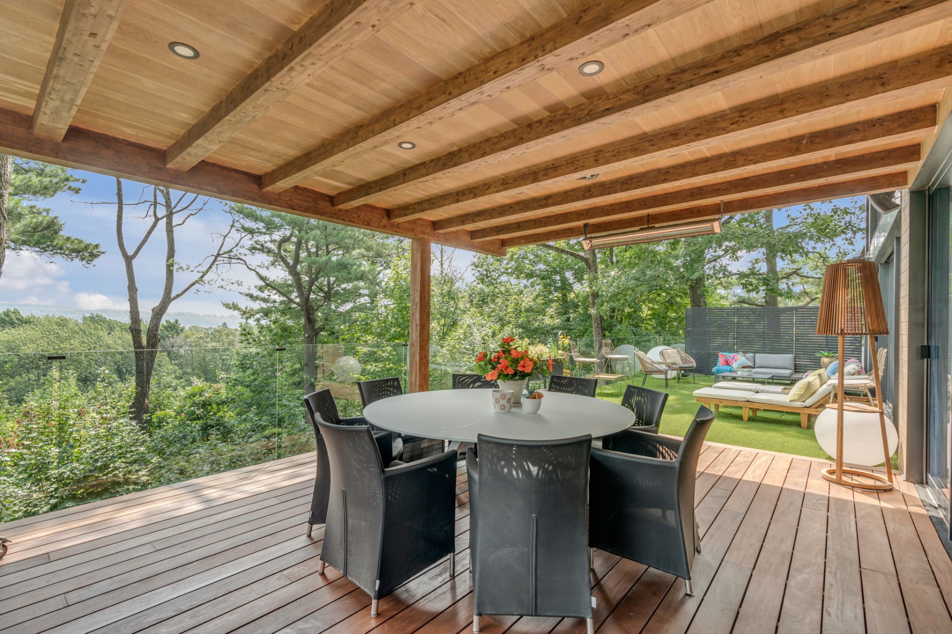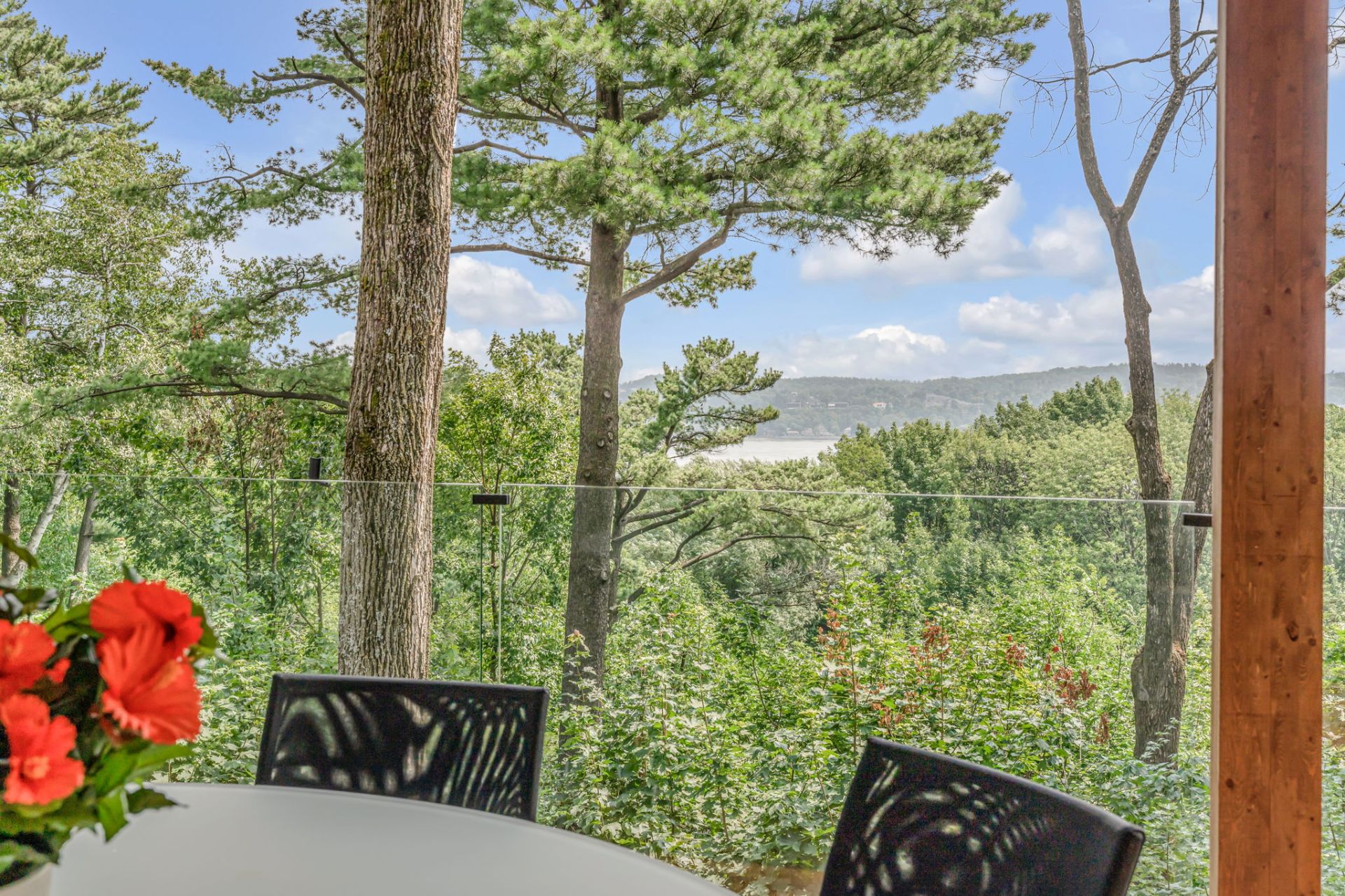 À l'étage, cet espace grandiose avec une toiture inversée offre une vue imprenable sur la verdure et le fleuve. Une terrasse en bois IP, orientée plein sud, est divisée en coin repas et détente. Le mur rideau sur deux étages maximise la lumière dans chacune des pièces.