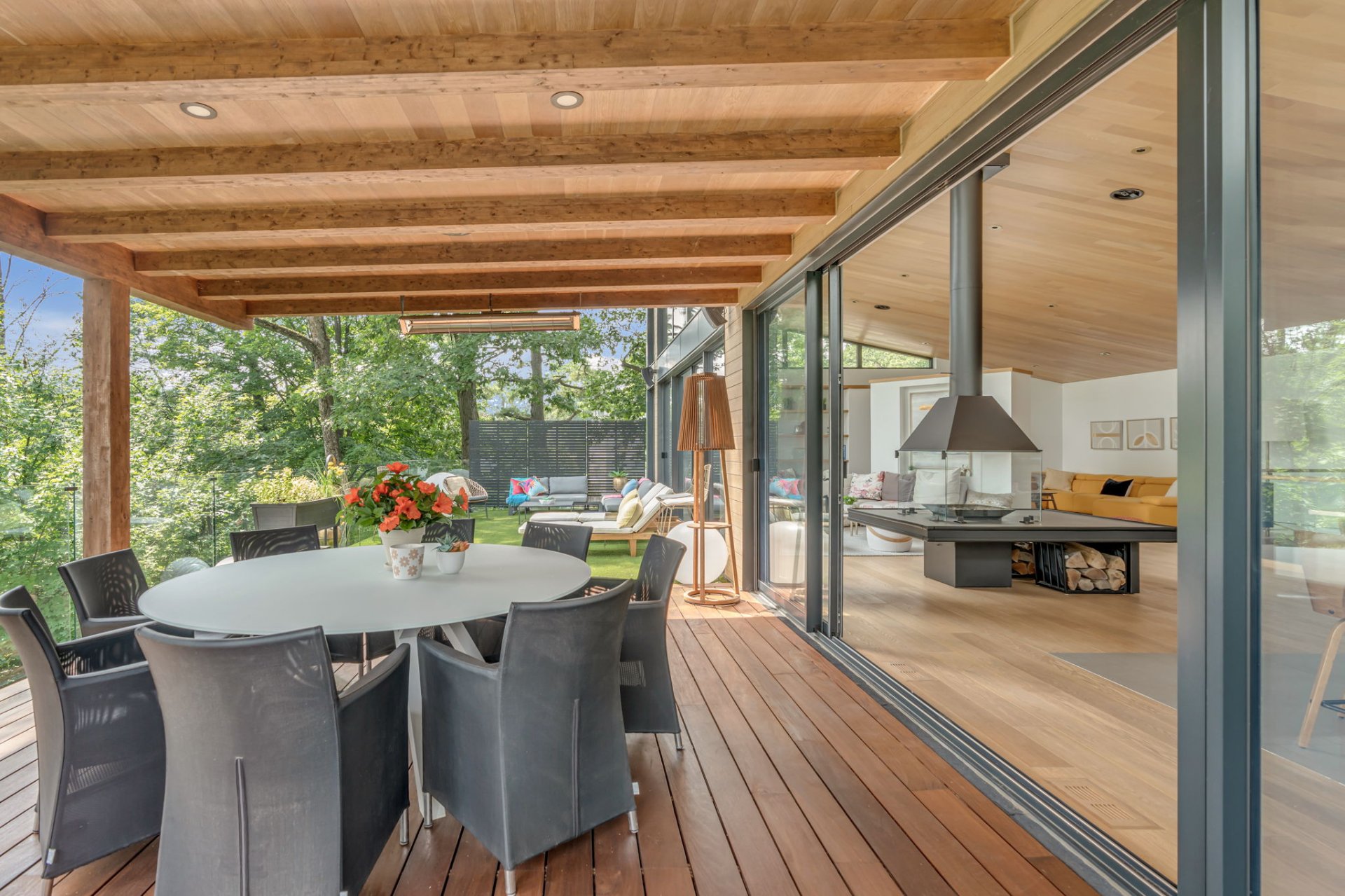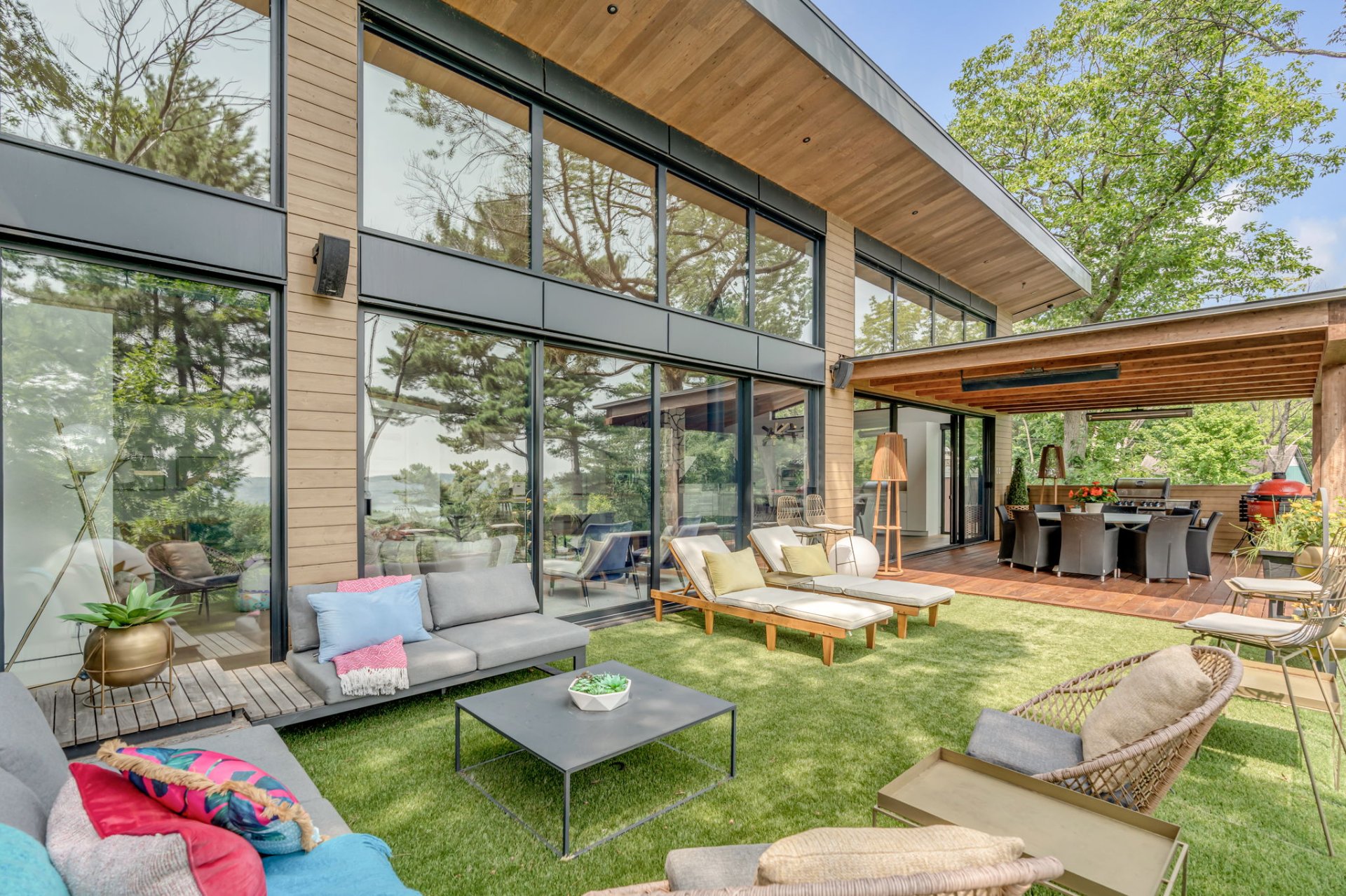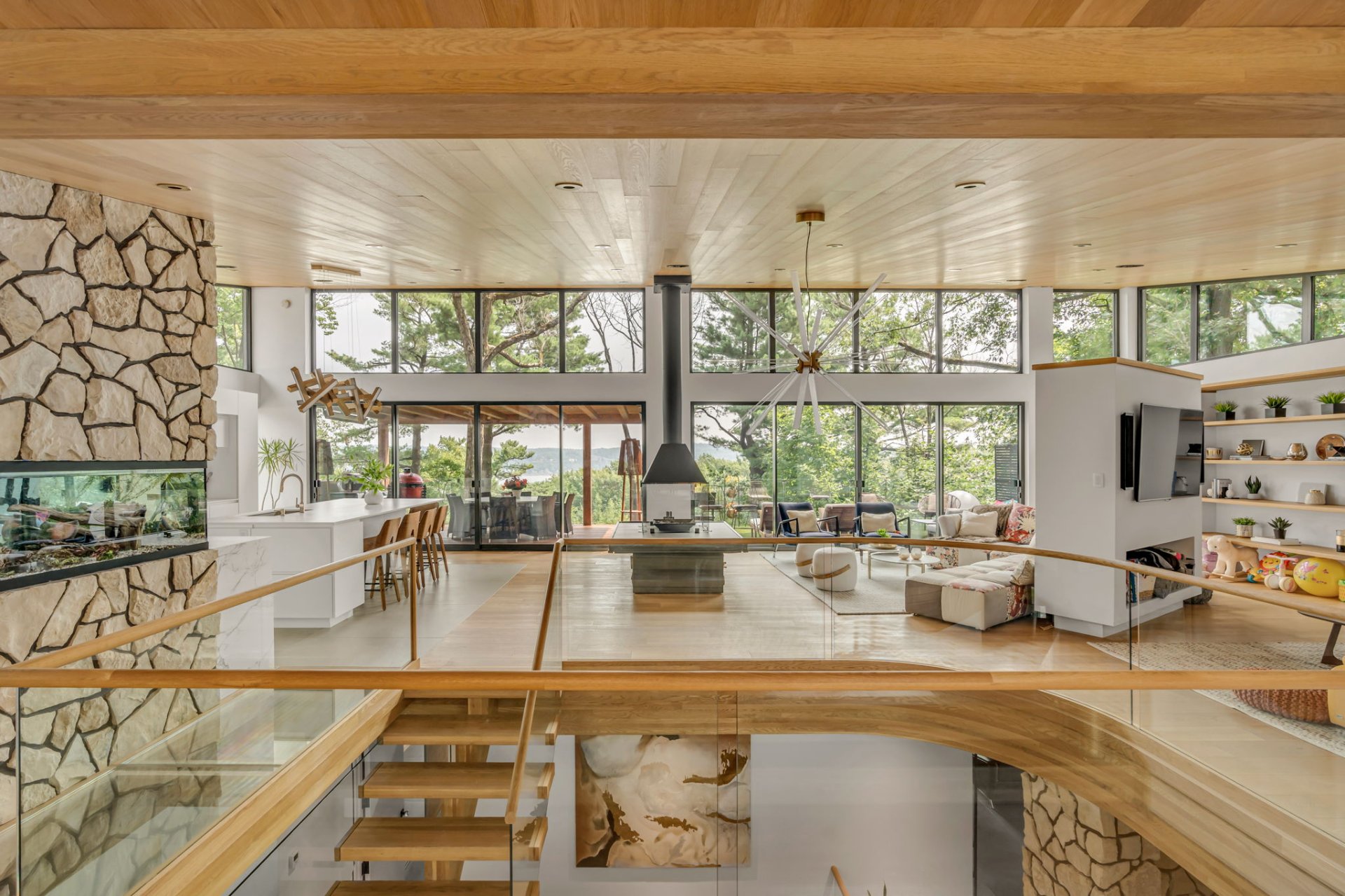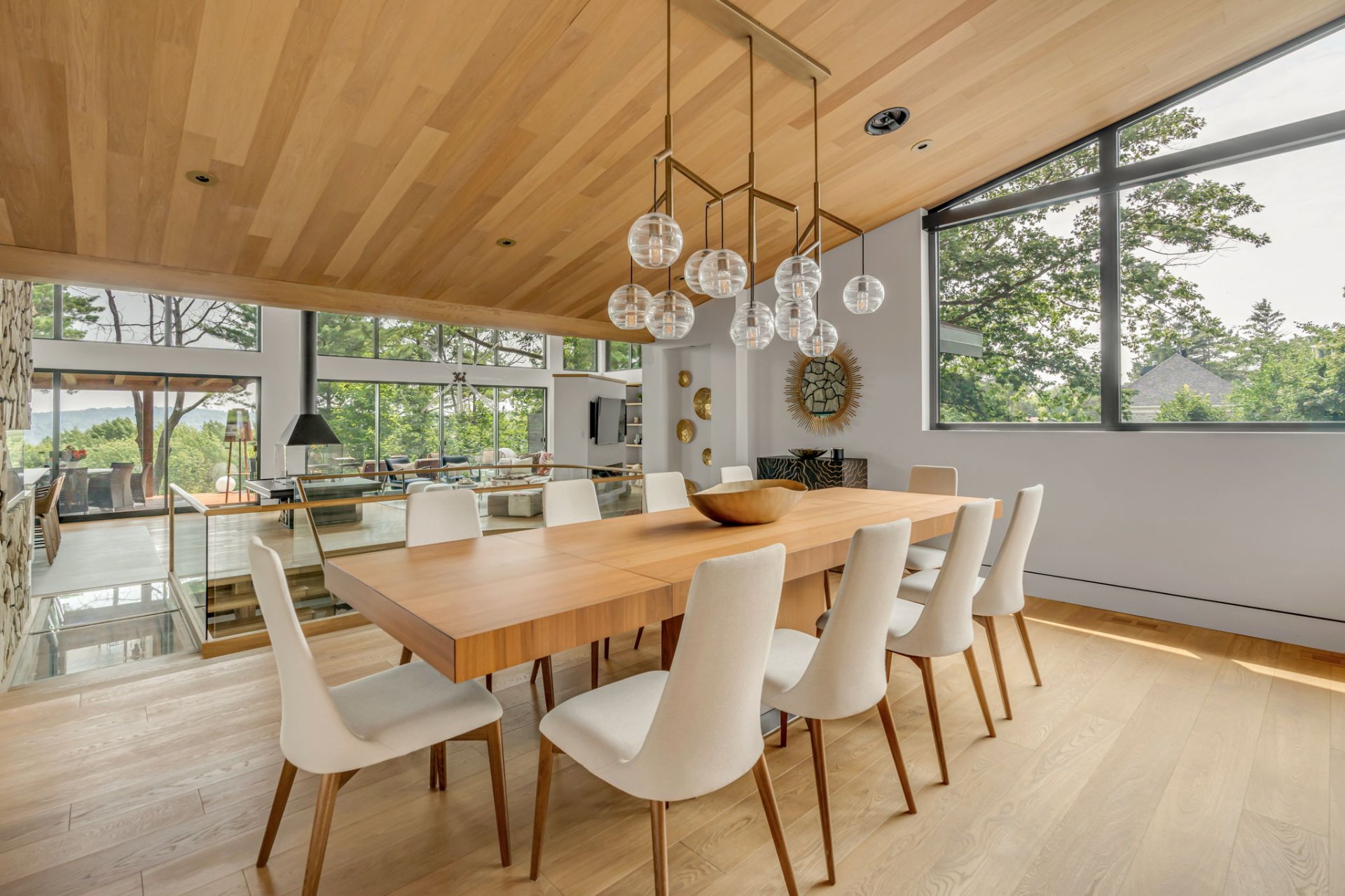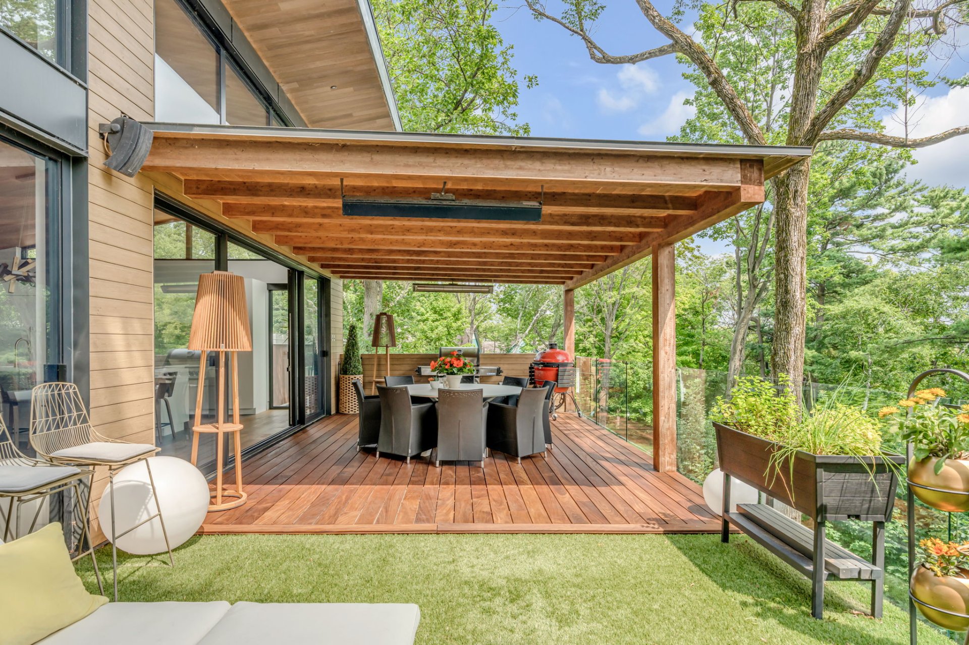À l'étage, cet espace grandiose avec une toiture inversée offre une vue imprenable sur la verdure et le fleuve. Une terrasse en bois IP, orientée plein sud, est divisée en coin repas et détente. Le mur rideau sur deux étages maximise la lumière dans chacune des pièces.