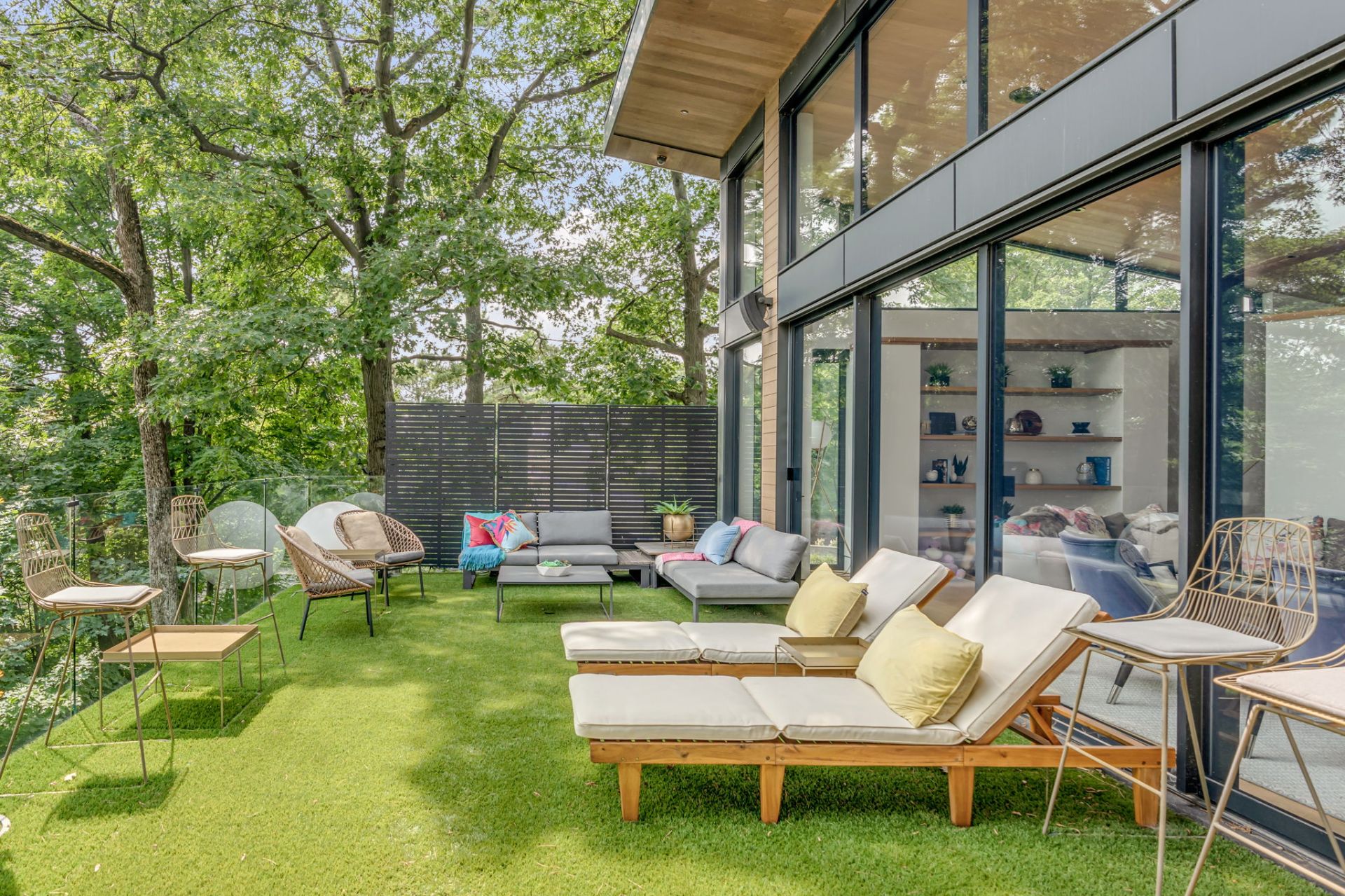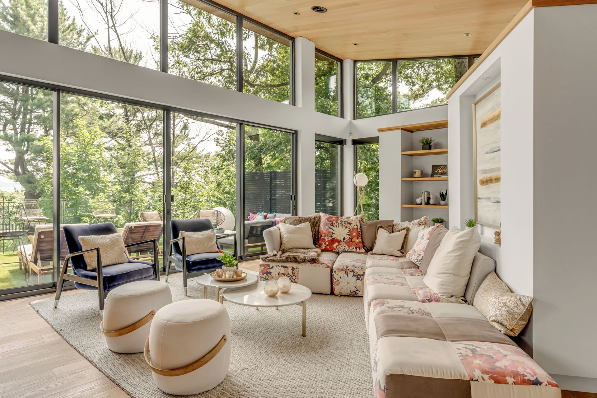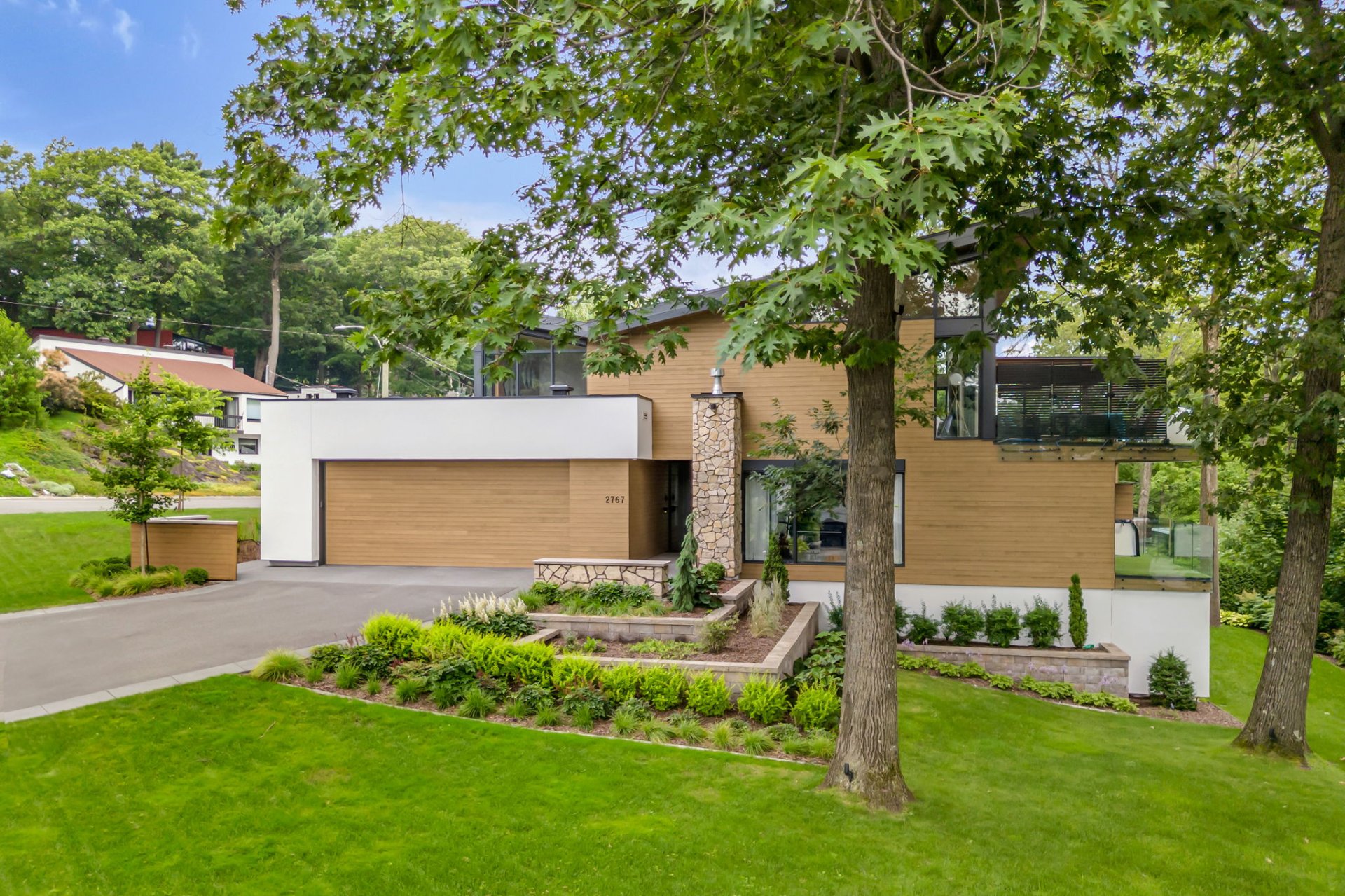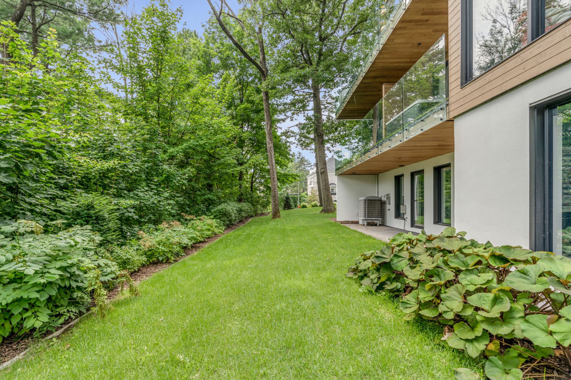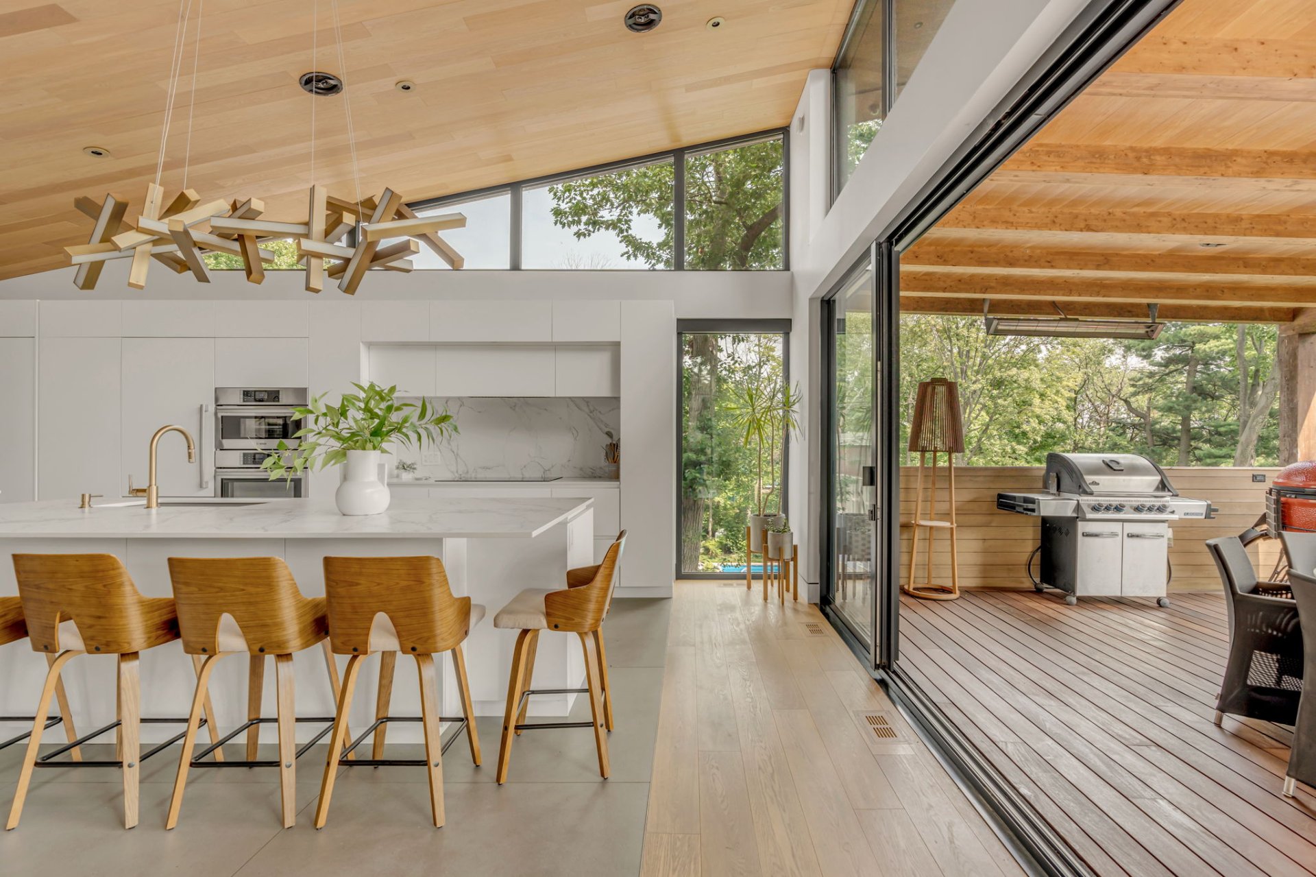 À l'étage, cet espace grandiose avec une toiture inversée offre une vue imprenable sur la verdure et le fleuve. Une terrasse en bois IP, orientée plein sud, est divisée en coin repas et détente. Le mur rideau sur deux étages maximise la lumière dans chacune des pièces.