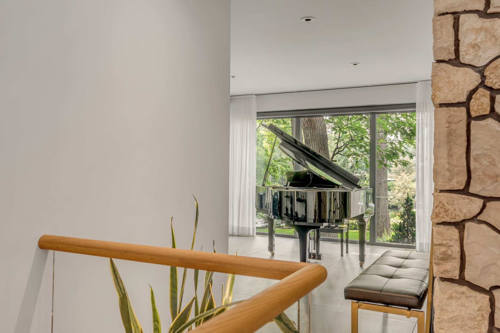 Salle de musique au rez-de-chaussée avec foyer au gaz et murs en pierre naturelle, idéale pour les soirées cinéma. Accès à une terrasse.