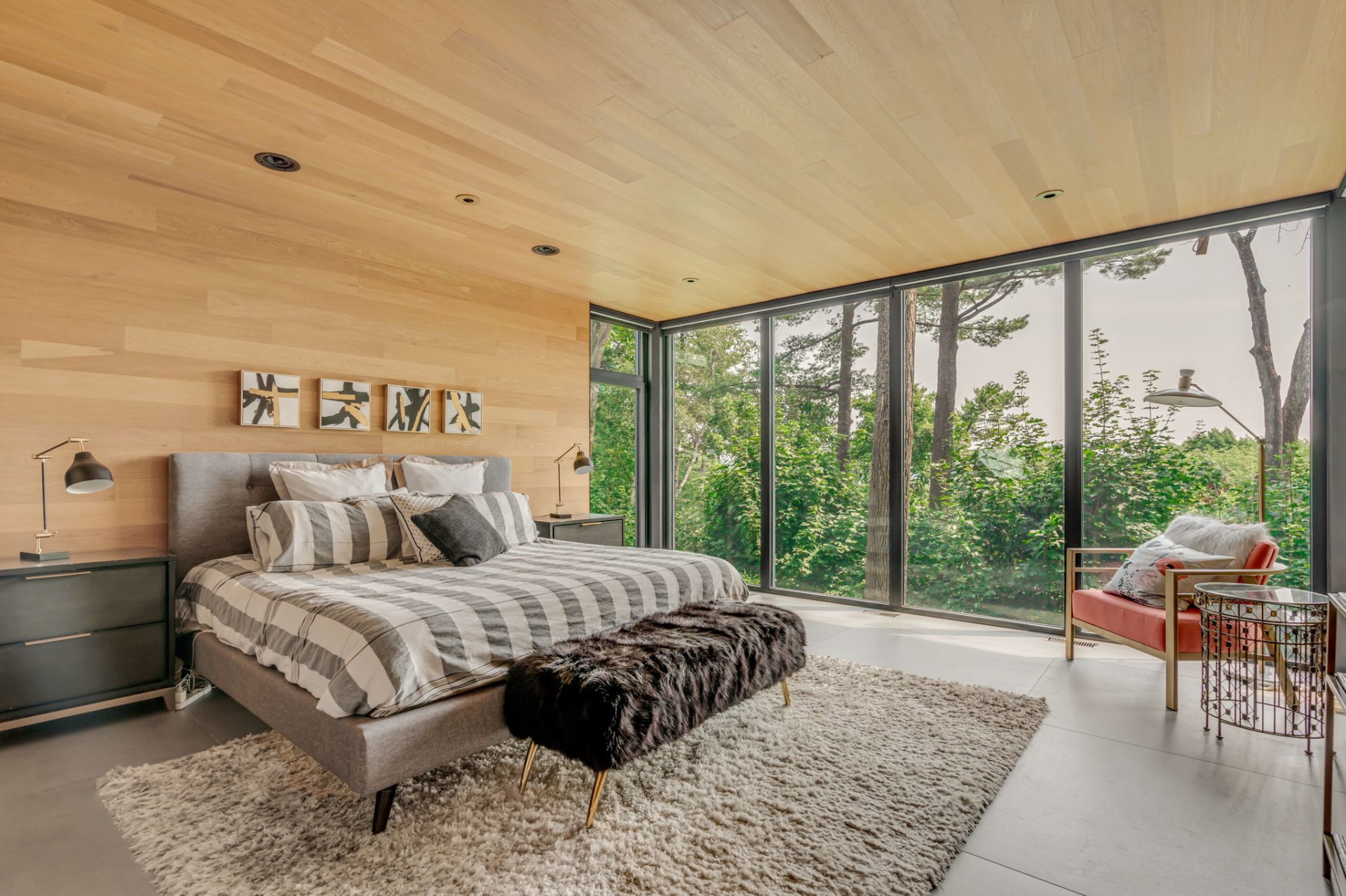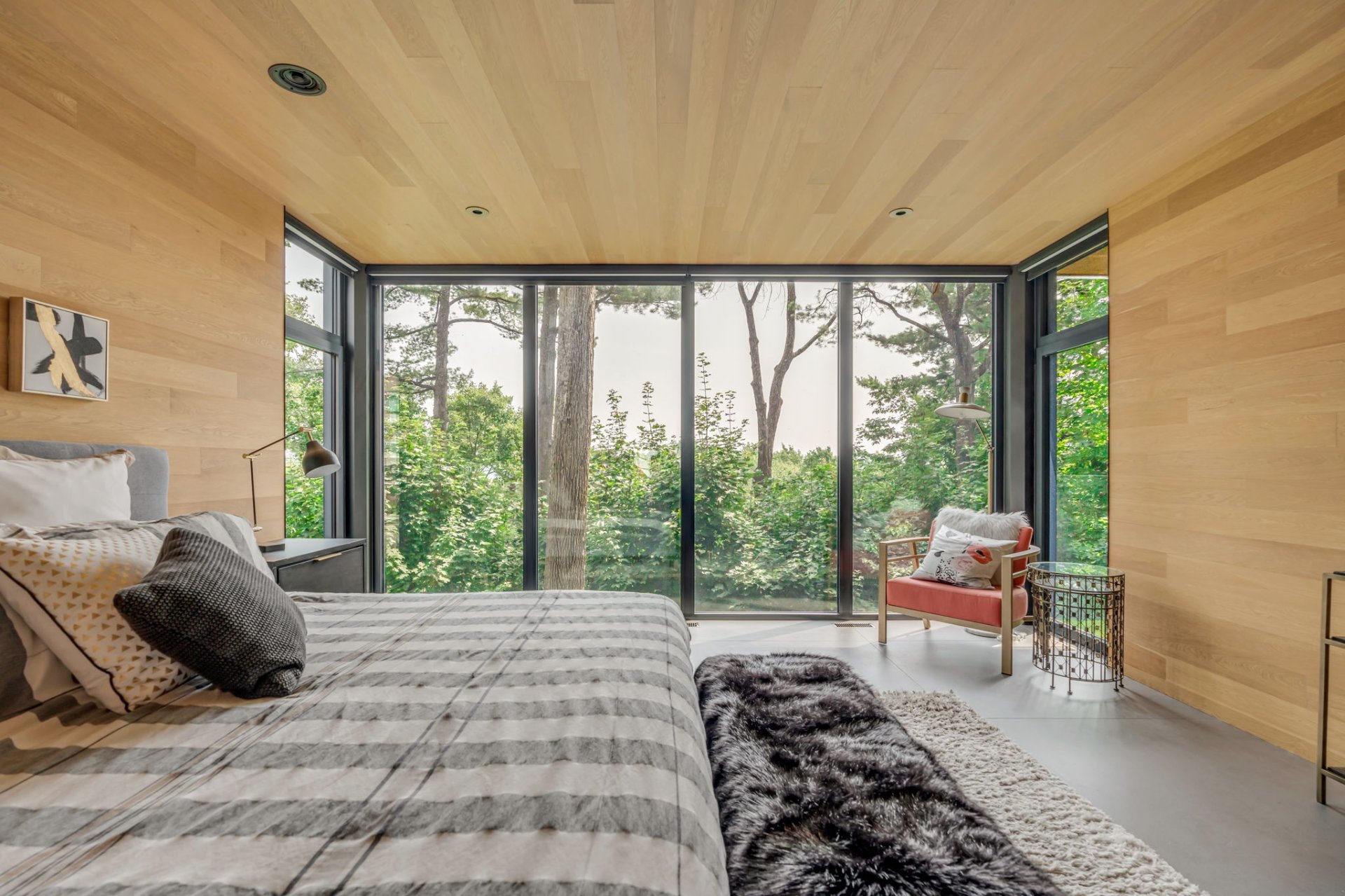 Suite parentale avec vue sur la nature, murs et plafonds en bois. Grand walk-in et salle de bain avec bain podium en bois, donnant accès à une terrasse avec spa.