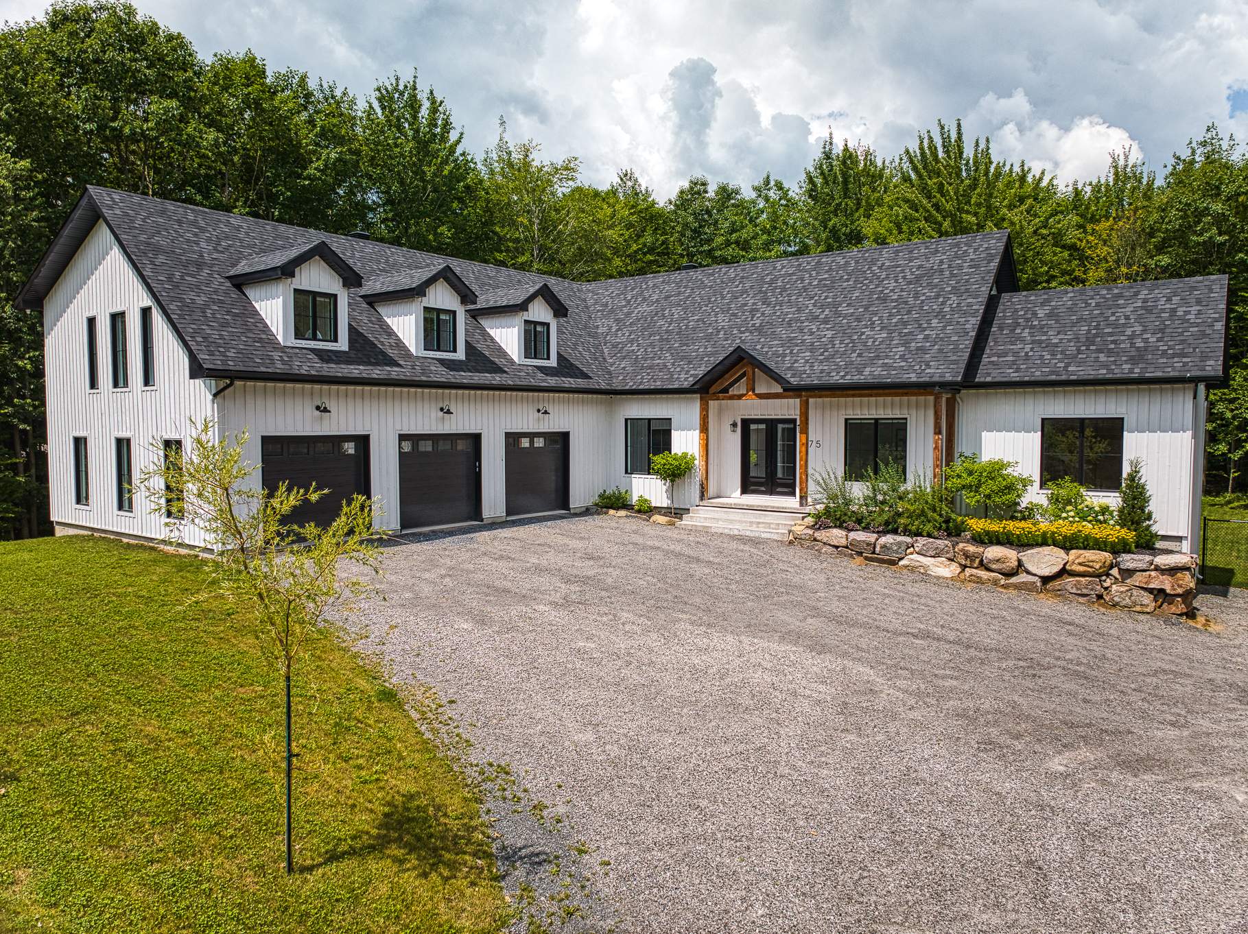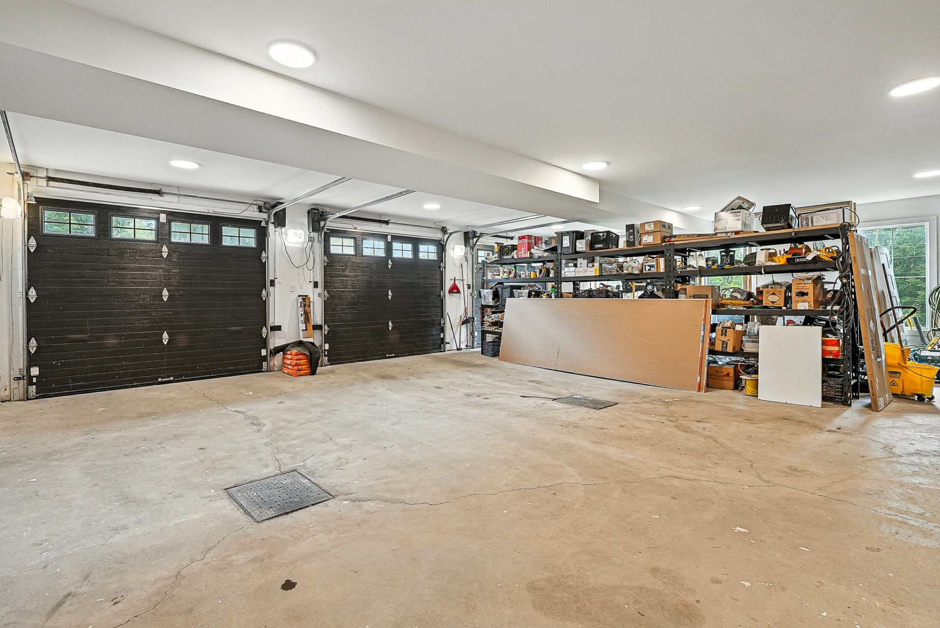 -Le garage équipé de trois portes pouvant y accueillir plusieurs véhicules, avec de l'espace bien optimisée pouvant servir d'atelier ou de rangement supplémentaire.
