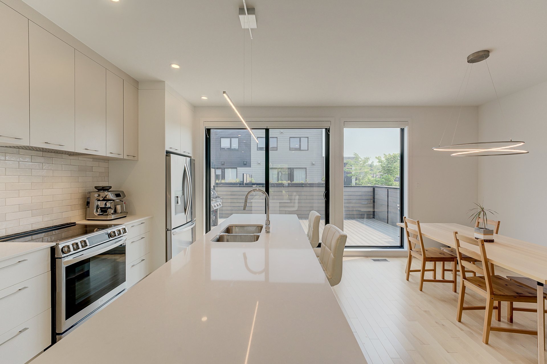 Répartie sur trois étages soigneusement aménagés, la propriété propose une superficie habitable généreuse et bien pensée. Le rez-de-chaussée à aire ouverte met en valeur un plafond de 9 pieds, un vaste salon, une salle à manger conviviale et une cuisine moderne avec îlot central, comptoirs en quartz et beaucoup de rangement. Une terrasse intime, accessible depuis l'espace repas, permet de profiter pleinement des belles journées d'été.