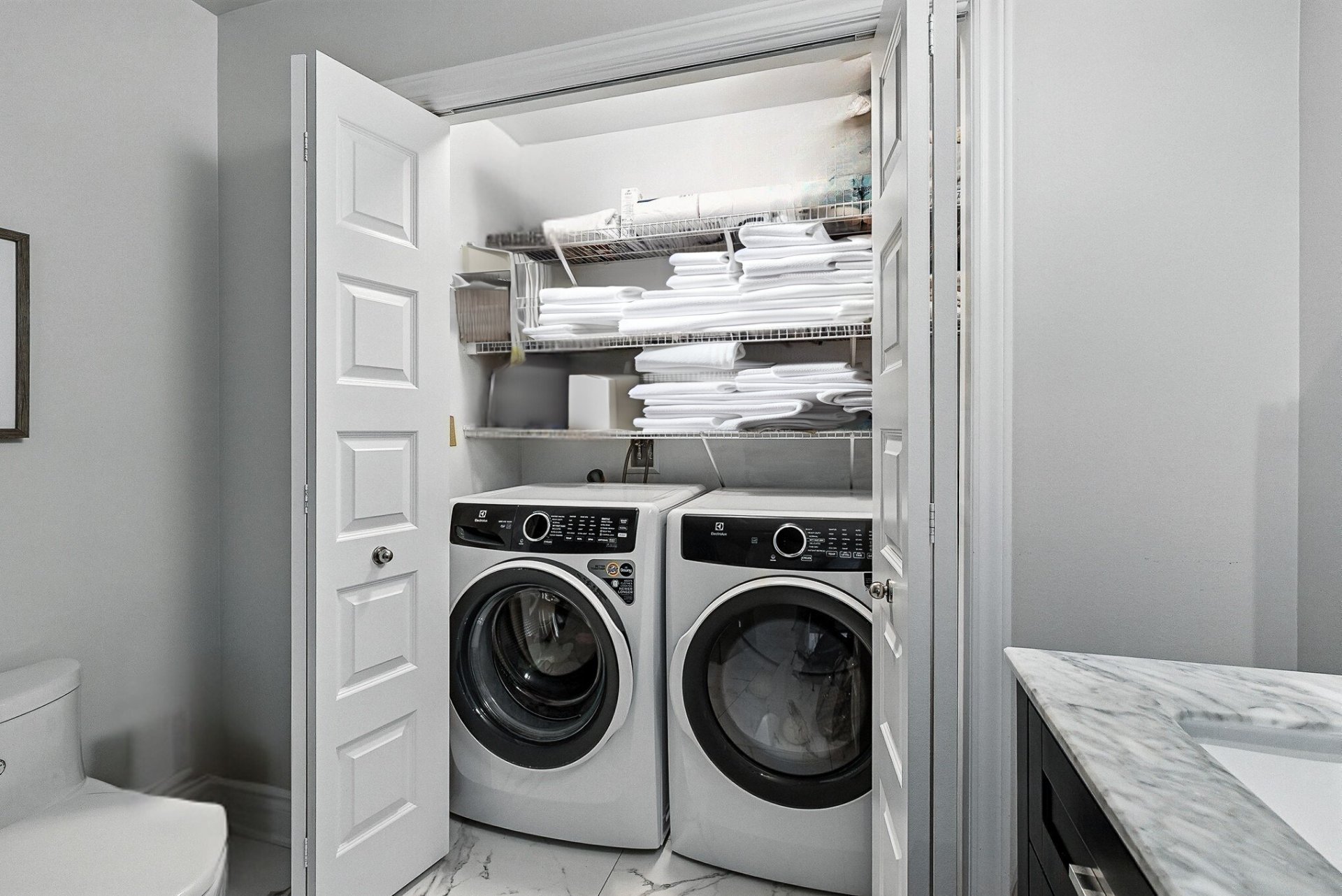 Une deuxième chambre spacieuse, une deuxième salle de bain avec douche vitrée ainsi qu'une buanderie séparée complètent l'aménagement avec confort et commodité.