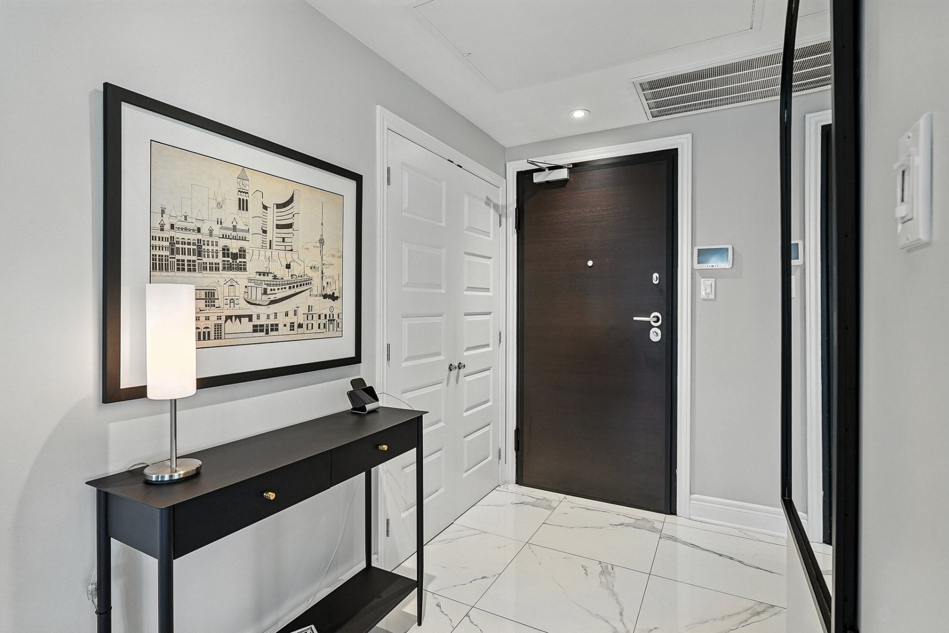 La porte d'entrée du condo, en bois et acier avec système de verrouillage multiple, rehausse la sécurité.