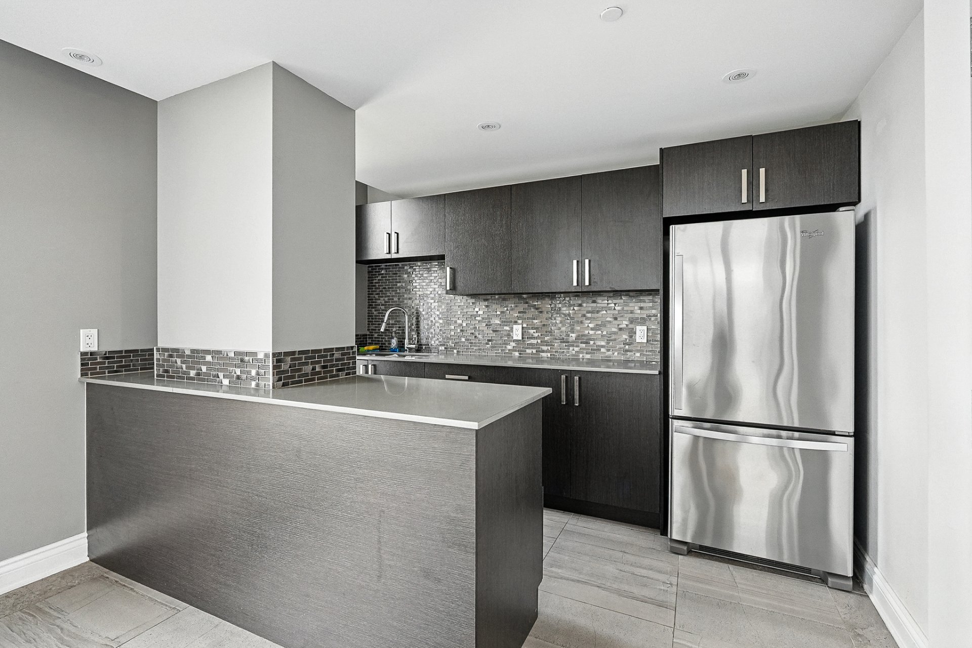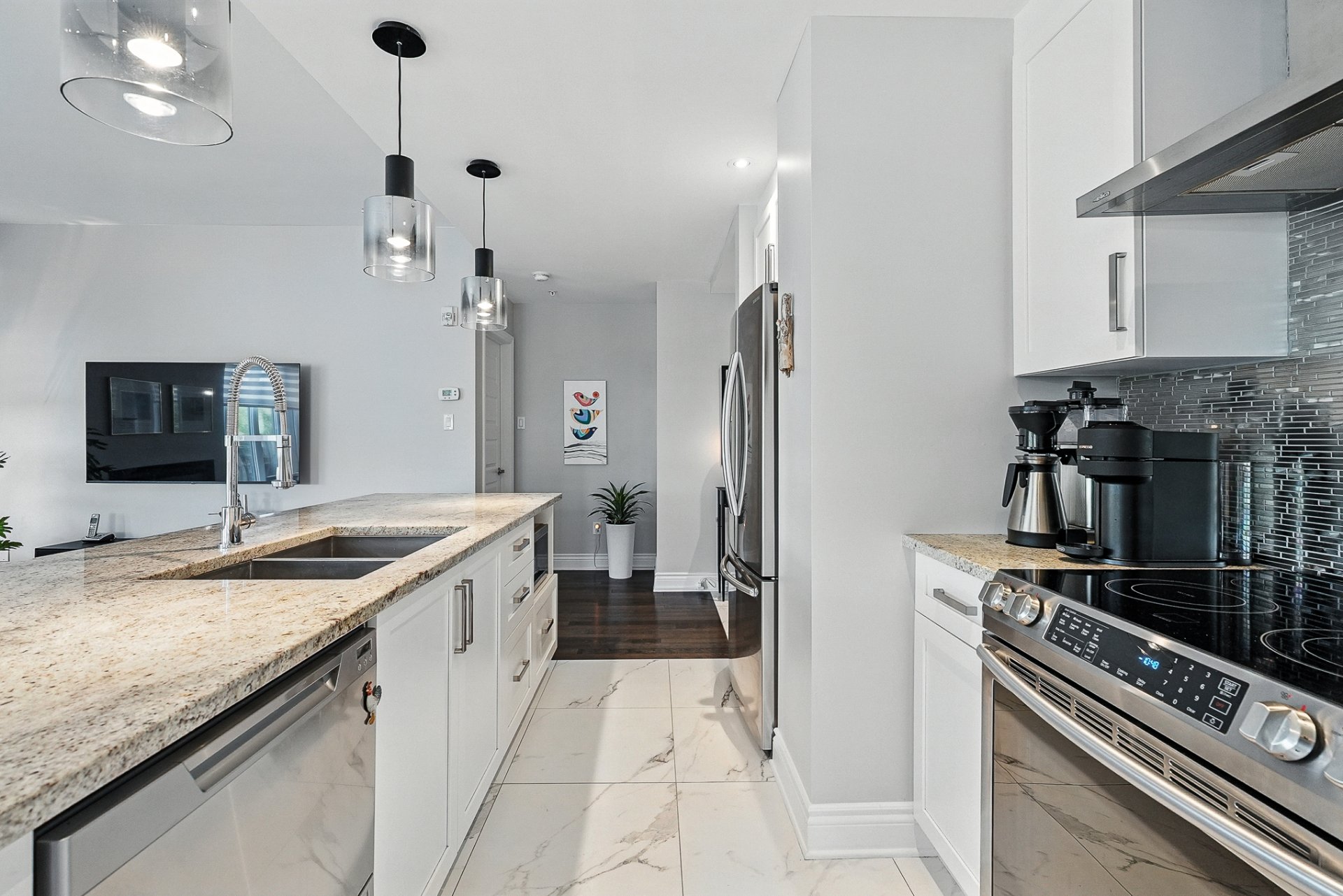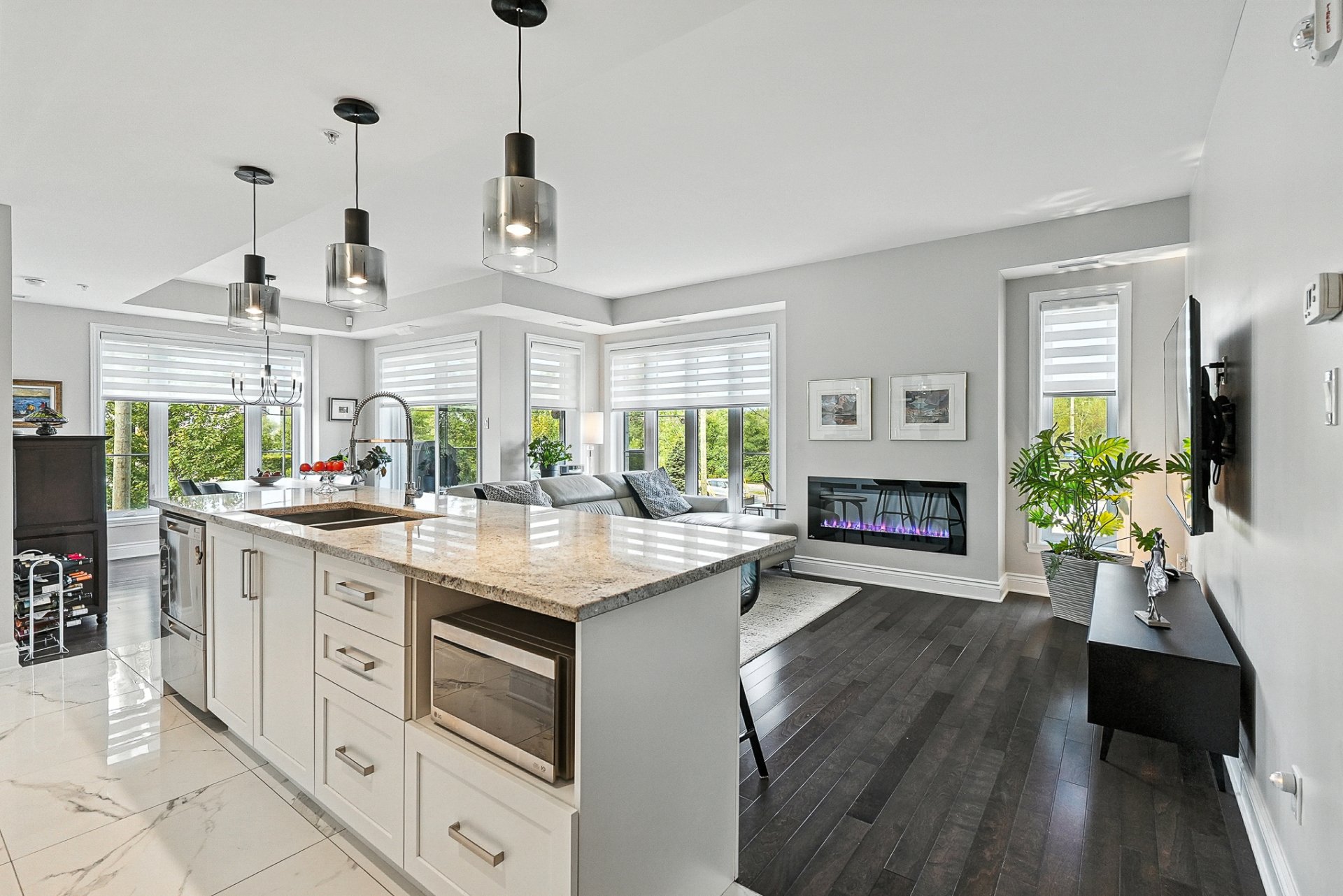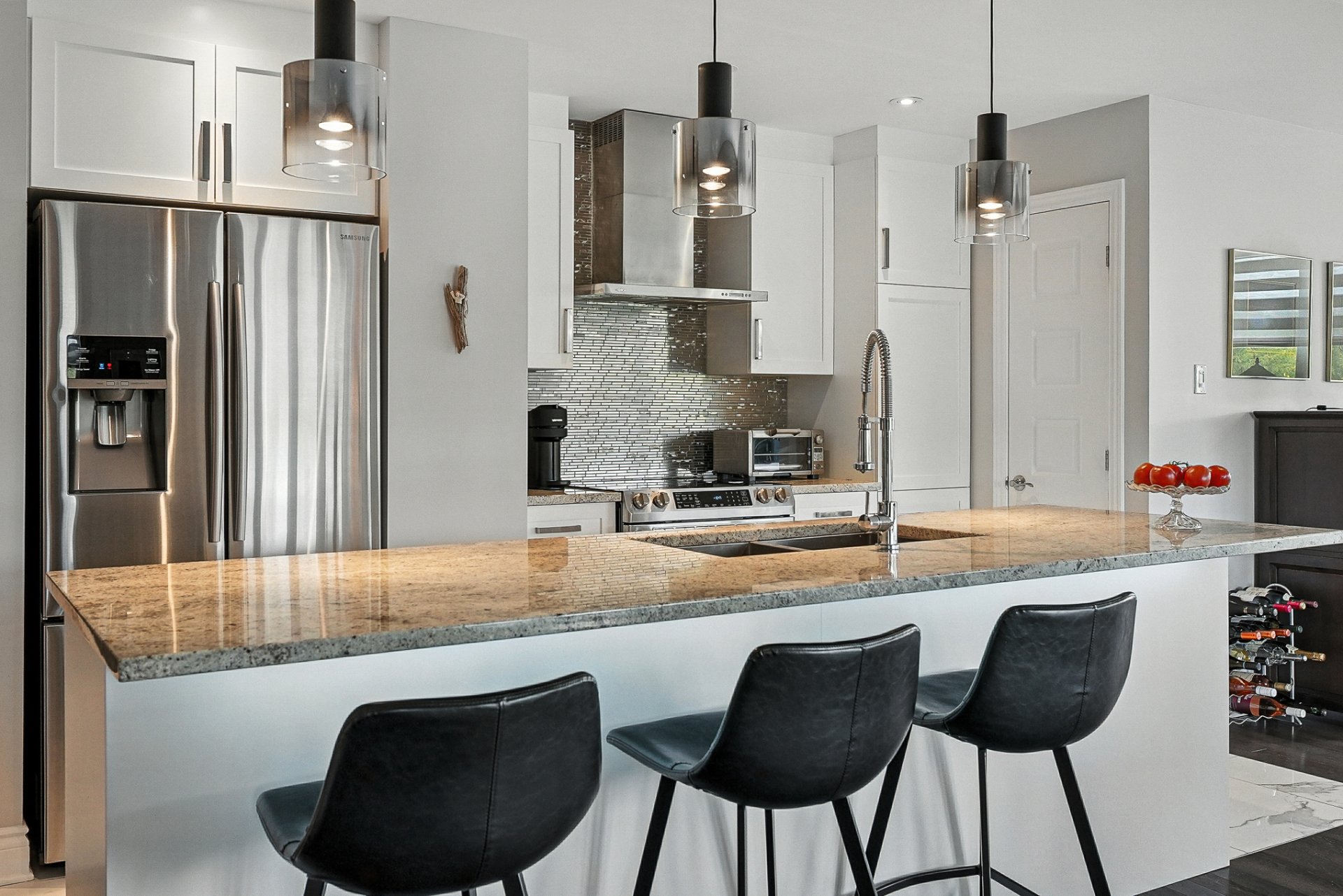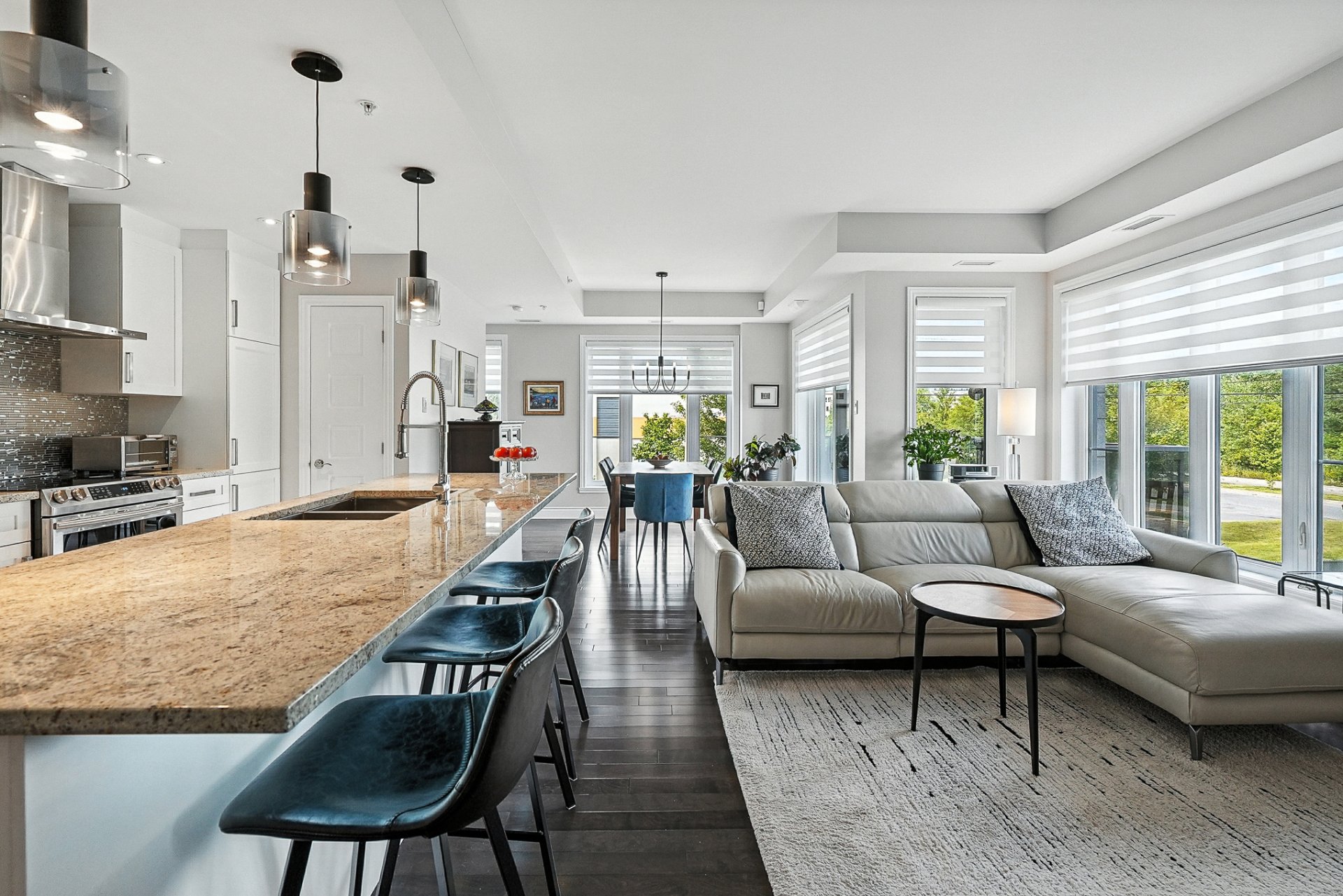 - Une cuisine moderne et élégante avec un vaste îlot central surmonté de comptoirs en granit et de nombreux rangements