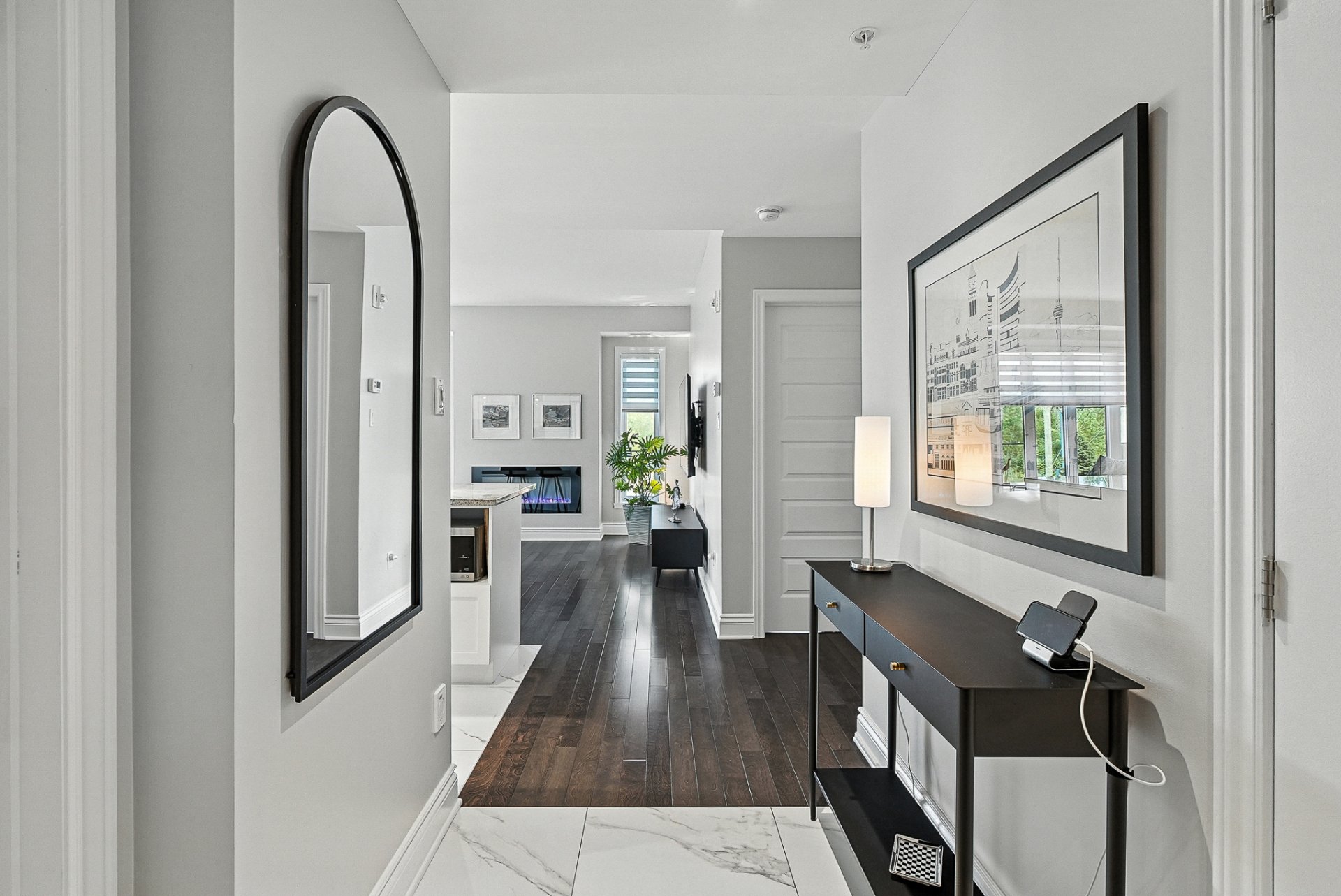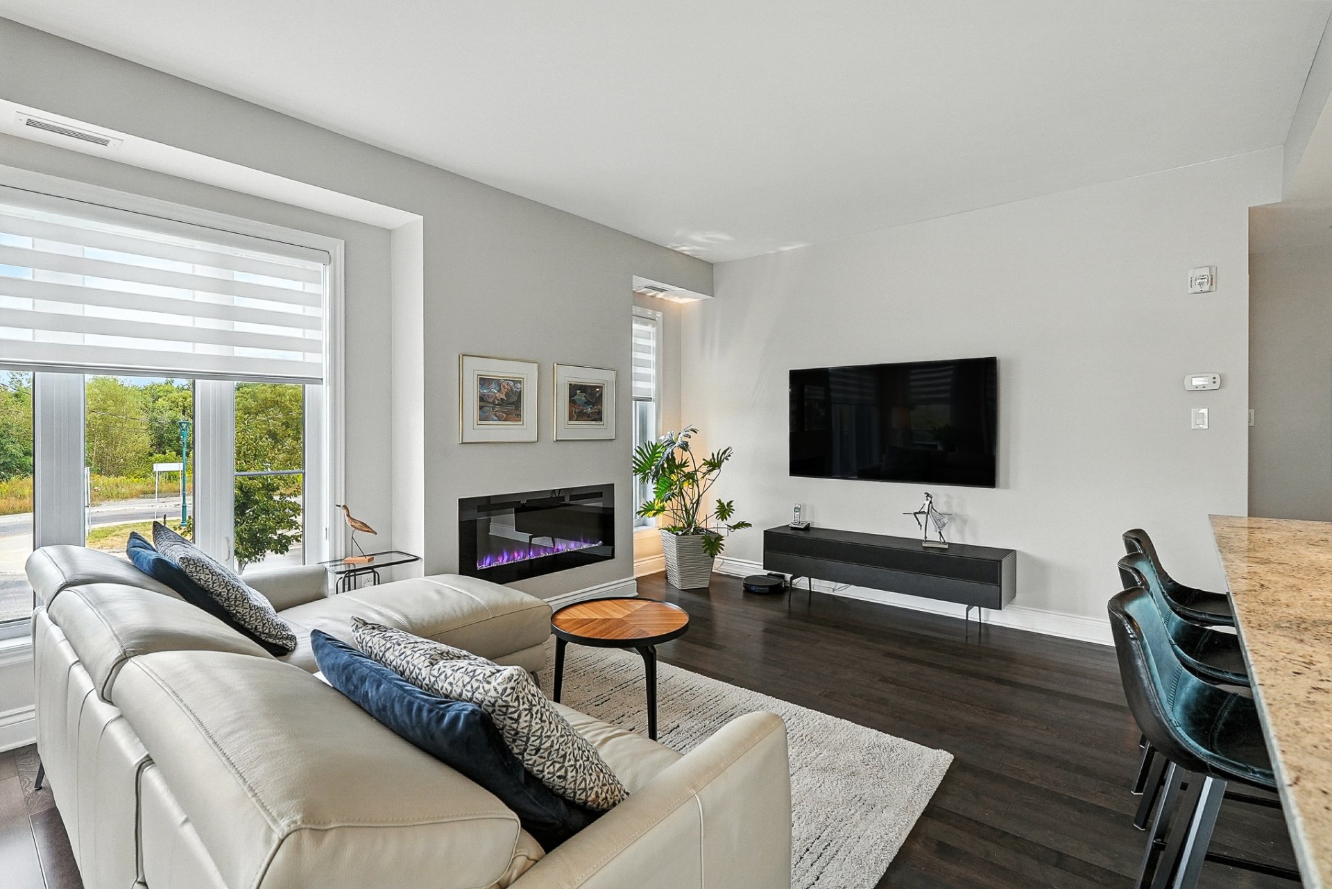 - Un salon lumineux agrémenté d'un foyer électrique