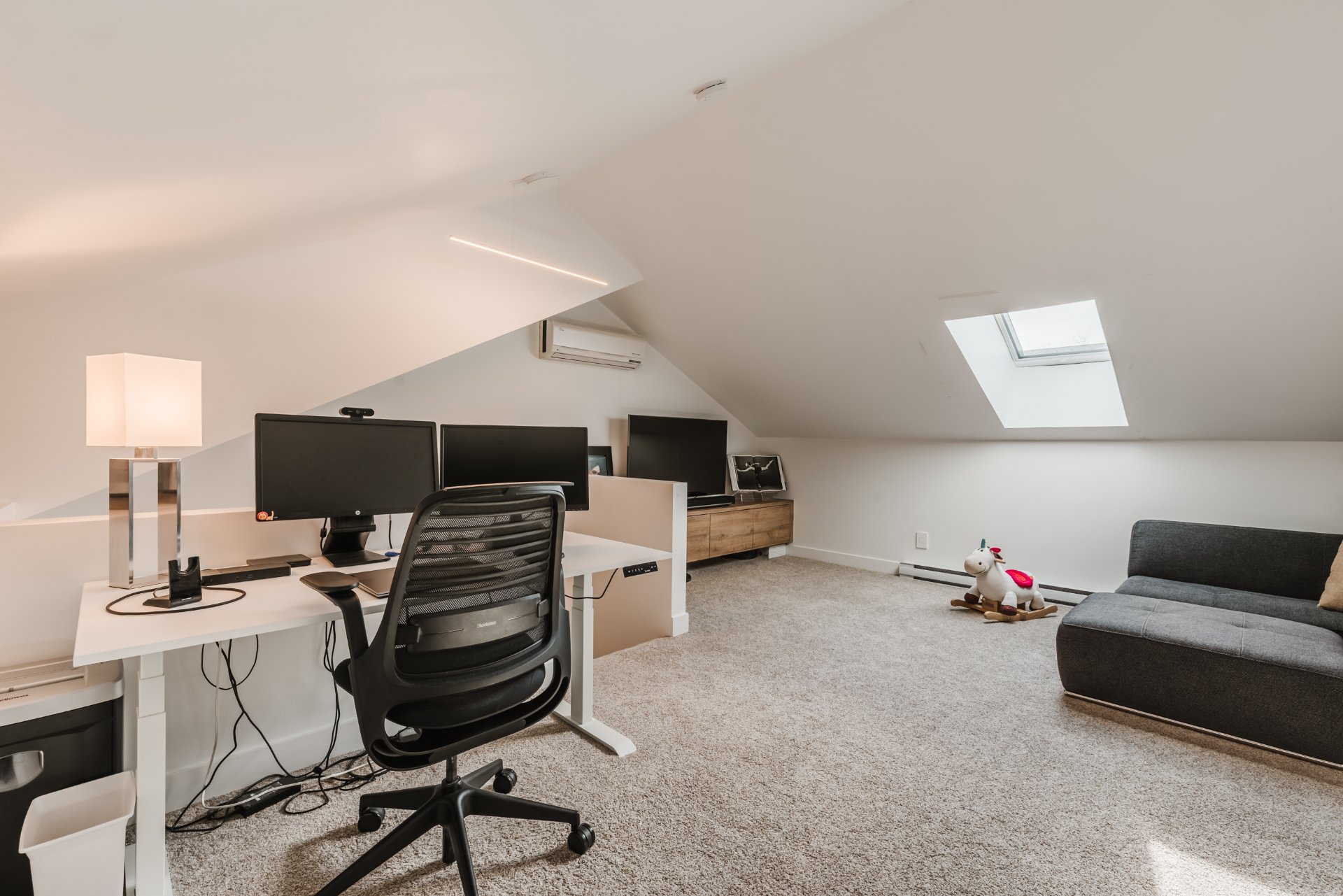 - Luminaire suspendu au-dessus de la table de la salle à manger, matelas du lit mural dans la mezzanine, laveuse et sécheuse, système d'accrochage de cadres, grand miroir dans la chambre à coucher principale.