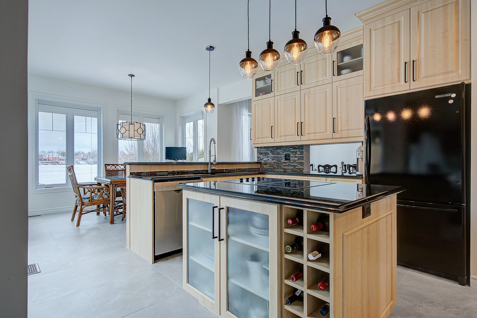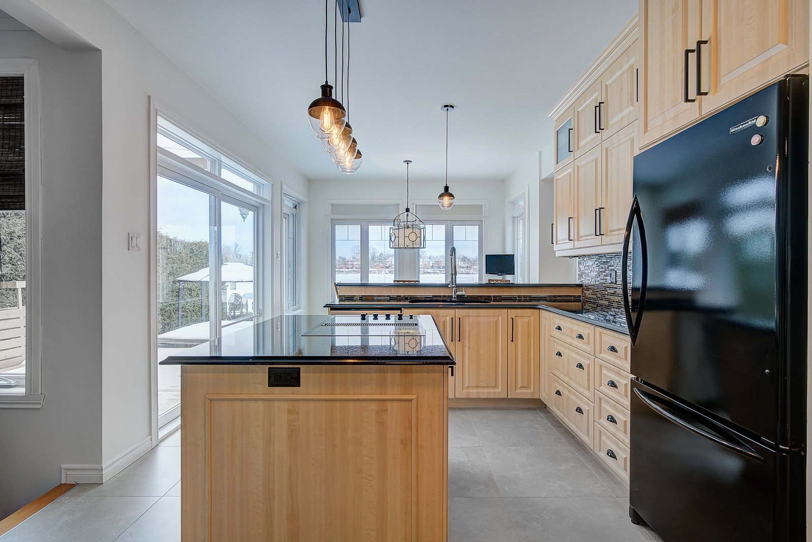 *Cuisine fonctionnelle avec îlot central, comptoir en granite et coin-lunch