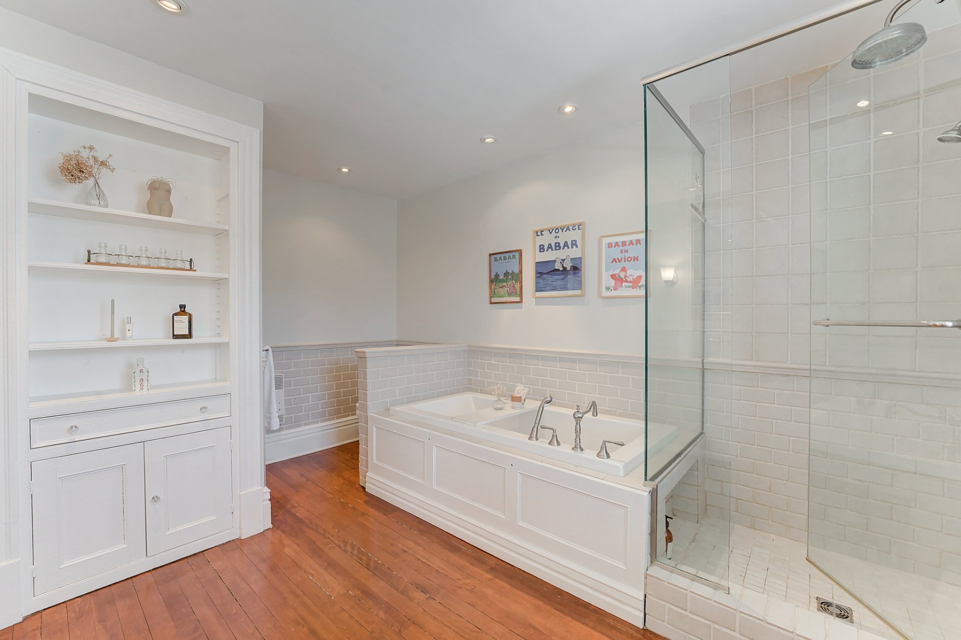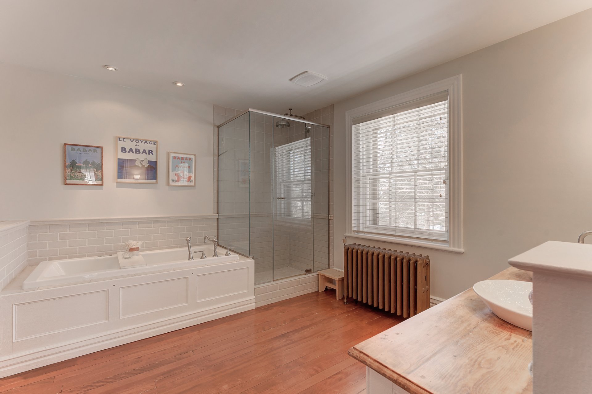 À l'étage, trois chambres spacieuses, dont une avec balcon privé, ainsi qu'une salle de bain rénovée avec douche vitrée et baignoire indépendante.