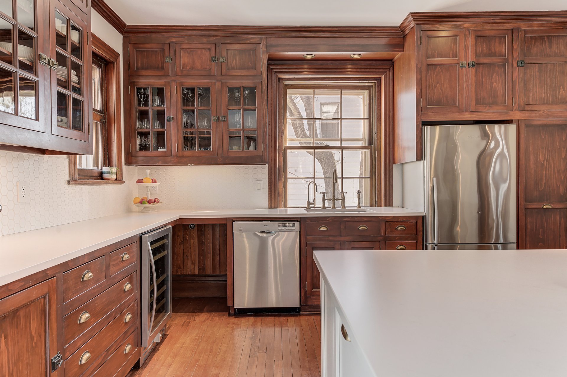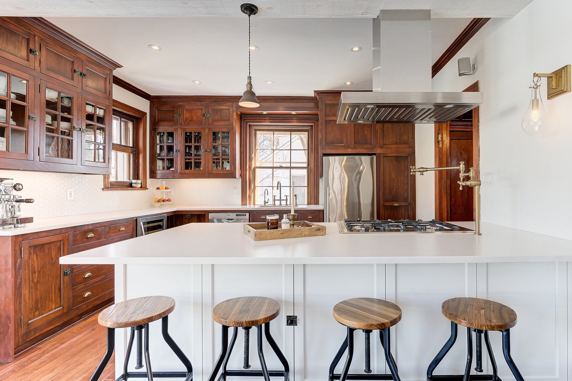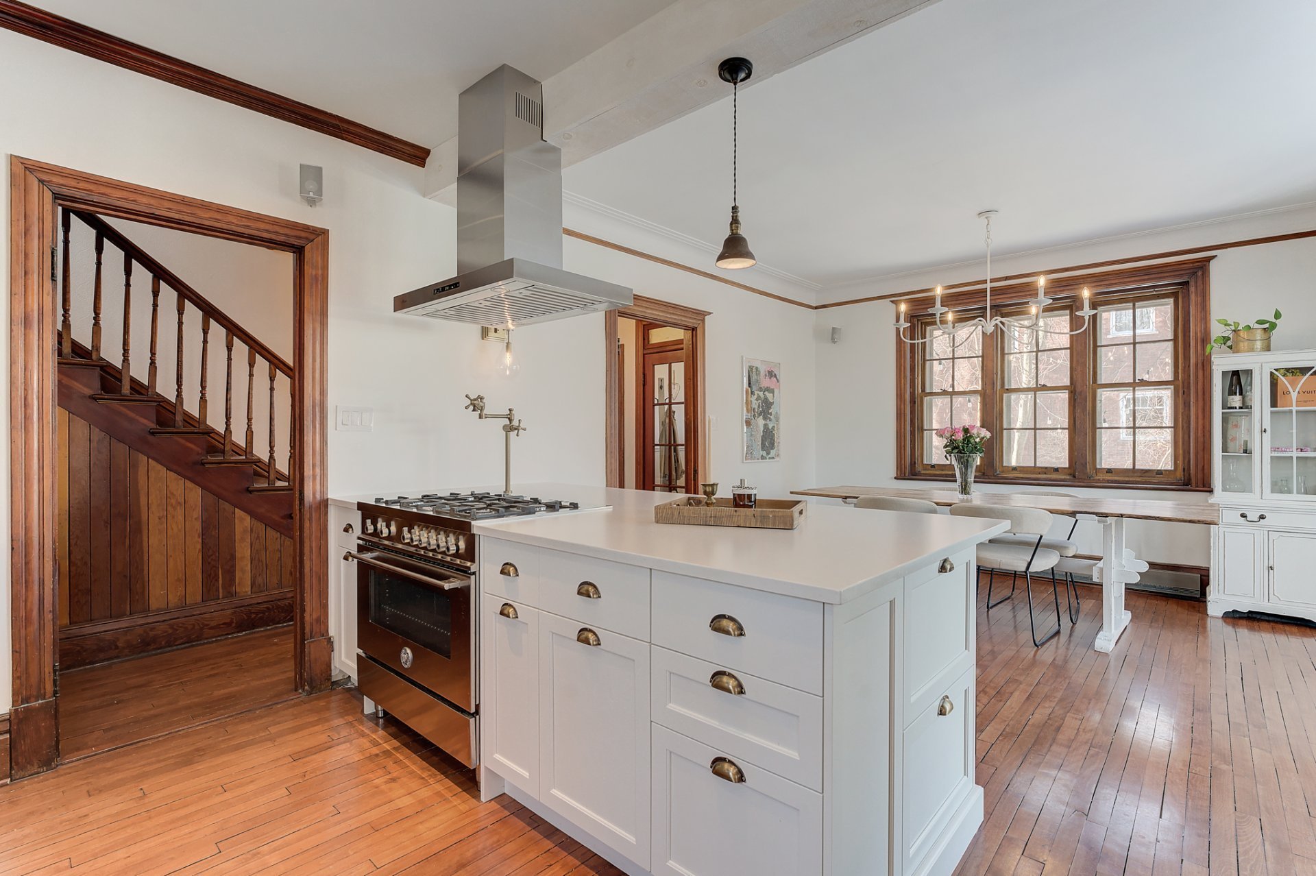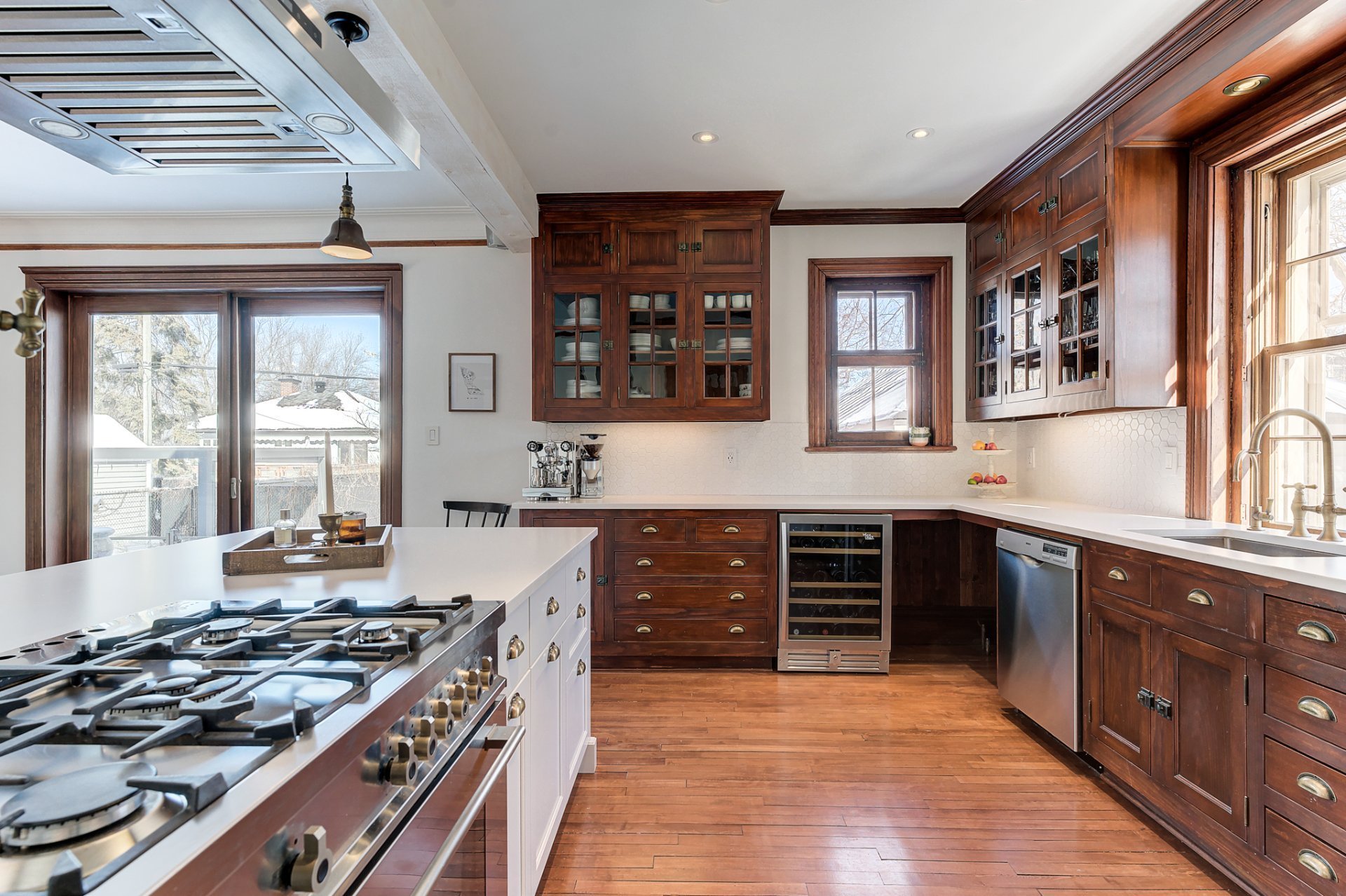 La cuisine, équipée d'un four au gaz, de comptoirs en granite et d'armoires vitrées d'époque, conjuguent à merveille le charme traditionnel et le confort moderne