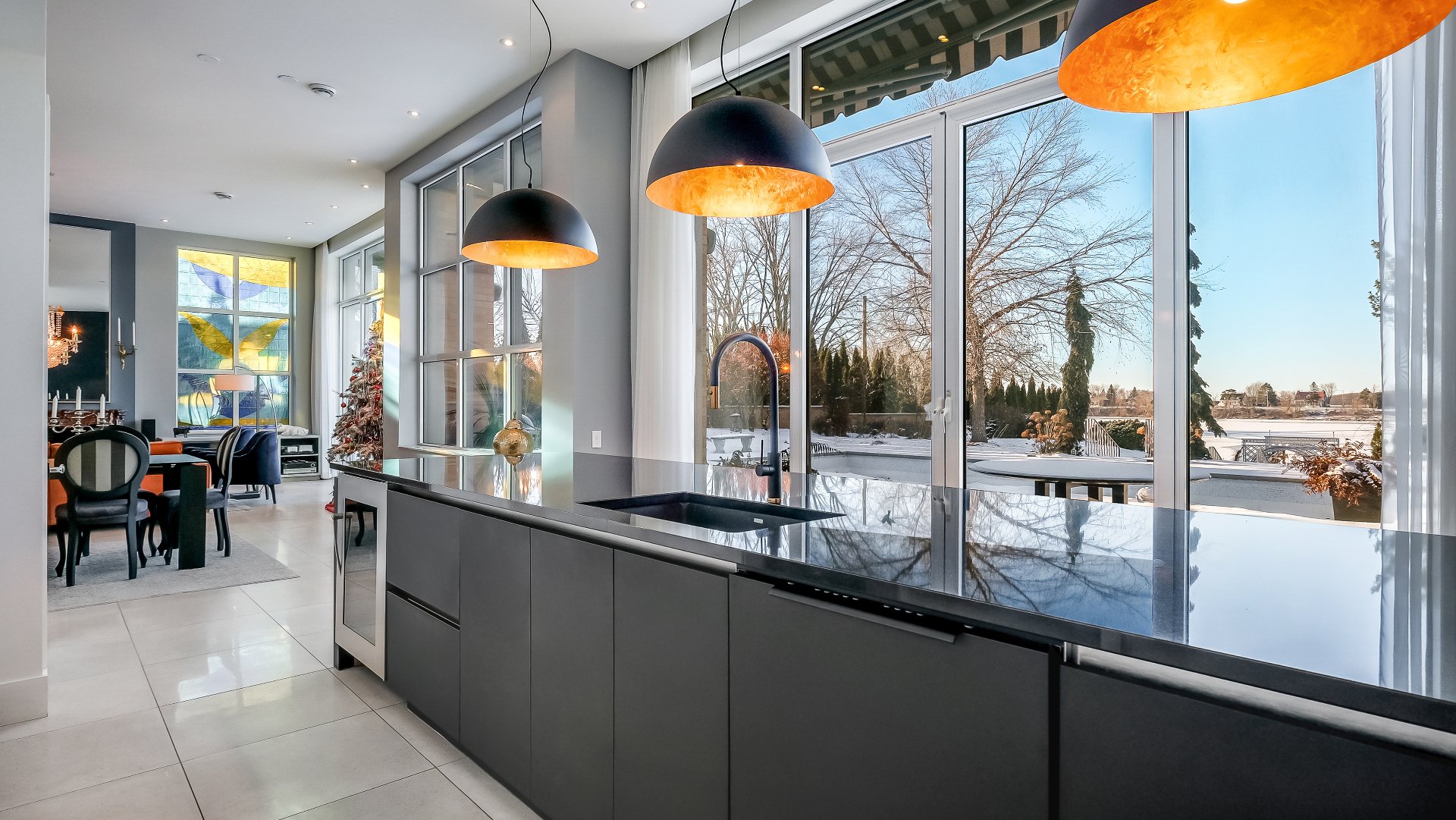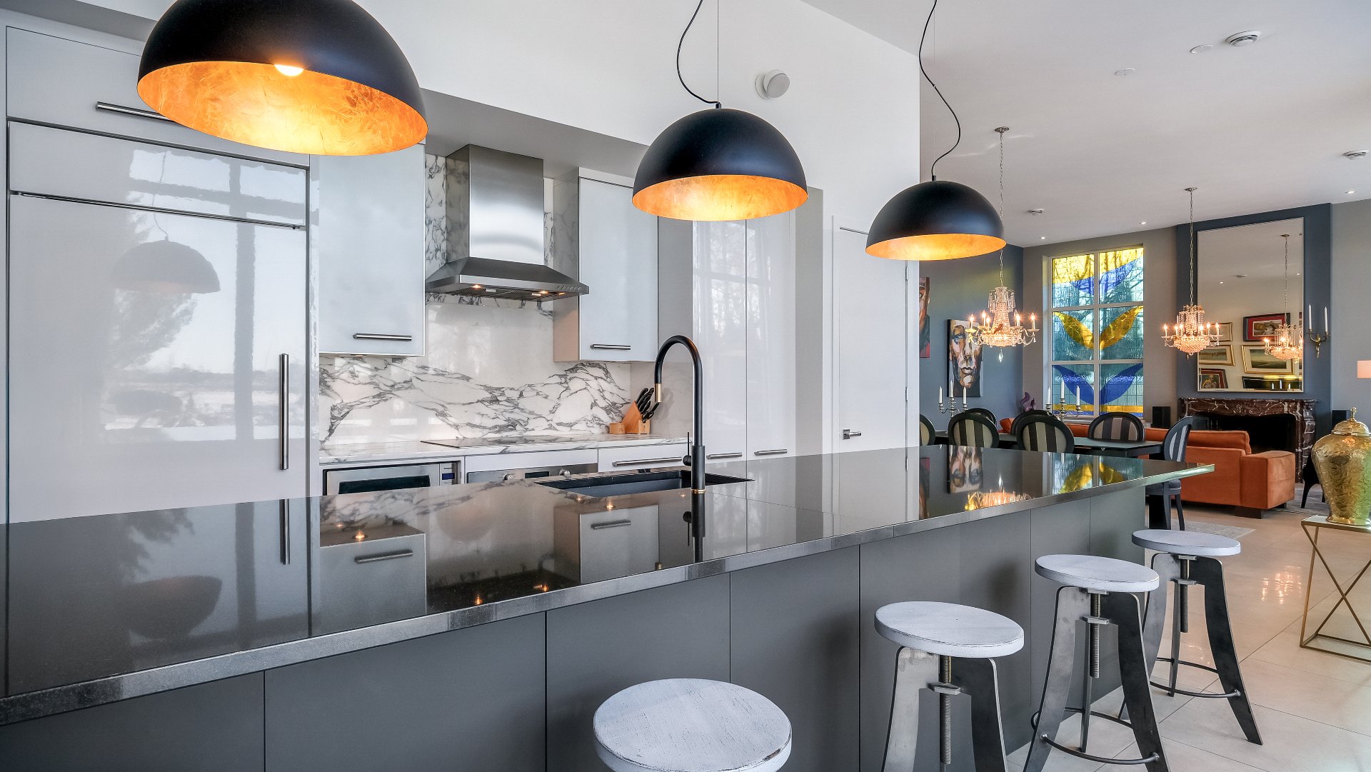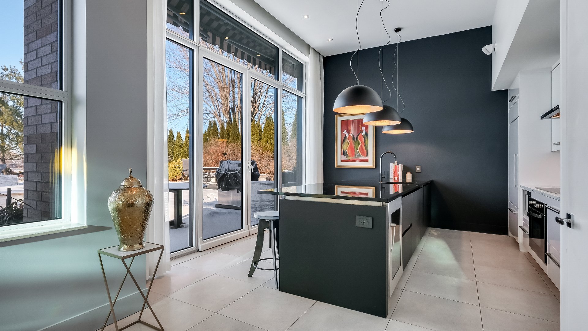 La cuisine, pensée pour les amateurs de design et de gastronomie, met en valeur un îlot de 12 pieds en quartz et un comptoir de marbre, le tout baigné de lumière grâce à la fenestration triple verre en façade.